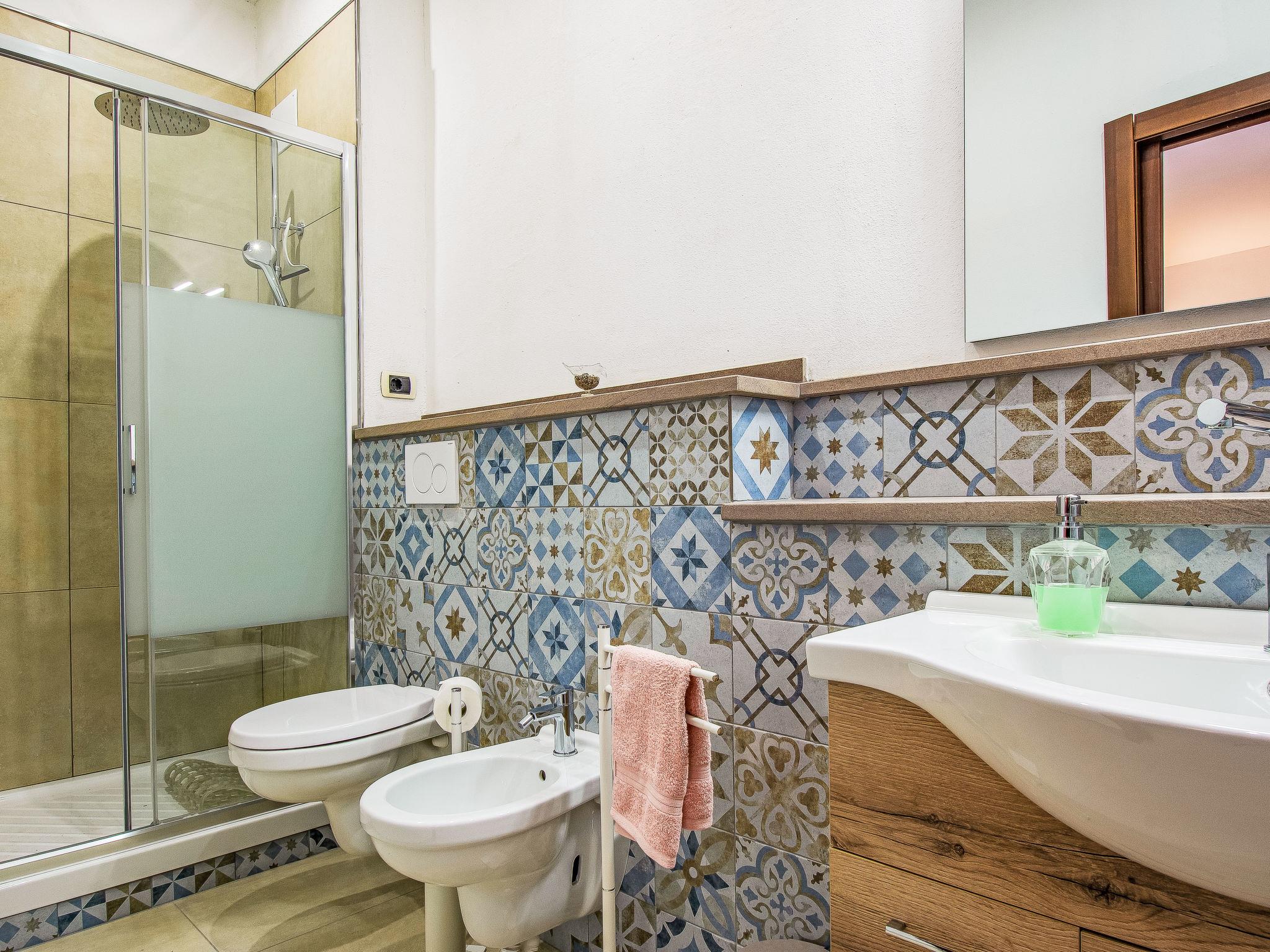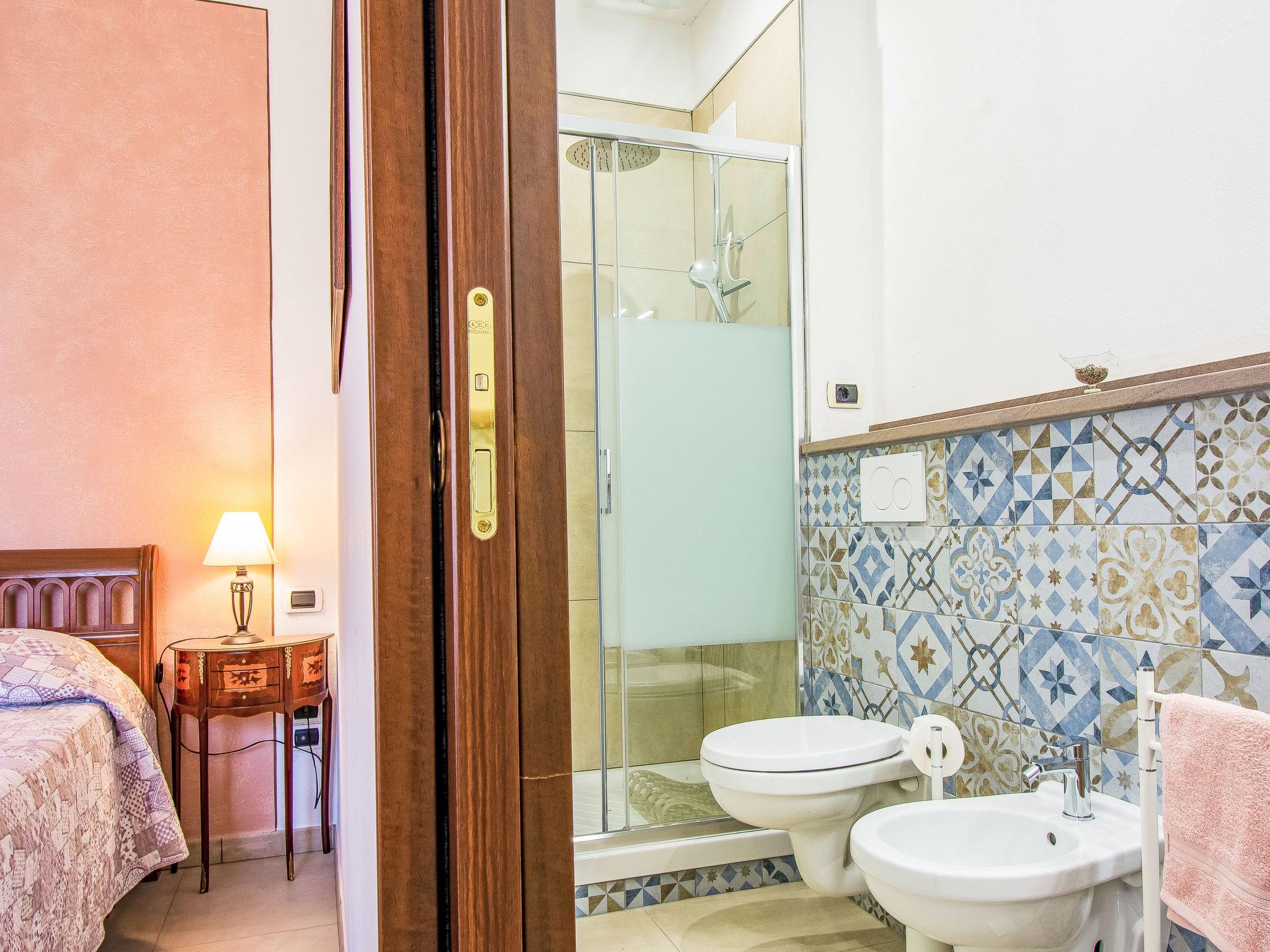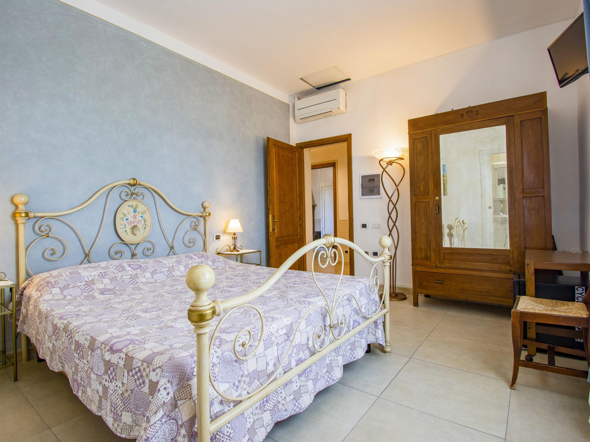 "Bianco", 4-room house 100 m2 on 1st floor. Bright, tasteful and cosy furnishings: living room with 1 sofabed, 1 double sofabed, open-hearth fireplace and shower/bidet/WC. 2 double bedrooms, each room with shower/bidet/WC. Kitchen (dishwasher, 4 induction hot plates, toaster, kettle, microwave, electric coffee machine). Exit to the terrace. Terrace furniture, deck chairs. Facilities: hair dryer. Internet (WiFi, free). Please note: maximum 1 pet/ dog allowed. Smoke alarm, fire extinguisher. IT050016B5RB47C3OT