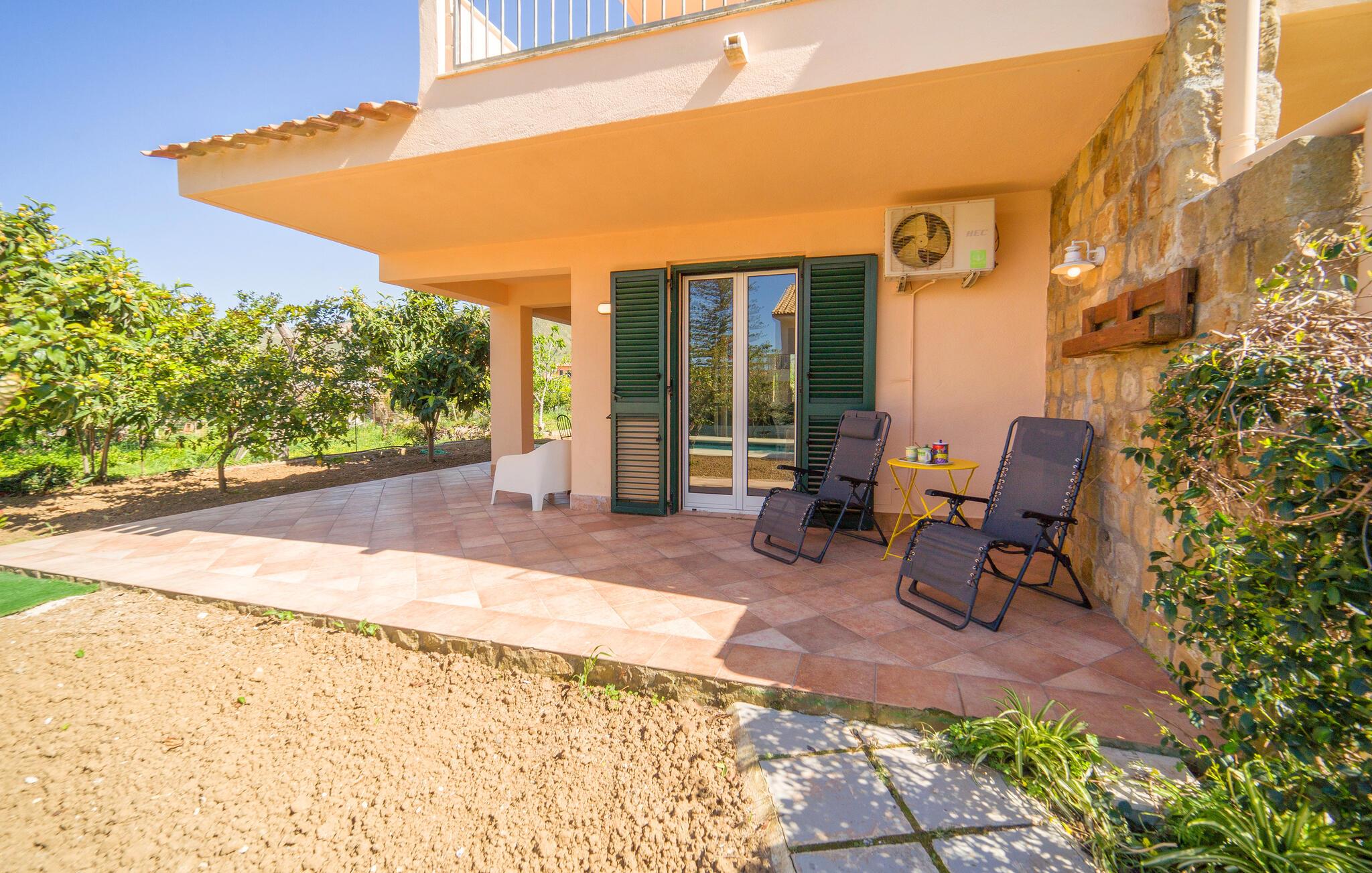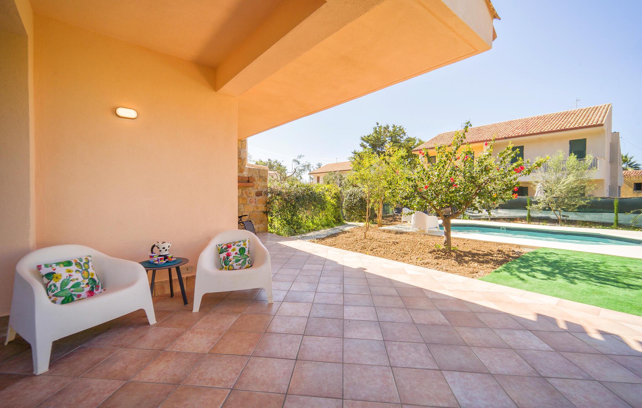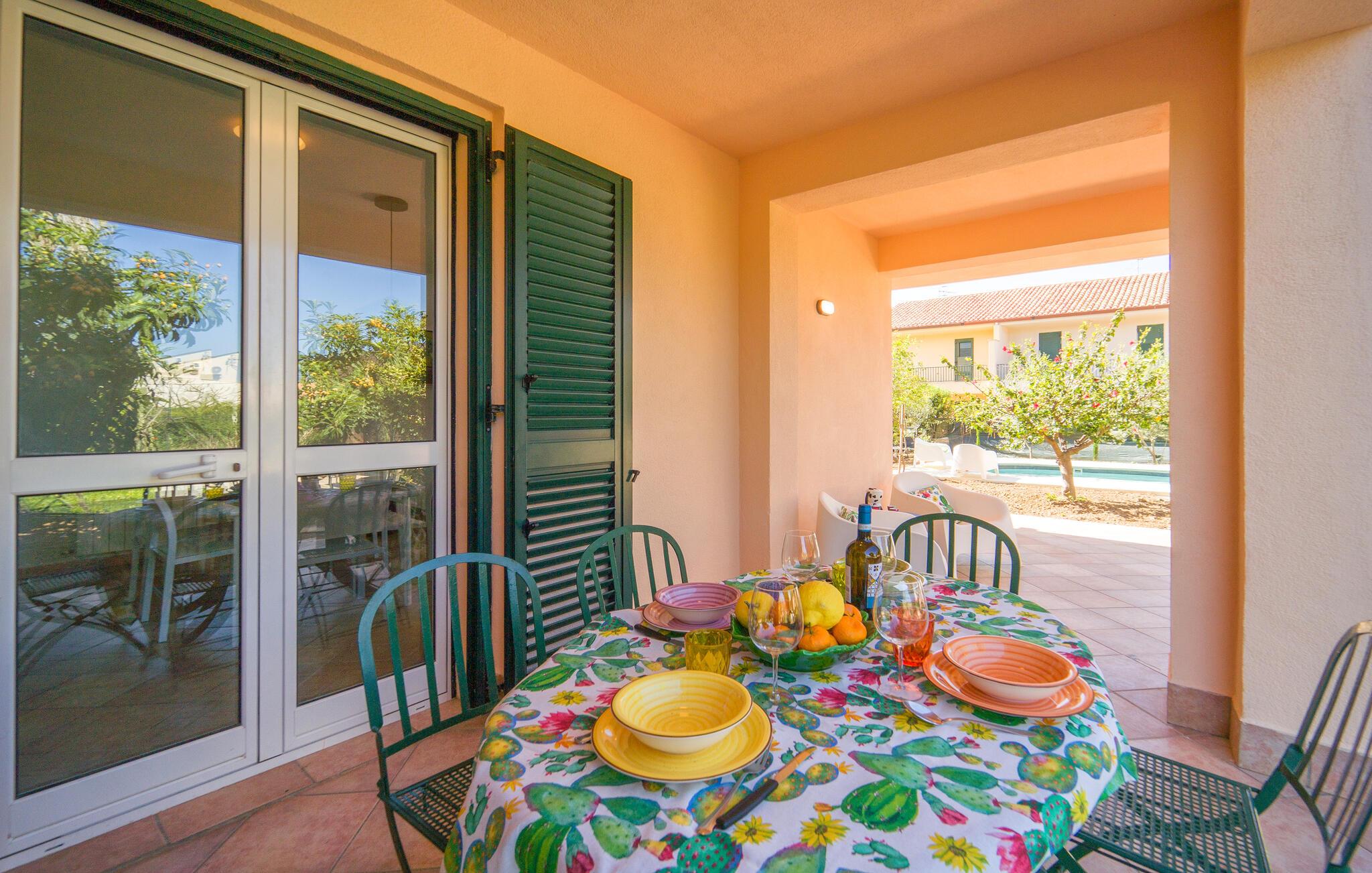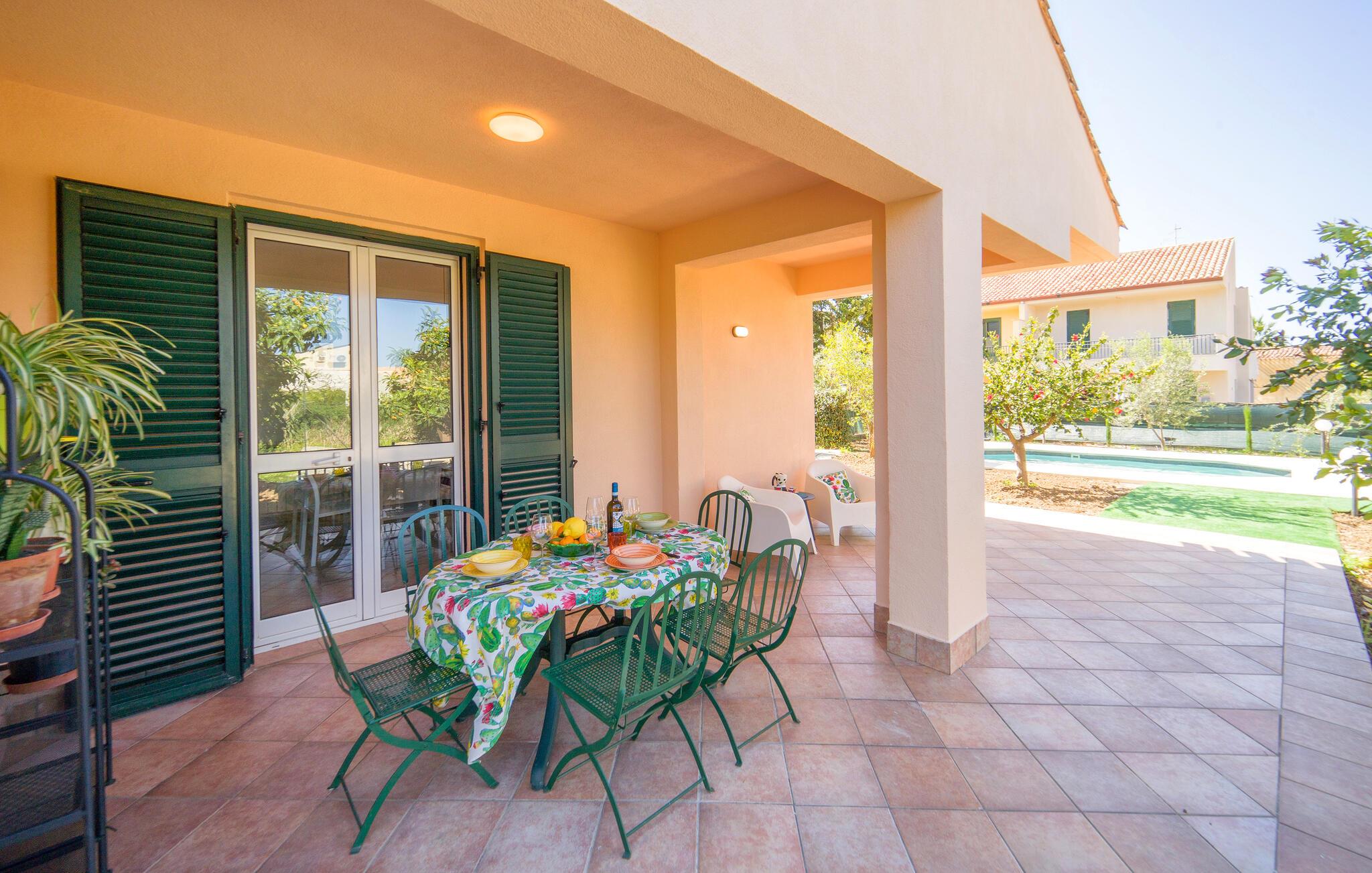 Fra opholdsrummet kan I gå direkte ud på feriehusets terrasse, snuppe et friskt dyp i poolen og slutte en skøn dag af med et måltid under åben himmel.