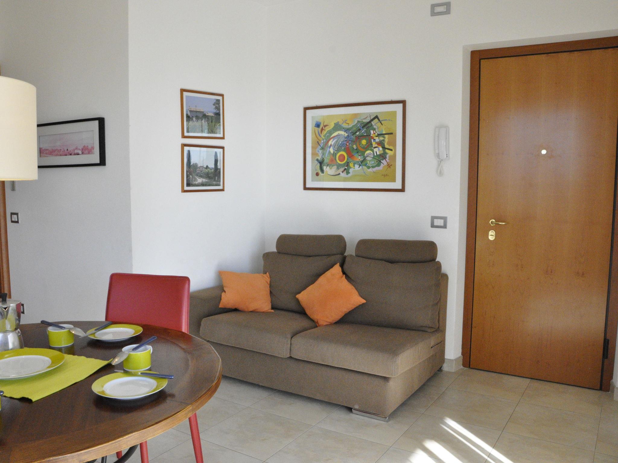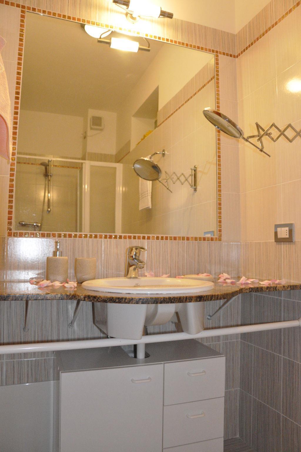3-room apartment 55 m2 on 1st floor. Bright, beautiful furnishings: living/dining room with dining table and satellite TV. Exit to the balcony. 1 double bedroom. Exit to the balcony. 1 room with 1 x 2 bunk beds, 1 pull-out bed. Exit to the balcony. Open kitchen (oven, dishwasher, 4 gas rings). Shower/bidet/WC. Gas heating (extra), air-conditioning (extra). 2 balconies. Balcony furniture. View of the swimming pool. Facilities: washing machine. Internet (WiFi, free). Garage (1 car) at the house. Please note: non-smokers only. IT023043B4GMGHSKMS