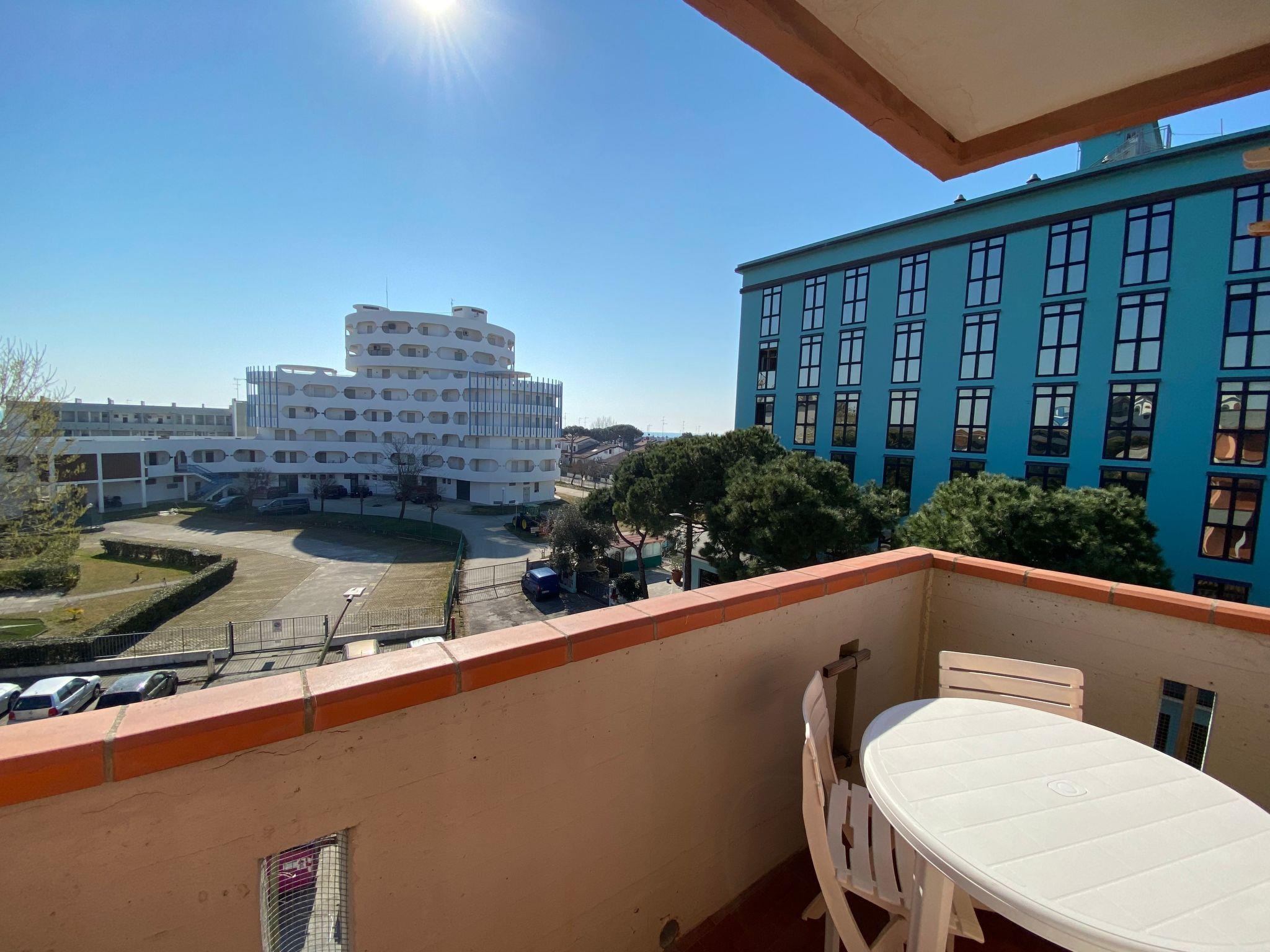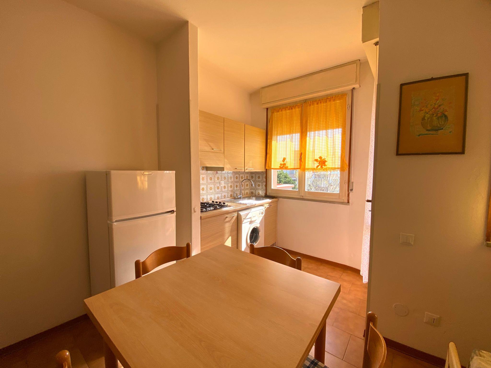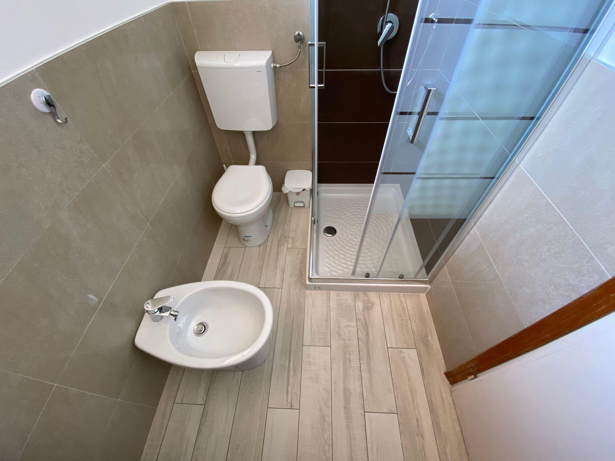 The studio apartment is on the third floor and consists of a single room with double bed, a bunk bed, kitchenette (cooker, fridge, freezer and washing machine) and bathroom with shower, toilet and bidet. Outside there is a small balcony with dining area