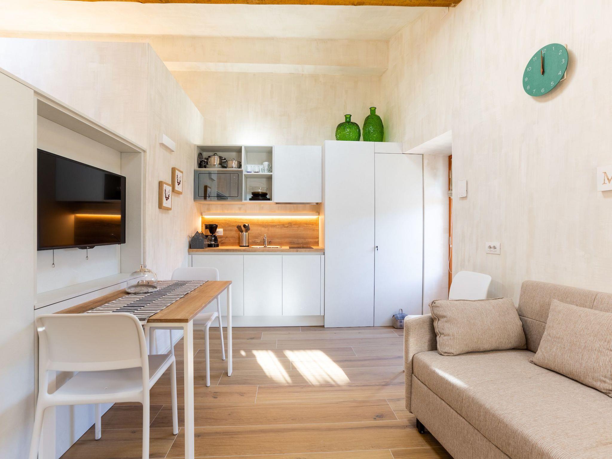 Studio flat with fully equipped kitchen, living area with satellite TV and sofa, double bed and adjacent bathroom complete with toilet, bidet and shower. There is air conditioning throughout the room as well as underfloor heating.