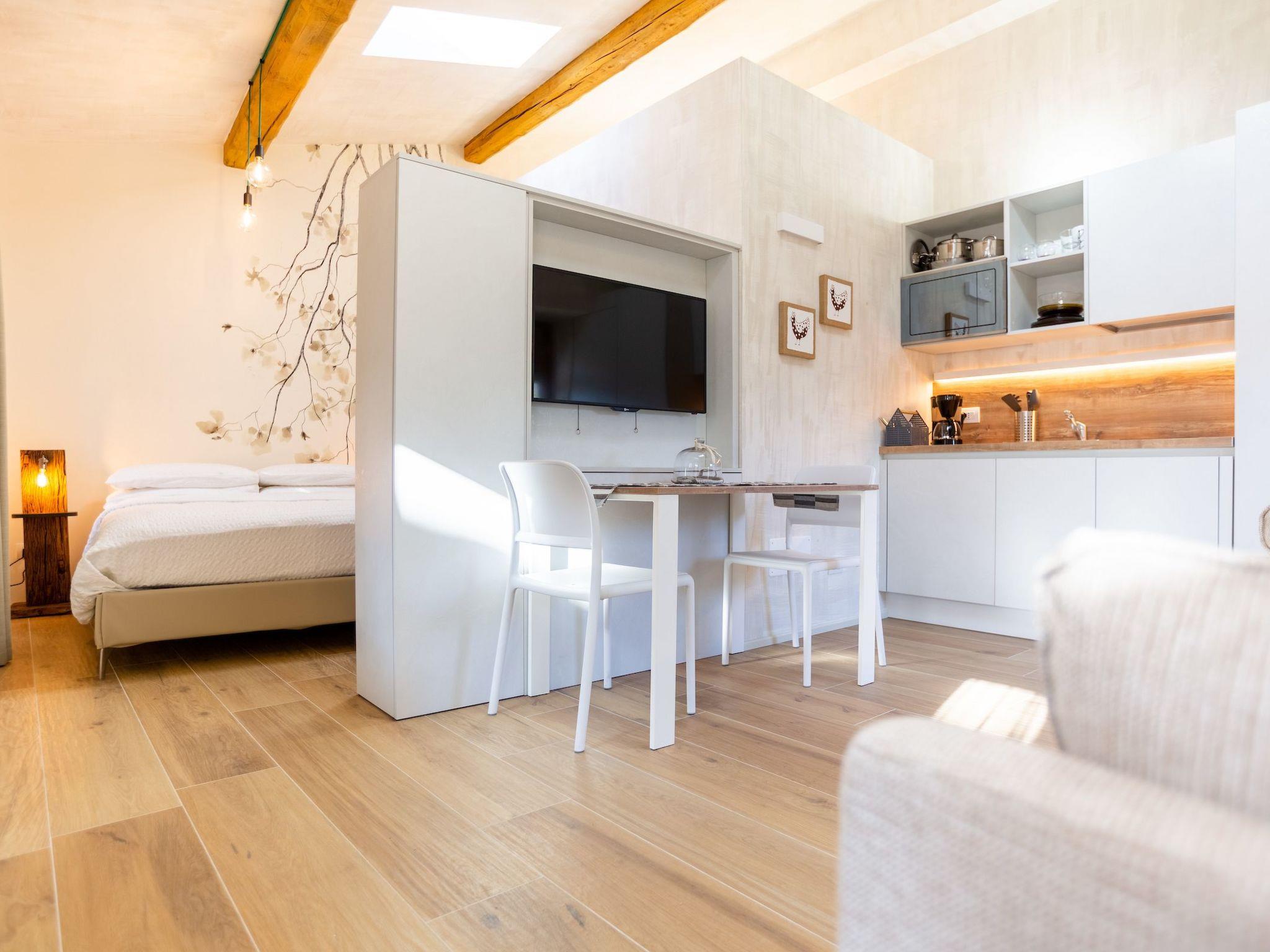 In the historic centre of the small village of Voltino, the ancient Borgo Cantagallo is reborn. Five beautifully restored houses that preserve intact the charm of the past, of living slowly and in contact with nature. Wood, exposed stone, quiet little streets, and all around the meadows and woods. A few steps from the Borgo is the splendid olive grove where the view of Lake Garda and the sunrise from above complete the magic. The restoration is respectful of the ancient architecture and traditions, but attentive to the needs of modern living. Casa Olivia is a house consisting of two studio flats on two floors, perfect for couples. Attention to detail, refined furnishings, comfort and services available to our guests make Borgo Cantagallo an exclusive place. The sun brightens Borgo Cantagallo from sunrise to sunset. The lake in the valley attracts sports enthusiasts and water lovers. But if you are looking for peace and quiet, this is the perfect place to forget the clock and relax in silence.