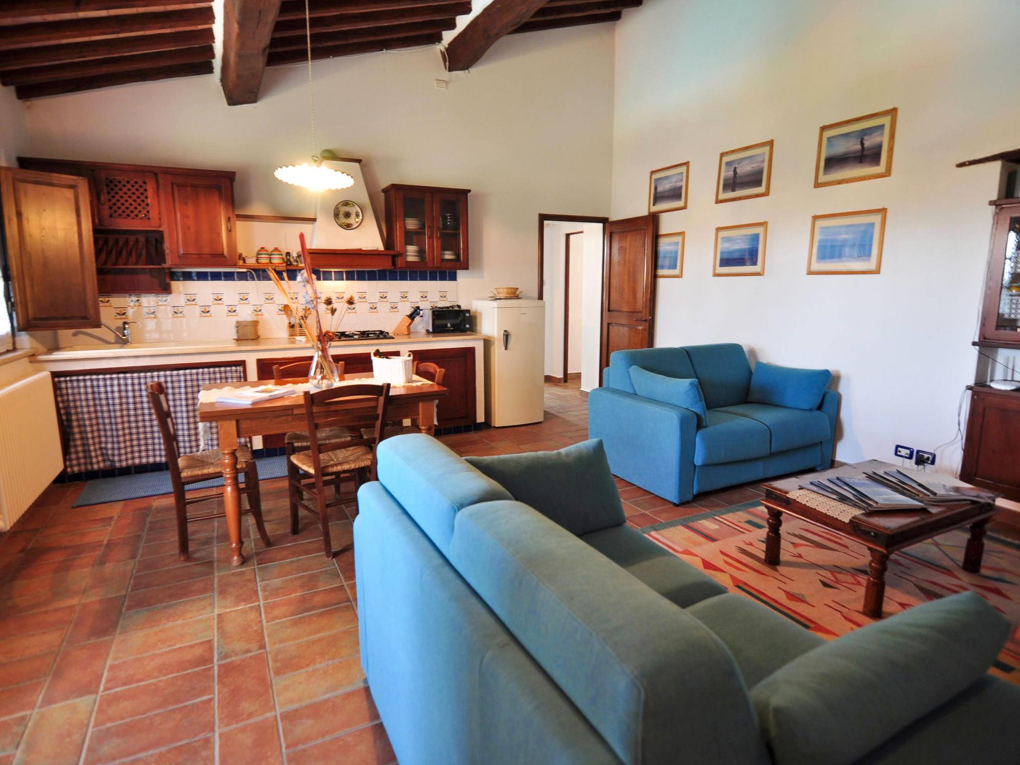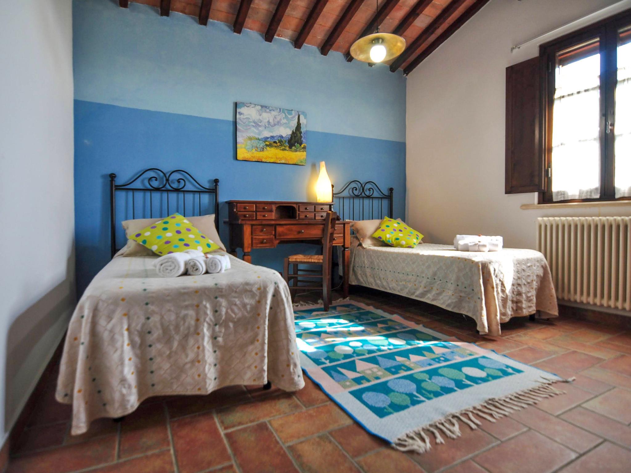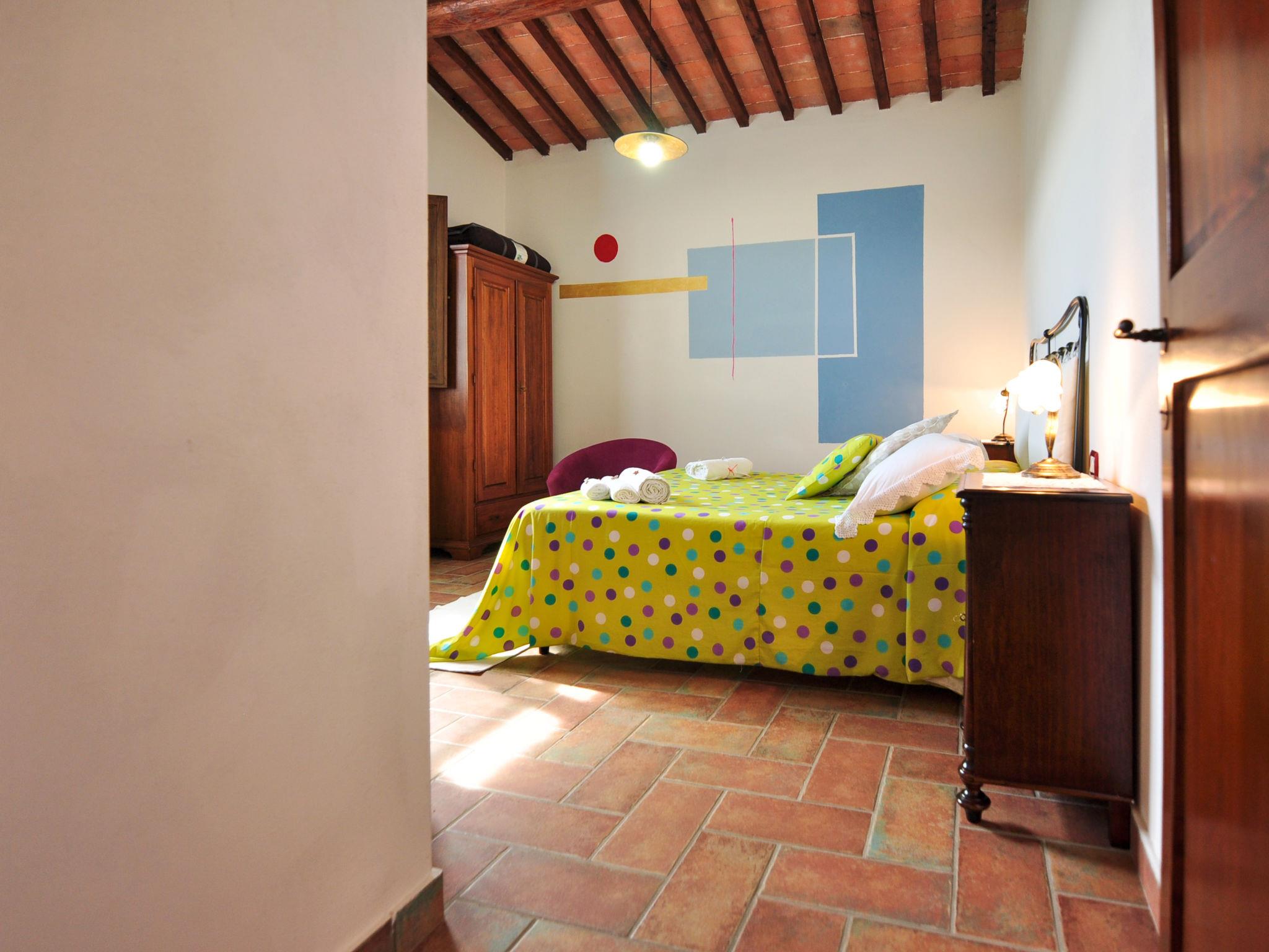 Very beautiful country house "Linearis", detached, surrounded by trees, fields and vineyards. 9 apartments in the residence. In the district of Linari 3 km from the centre of Poggibonsi, 6 km from the centre of Barberino Val d'Elsa, 15 km from the centre of San Gimignano, in a secluded, sunny, elevated position, 82 km from the sea, in the countryside. For shared use: beautiful, well-kept garden 10'000 m2 (fenced) with plants and trees, meadow, swimming pool fenced (14 x 7 m, depth 165 cm, seasonal availability: 01.Apr. - 05.Nov.). Outdoor shower, poolhouse with shower and WC, terrace, garden furniture, barbecue, children's playground, pool maintenance by the owner/gardener. In the complex: reception, lounge, washing machine (extra), tumble dryer (for shared use, extra). House maid on request (extra). 100 m footpath to the house. Parking on the premises, communal covered parking (extra). Grocery 2 km, supermarket 3 km, restaurant 2 km, bakery 2 km, bus stop 3 km, railway station "Poggibonsi" 3 km, sandy beach "Cecina Mare" 72 km, indoor swimming pool 3 km. Nearby attractions: Siena 36 km, Firenze 46 km, Volterra 38 km, Pisa 90 km. Please note: reception open 09:00-13:00 hrs. Suitable for families, baby equipment (included). Local sale of farm products. Please note: Loading and unloading of baggage is possible at the holiday house. Residence with electric gates. The owner lives in the same residence. All houses/apartments are individually designed/furnished. Obligation to wear bathing caps.