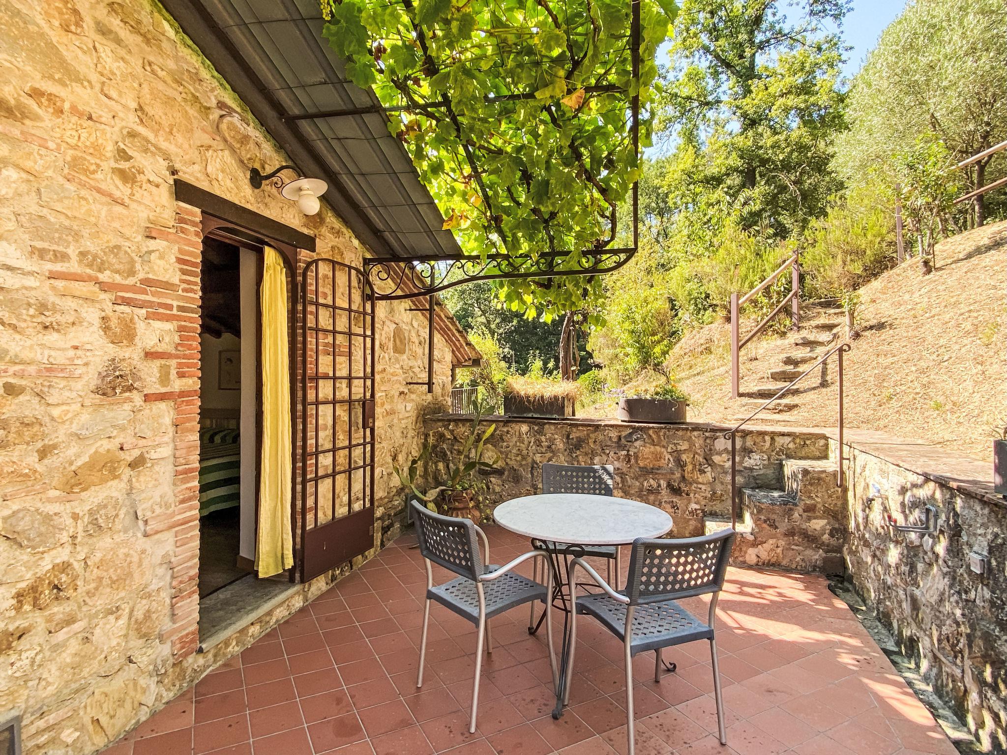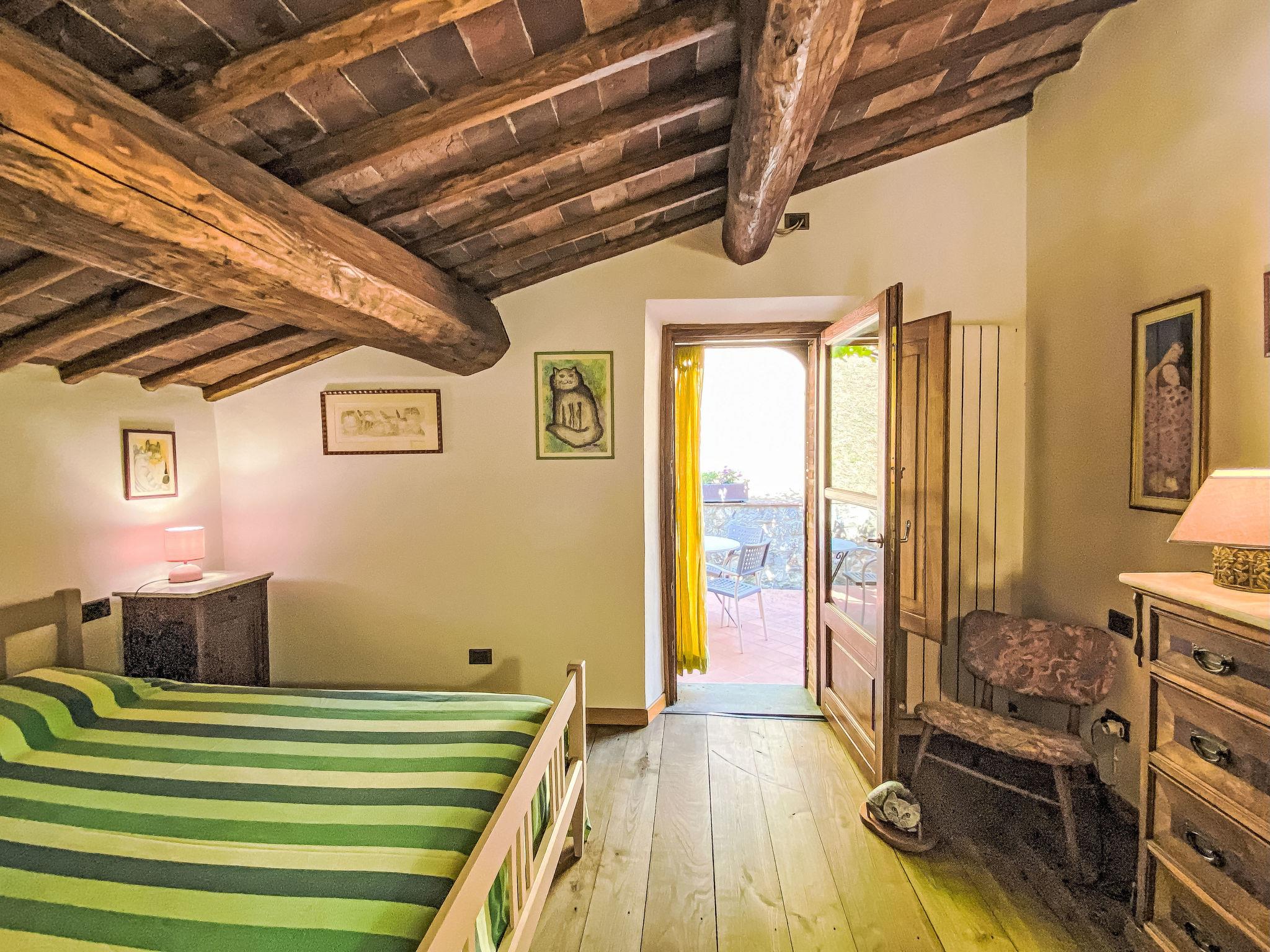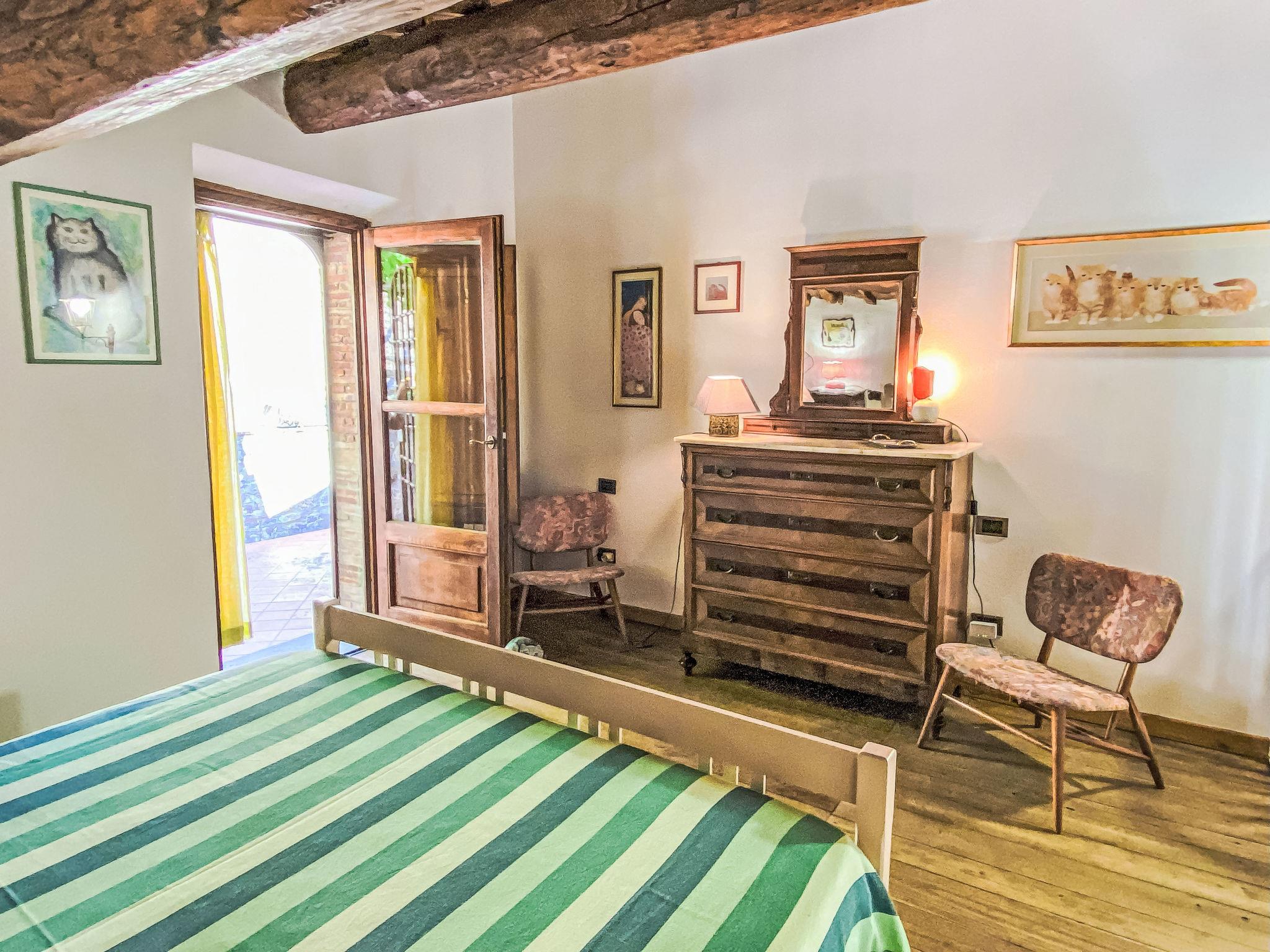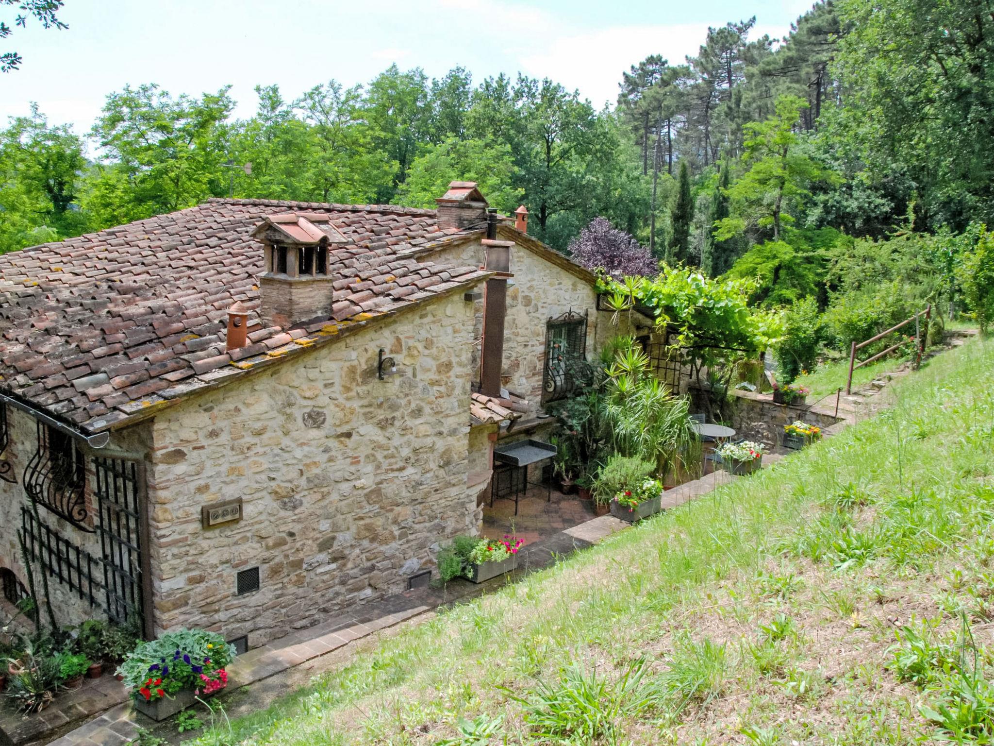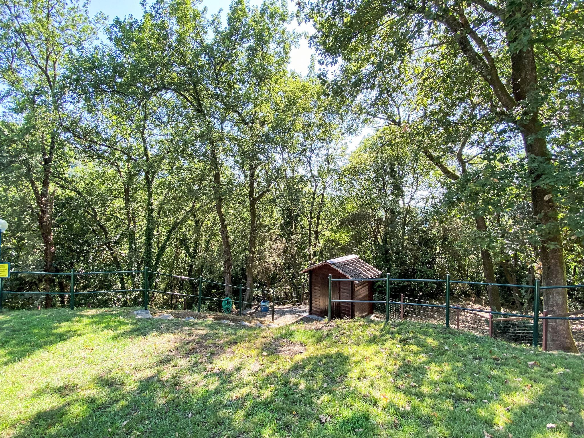 2-room house 55 m2 on 2 levels, on the ground floor. Rustic and tasteful furnishings: living/sleeping room with 1 double sofabed and satellite TV. Exit to the terrace. Open kitchen (oven, Gas stove, 4 gas rings, toaster, kettle, freezer, electric coffee machine) with dining table. Exit to the terrace. Shower/bidet/WC. Gas heating. Upper floor: (spiral staircase) gallery pergola with sloping ceilings with 1 double bed. Exit pergola. Terrace furniture, barbecue, deck chairs (2). Beautiful view of the garden and the forest. Facilities: washing machine. Internet (WiFi, free). Parking. Please note: maximum 1 pet/ dog allowed. Private entrance, fire extinguisher. The pool mentioned in the description is for private use. IT046017C2BBXJFG8T