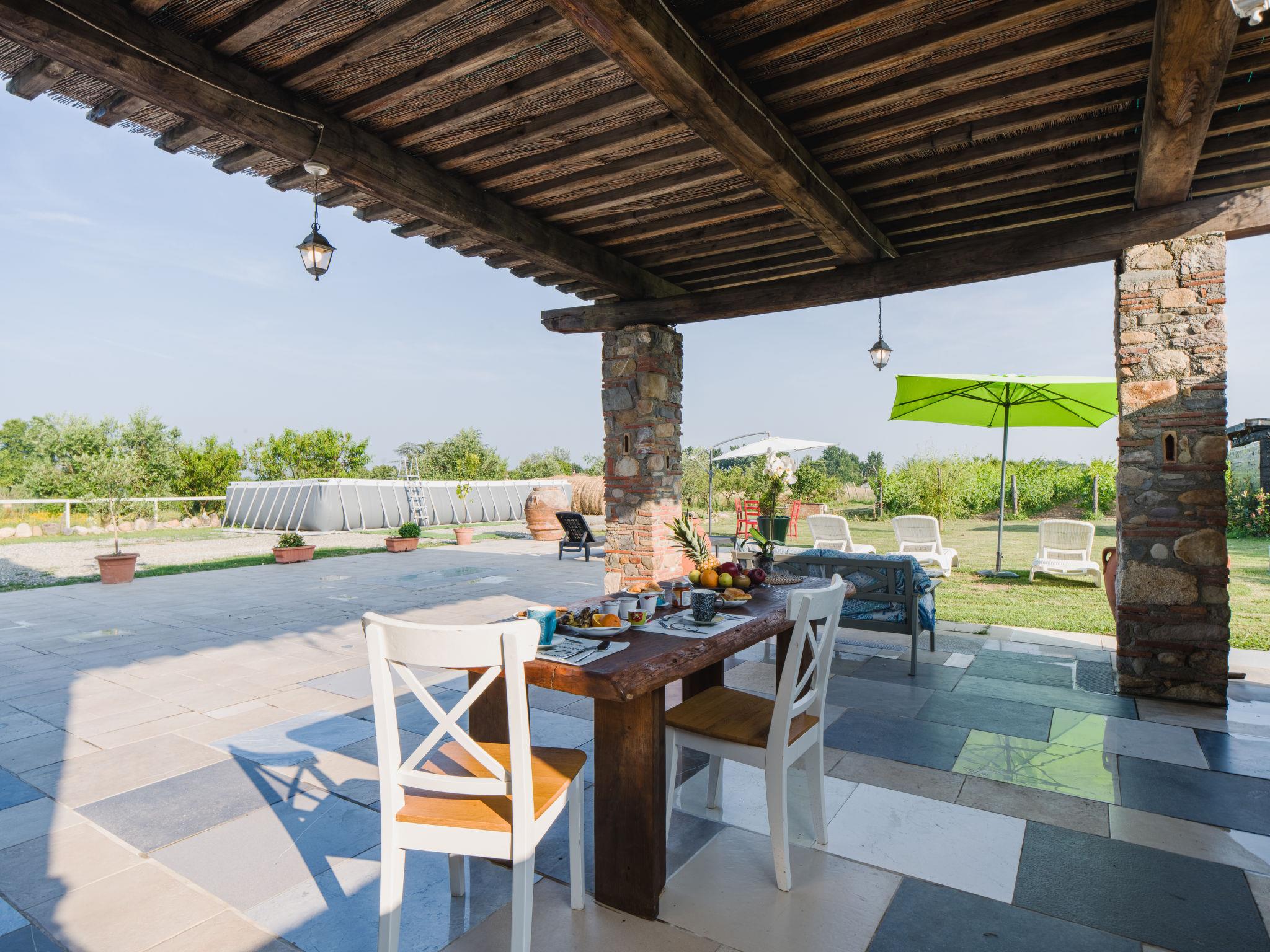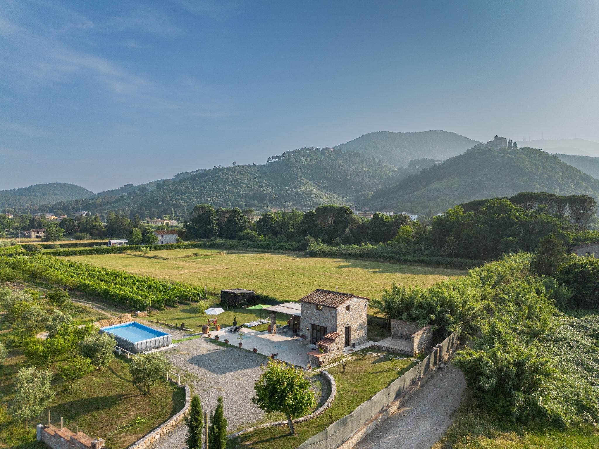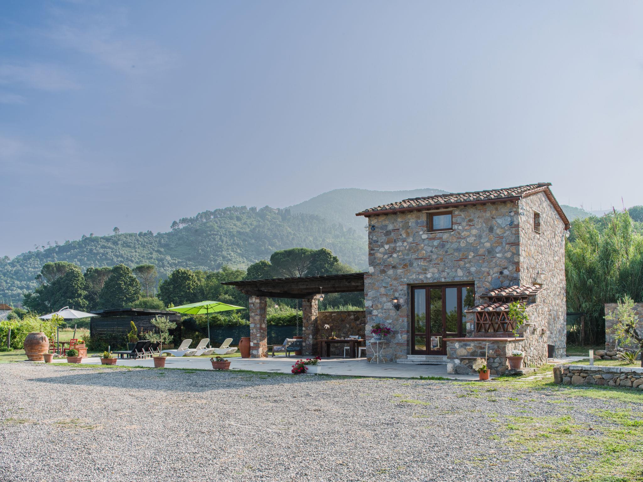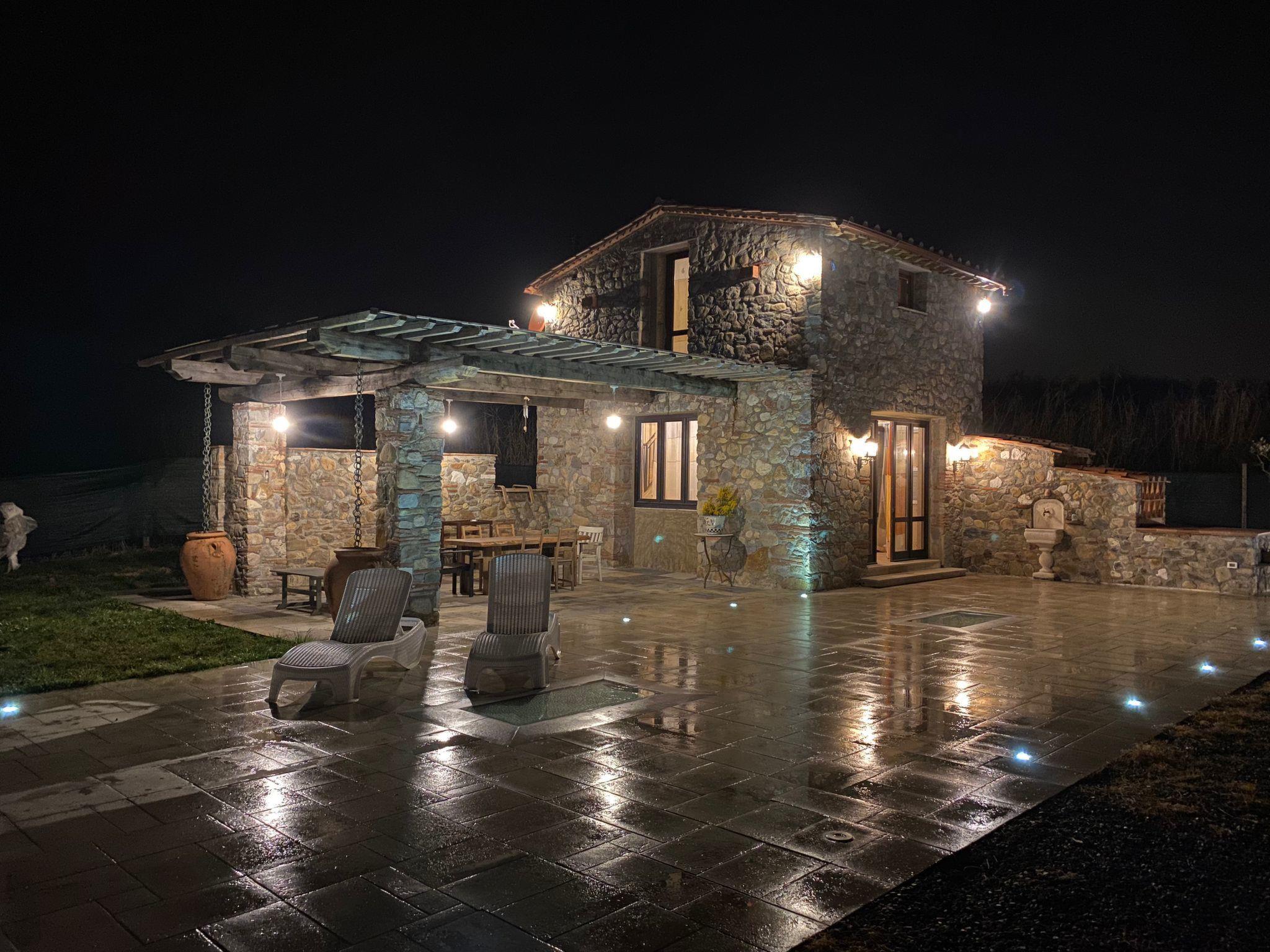 Rustic house "I Sei Filari", built in 2022. 1.5 km from the centre of Castelvecchio di Compito, 17 km from the centre of Lucca, 28 km from the centre of Pisa, 40 km from the sea. Private: property 1'000 m2 (fenced), garden 500 m2 (fenced) with wildlife garden, meadow, swimming pool (above ground) (6 x 8 m, depth 110 - 110 cm, seasonal availability: 04.May. - 04.Oct.). Outdoor shower, terrace (150 m2), garden furniture. In the house: sauna (extra). Hot tub (extra). Relaxation room, spa area (extra). Cook on request (extra). 950 m long motor access (via unmade road). Parking on the premises. Shop 1.4 km, supermarket 6 km, bus stop 800 m, sandy beach 40 km. Nearby attractions: Collodi (Pinocchio Park) 23 km, Montecatini Terme 27 km, San Giuliano Terme 23 km, Firenze 70 km, Viareggio 41 km, Riomaggiore (5 Terre) 101 km. Well-known lakes can easily be reached: Lago di Massaciuccoli 41 km, Torre del Lago 43 km. Hiking paths: Levigliani Antro del Corchia Park 67 km. Please note: car recommended. In the basement with separate external entrance via a staircase large SPA of 200 sqm (extra charge) with swimming pool with counter-current swimming with hydromassage, sauna and relaxation room with chromotherapy and fireplace. Passage from above in total privacy bottles and dinners (extra charge).