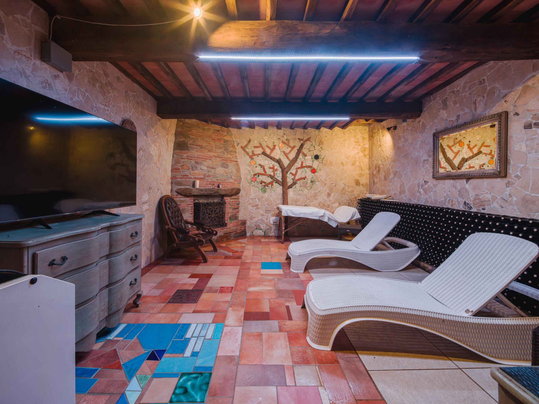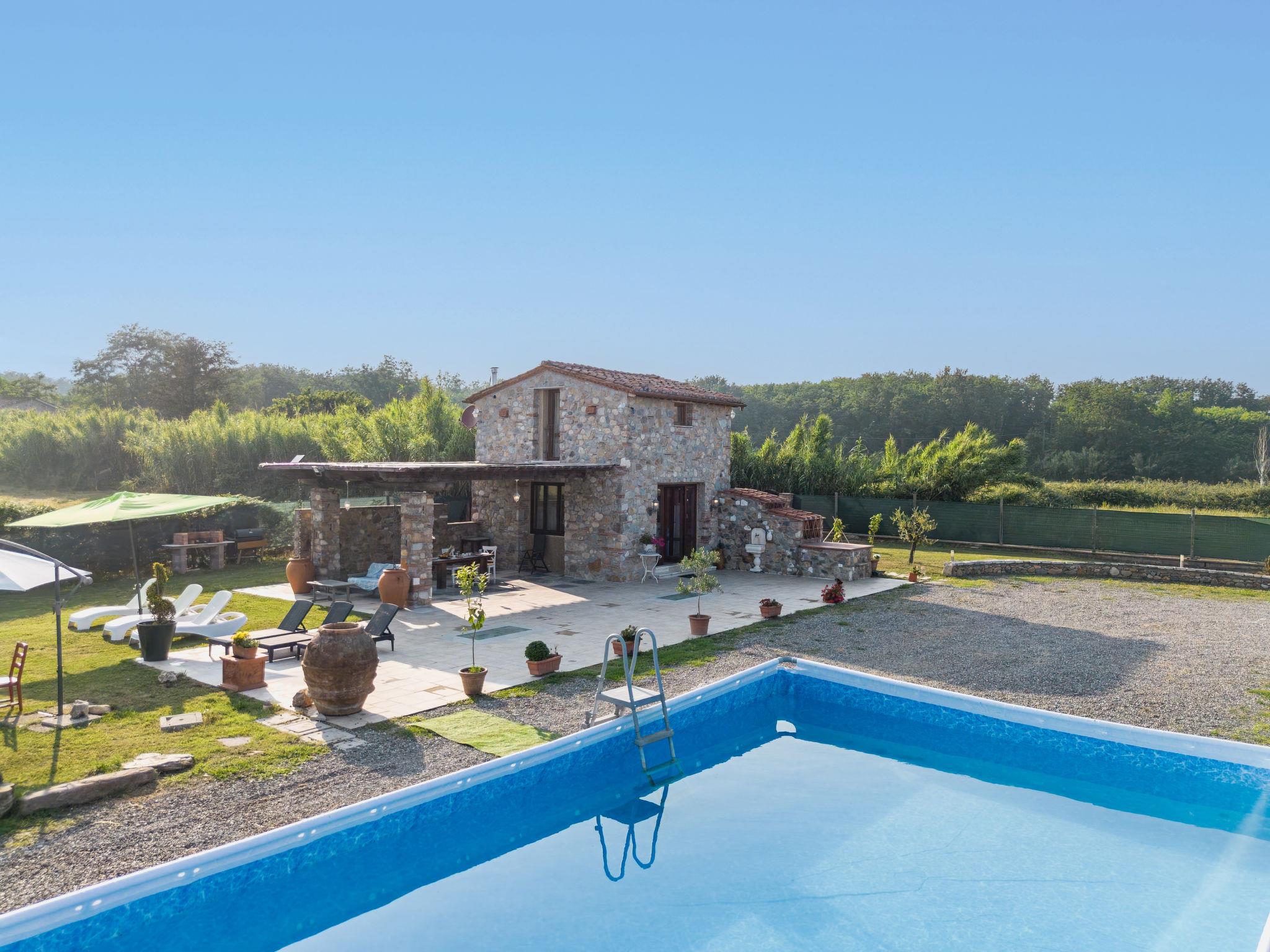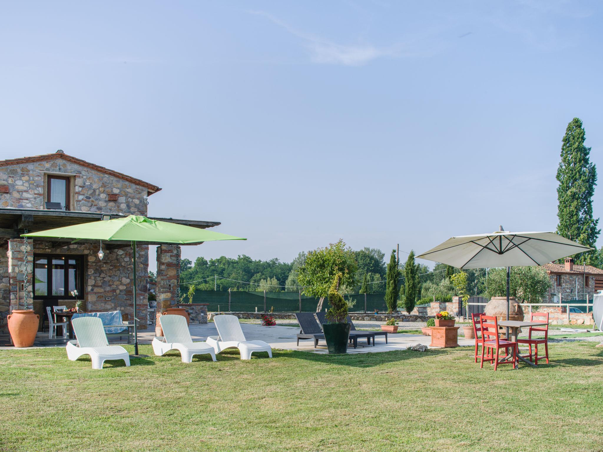 Rustic house "I Sei Filari", built in 2022. 1.5 km from the centre of Castelvecchio di Compito, 17 km from the centre of Lucca, 28 km from the centre of Pisa, 40 km from the sea. Private: property 1'000 m2 (fenced), garden 500 m2 (fenced) with wildlife garden, meadow, swimming pool (above ground) (6 x 8 m, depth 110 - 110 cm, seasonal availability: 04.May. - 04.Oct.). Outdoor shower, terrace (150 m2), garden furniture. In the house: sauna (extra). Hot tub (extra). Relaxation room, spa area (extra). Cook on request (extra). 950 m long motor access (via unmade road). Parking on the premises. Shop 1.4 km, supermarket 6 km, bus stop 800 m, sandy beach 40 km. Nearby attractions: Collodi (Pinocchio Park) 23 km, Montecatini Terme 27 km, San Giuliano Terme 23 km, Firenze 70 km, Viareggio 41 km, Riomaggiore (5 Terre) 101 km. Well-known lakes can easily be reached: Lago di Massaciuccoli 41 km, Torre del Lago 43 km. Hiking paths: Levigliani Antro del Corchia Park 67 km. Please note: car recommended. In the basement with separate external entrance via a staircase large SPA of 200 sqm (extra charge) with swimming pool with counter-current swimming with hydromassage, sauna and relaxation room with chromotherapy and fireplace. Passage from above in total privacy bottles and dinners (extra charge).