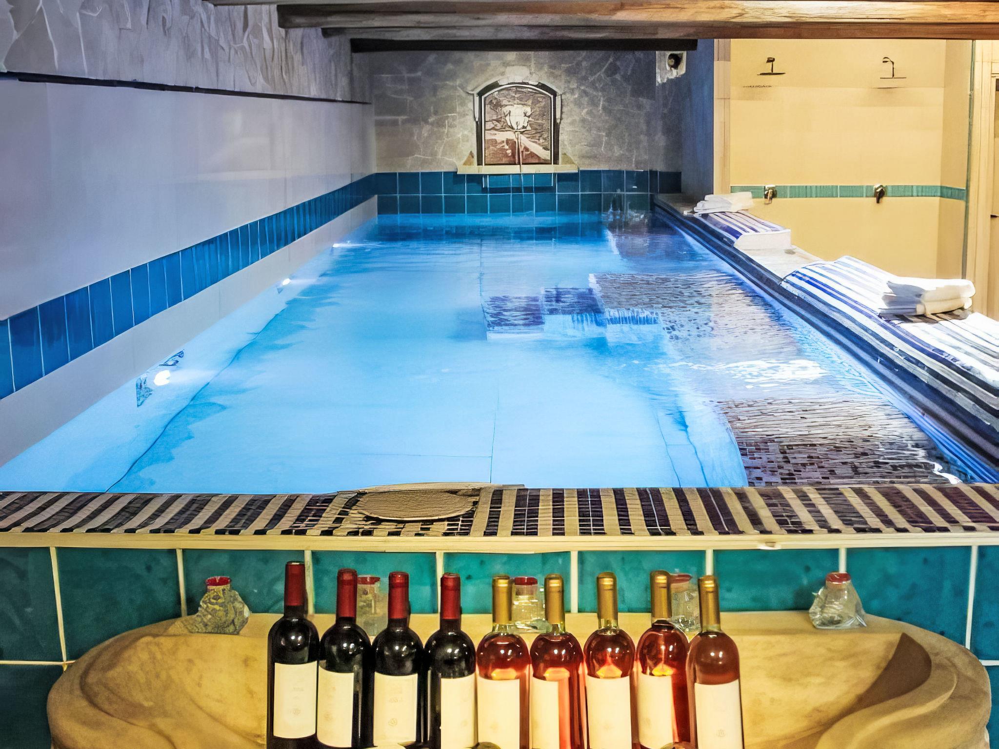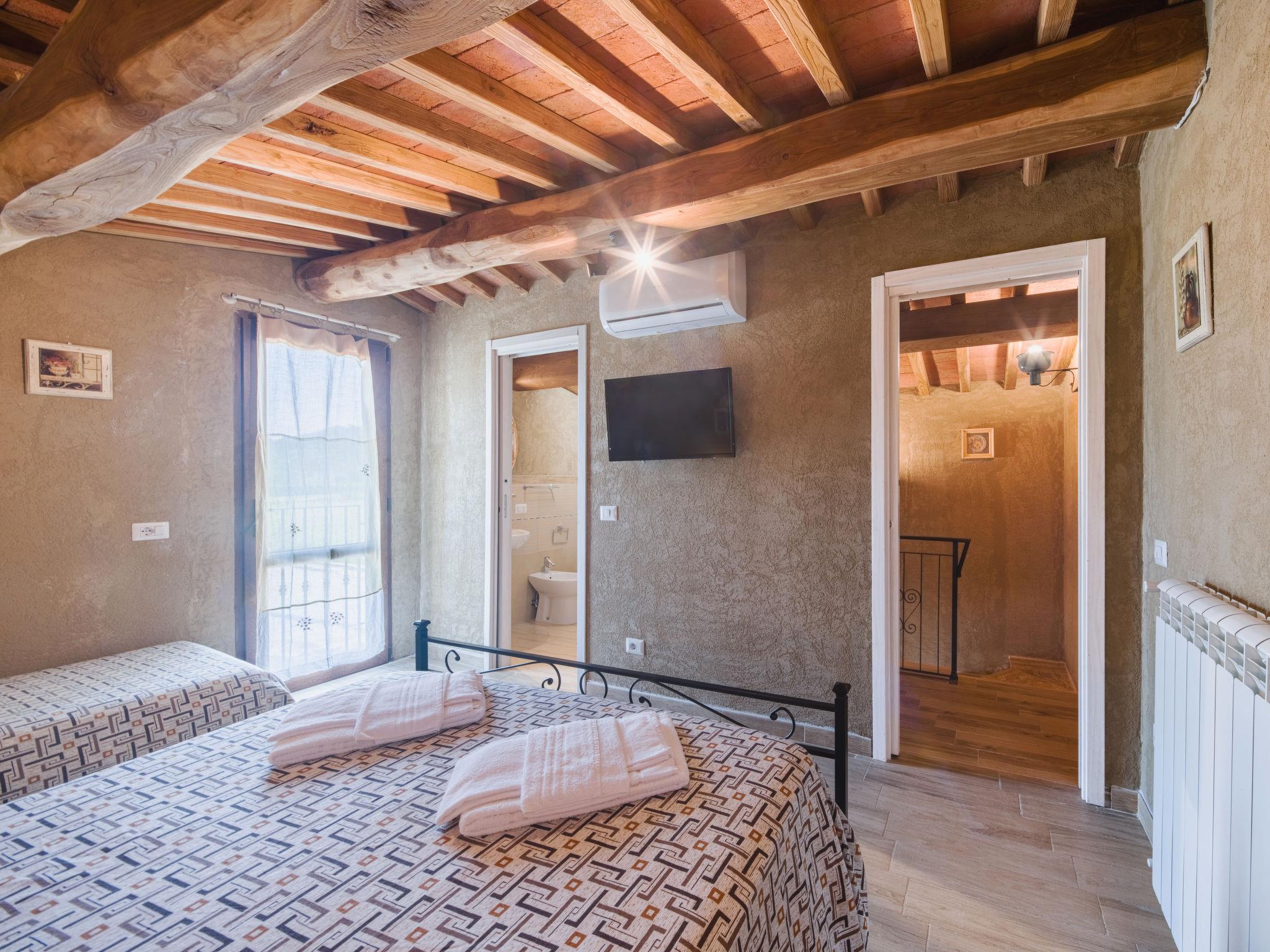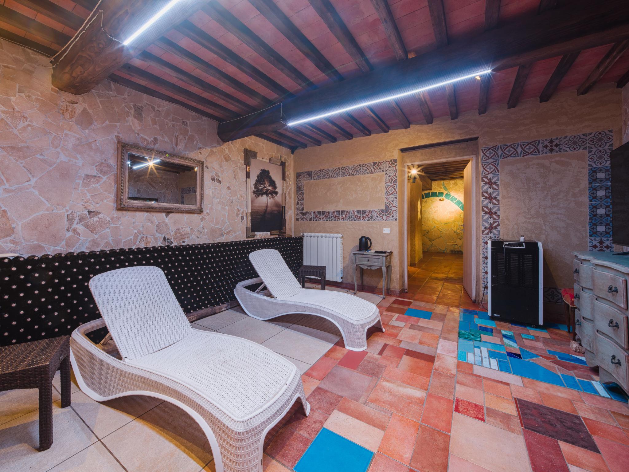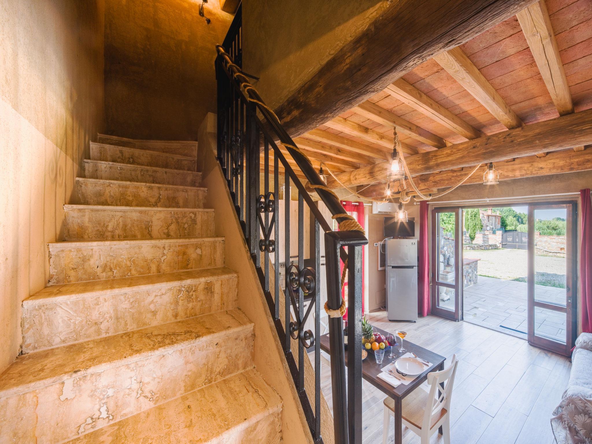 Rustic house "I Sei Filari", built in 2022. 1.5 km from the centre of Castelvecchio di Compito, 17 km from the centre of Lucca, 28 km from the centre of Pisa, 40 km from the sea. Private: property 1'000 m2 (fenced), garden 500 m2 (fenced) with wildlife garden, meadow, swimming pool (above ground) (6 x 8 m, depth 110 - 110 cm, seasonal availability: 04.May. - 04.Oct.). Outdoor shower, terrace (150 m2), garden furniture. In the house: sauna (extra). Hot tub (extra). Relaxation room, spa area (extra). Cook on request (extra). 950 m long motor access (via unmade road). Parking on the premises. Shop 1.4 km, supermarket 6 km, bus stop 800 m, sandy beach 40 km. Nearby attractions: Collodi (Pinocchio Park) 23 km, Montecatini Terme 27 km, San Giuliano Terme 23 km, Firenze 70 km, Viareggio 41 km, Riomaggiore (5 Terre) 101 km. Well-known lakes can easily be reached: Lago di Massaciuccoli 41 km, Torre del Lago 43 km. Hiking paths: Levigliani Antro del Corchia Park 67 km. Please note: car recommended. In the basement with separate external entrance via a staircase large SPA of 200 sqm (extra charge) with swimming pool with counter-current swimming with hydromassage, sauna and relaxation room with chromotherapy and fireplace. Passage from above in total privacy bottles and dinners (extra charge).