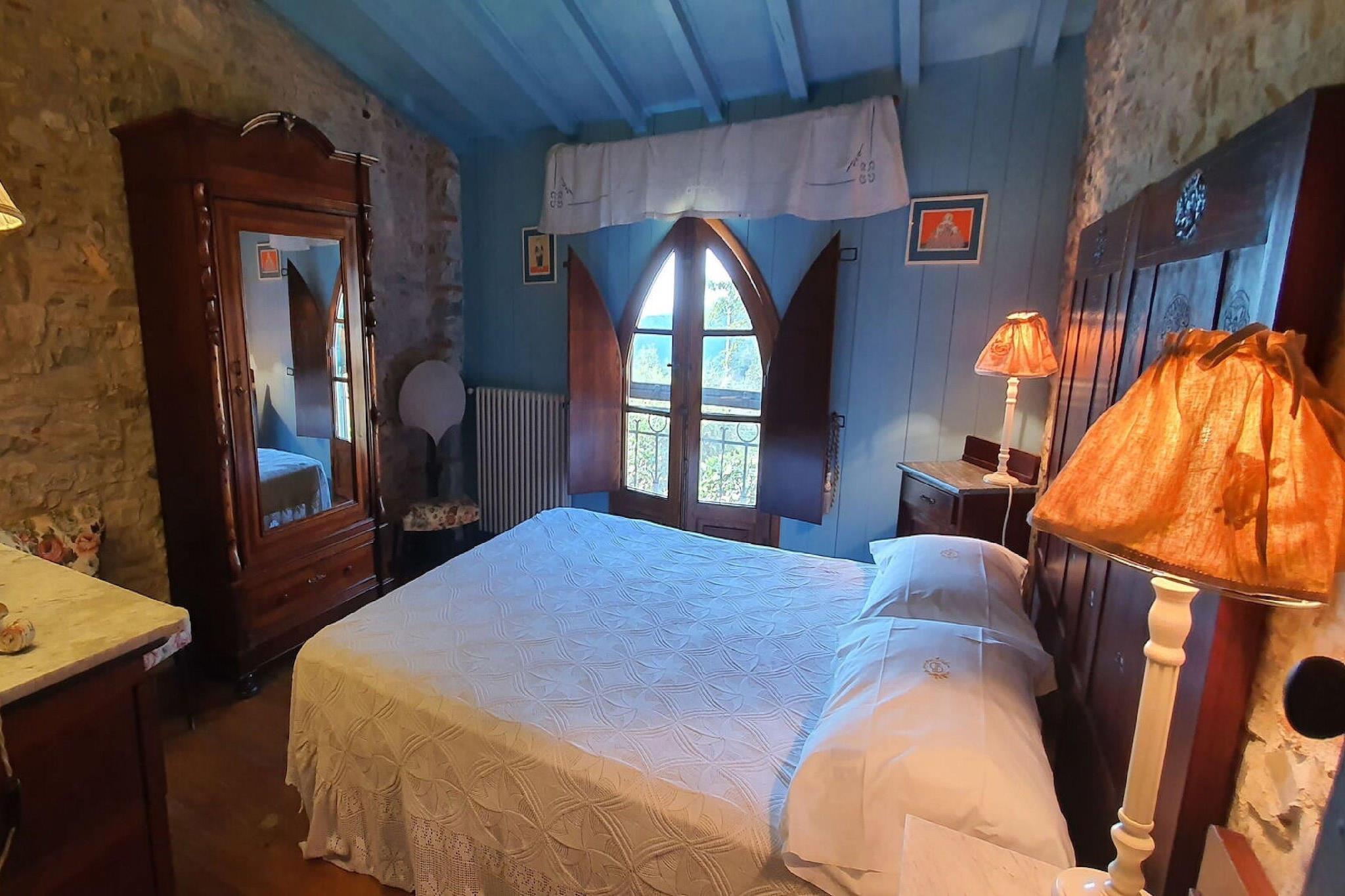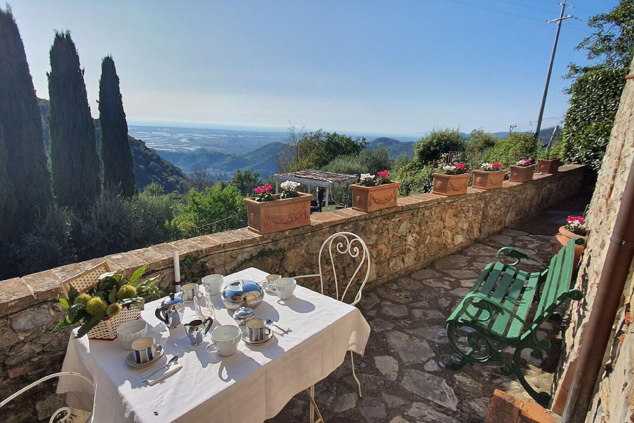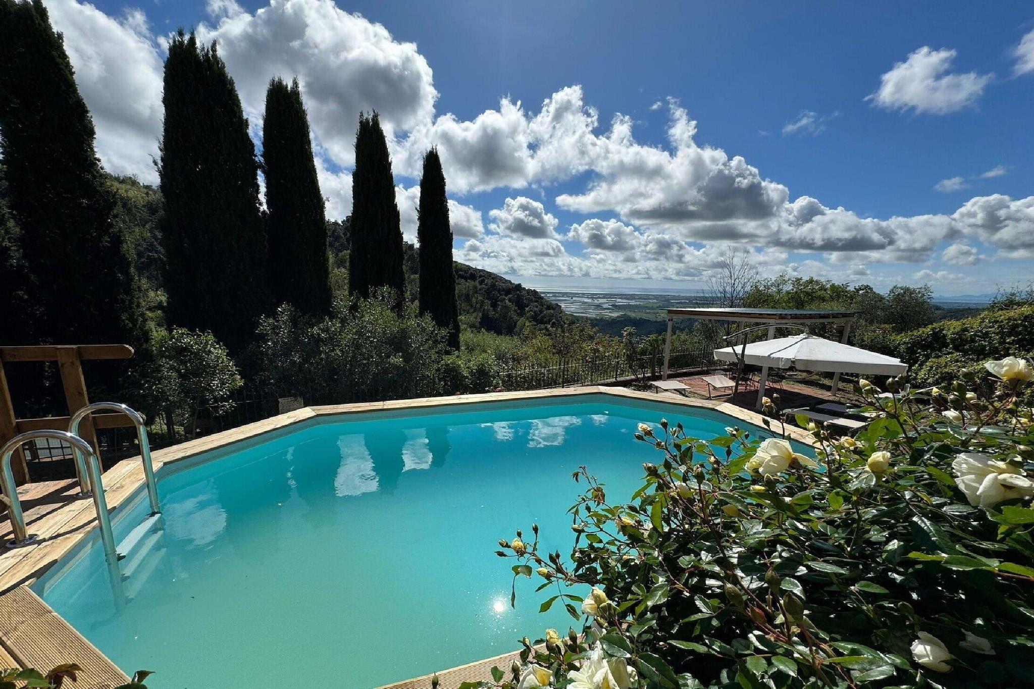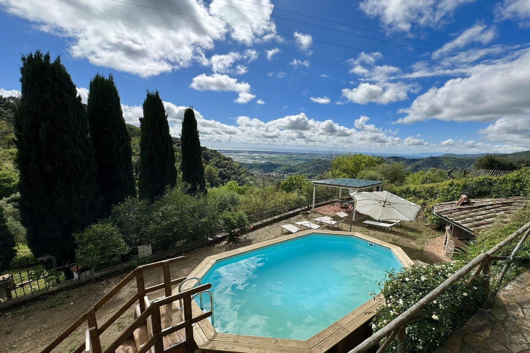 This beautiful semi-detached stone house is located in the tiny medieval hamlet of Chiatri and offers breathtaking views over the coasts of the Versilia and the lake of Massaciuccoli. The hamlet of Chiatri is known also as the summer residence of the famous composer Giacomo Puccini. The wonderful surrounding nature invites to have relaxing strolls and makes it possible to live fully the contact with the nature of the hills which separate Lucca from the sea. This house is perfect to visit the lake of Massaciuccoli, the Natural Park of Migliarino – San Rossore and to go to the beach to Torre del Lago Puccini or the famous beaches of Versilia. Music lovers can attend the famous Puccini festival which takes place every year in July and August. The Natural Park of the Alpi Apuane and art cities like Pietrasanta, Lucca, Pisa and Florence can be easily reached by car and can be visited in a day trip. Several cycle paths, which are suitable for racing bikes and/or mountain bikes, start from Chiatri and lead to Lucca on one side or to the seaside on the other. They are the ideal option for those who want to alternate a visit to the mountains to one to the sea. There are also panoramic 5 km walking paths, which are suitable for everyone. This house has been renovated with great care and consists of a beautiful panoramic terrace (c.ca 4 sqm) with a small table and chairs and of a c.ca 100 sqm garden with gazebo, rattan sofas and armchairs, table, chairs and barbecue, private wooden above ground octagonal swimming pool (5.60 m x 3.70 m, 1.20 m depth) with deck chairs. The garden offers breathtaking views on the lake of Massaciuccoli and the coasts of the Versilia. The house consists of: on the ground floor, entrance in the kitchen with stovetop, small electric oven, microwave, fridge/freezer, toaster, filter coffee brewer, dining table, living room with sofa, SAT Tv. On the first floor: walk-through room with 1 single sofa-bed, 1 twin bedroom, 1 double bedroom, 1 bathroom with shower, toilet, bidet and basin. The house is furnished with great care in country style with antique furnishings and great attention to upholstery and furnishing details, wooden beamed ceilings, terracotta floorings, pastel-coloured walls and some walls in exposed stone. Parking available near the house. Washing machine in the boiler room next to the house entrance, fans at disposal, mosquito nets, safe and Wi-Fi connection.