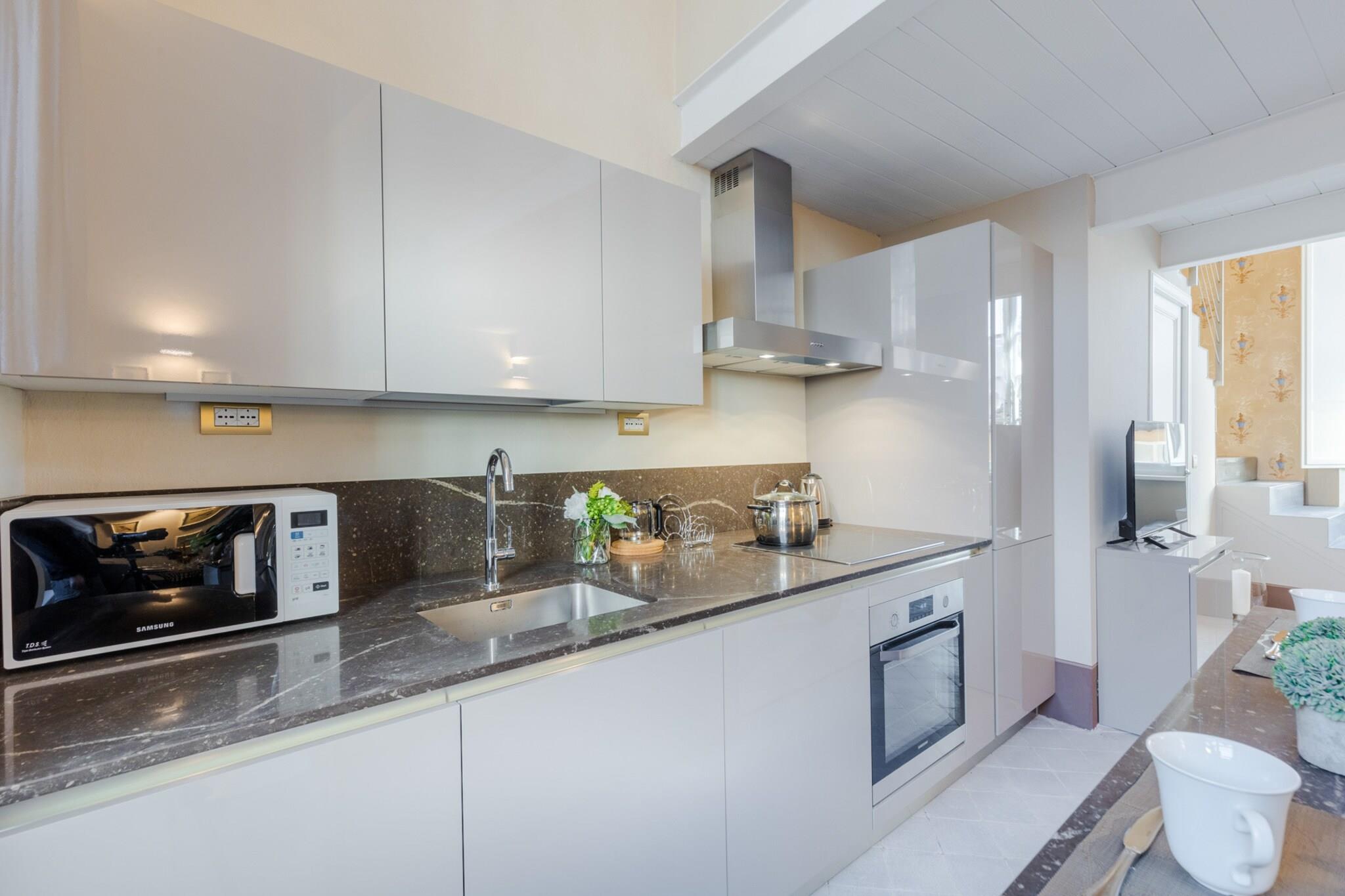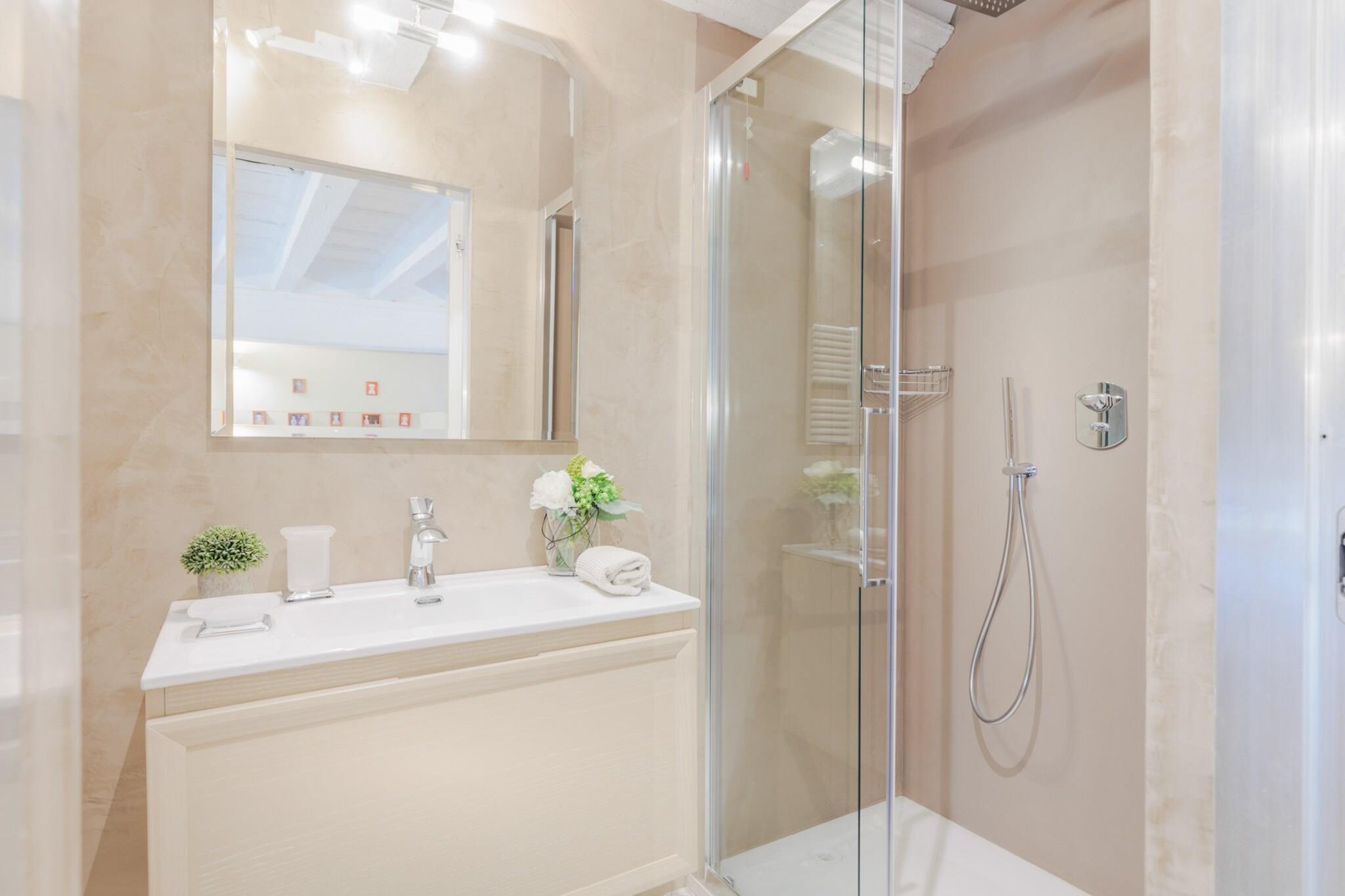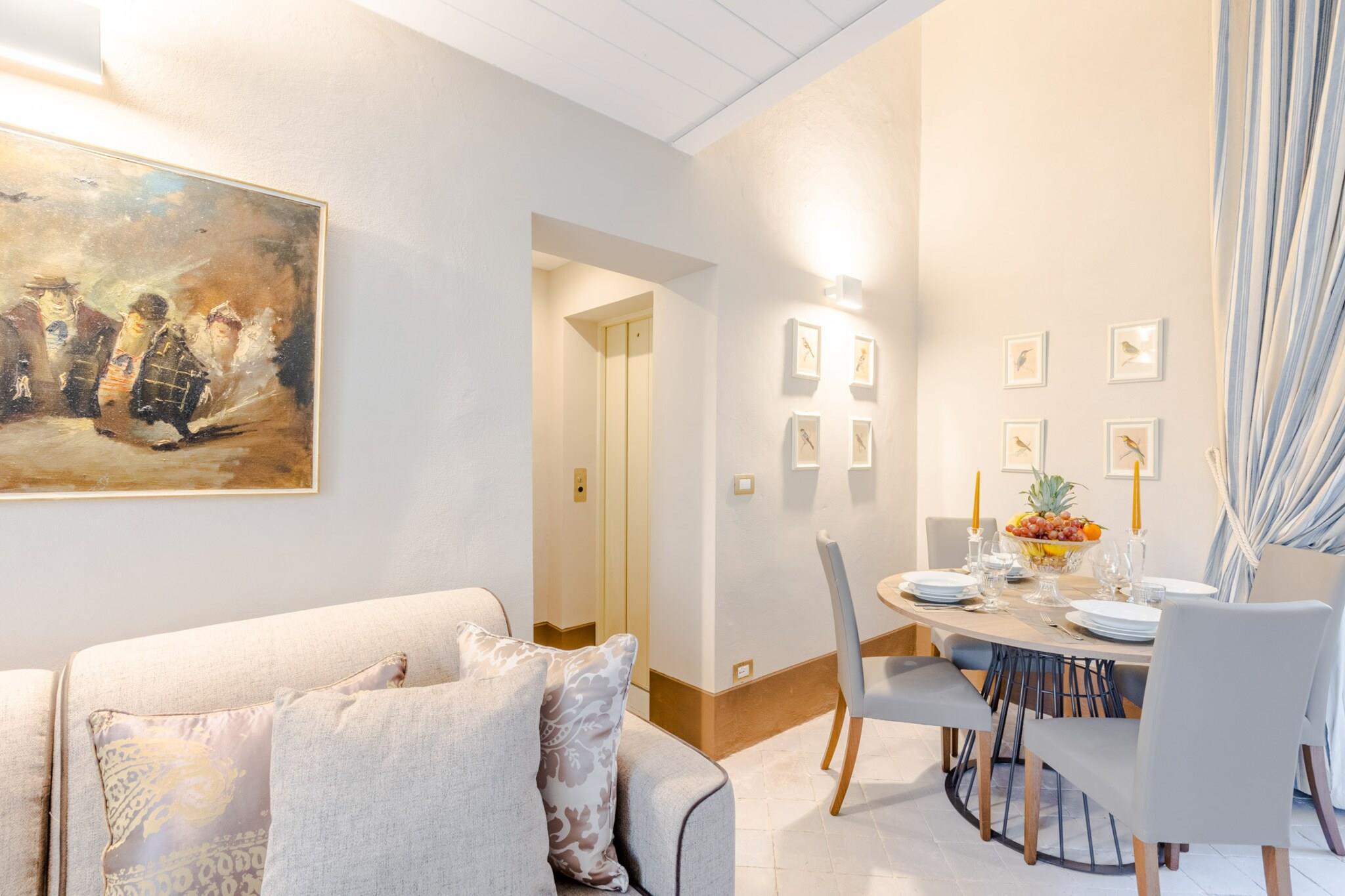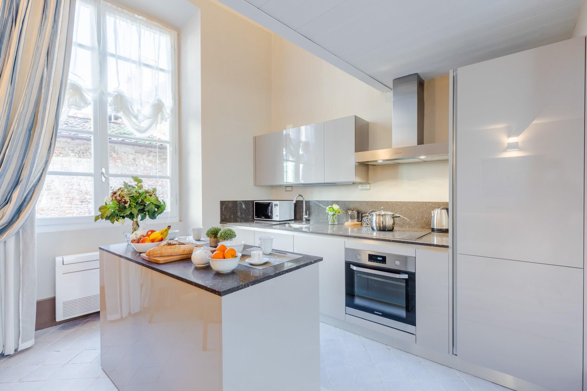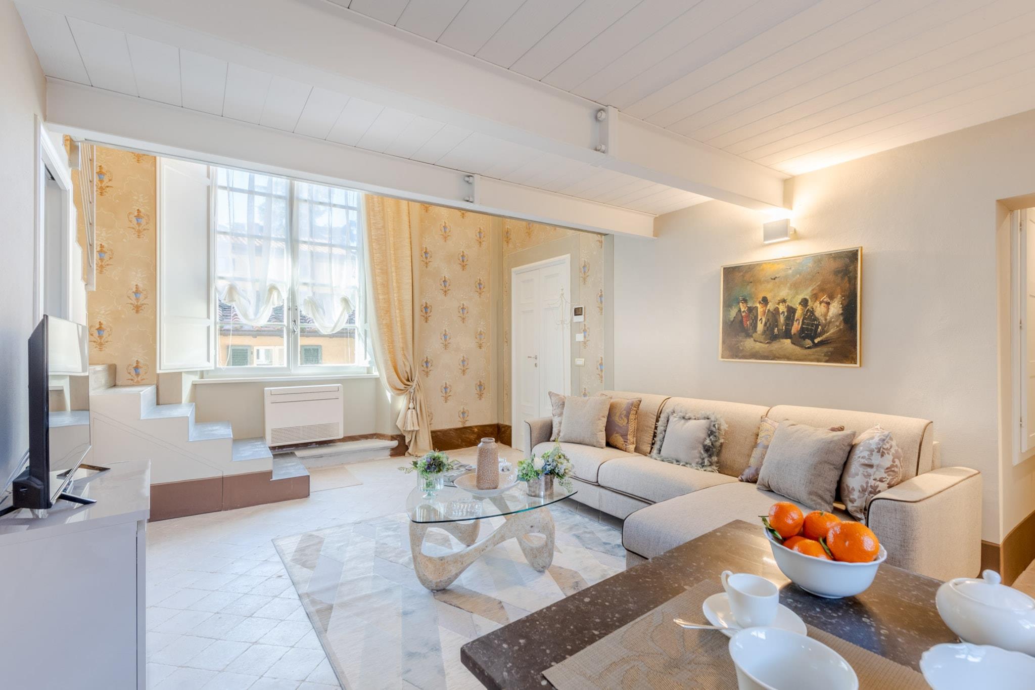 Træd ind i tidløs elegance og moderne komfort i denne udsøgt restaurerede lejlighed, hvor historisk charme møder eksklusivt design i hjertet af Lucca. De originale trælofter, kunstneriske farvede glaspartier og raffinerede indretning afspejler storheden fra fortiden som hertugens private kvarterer - nu omhyggeligt opdateret til moderne livsstil. Lejligheden er på 80 m² og har et lyst åbent opholdsområde med en dobbelt sovesofa, et komplet badeværelse og et fuldt udstyret køkken. Ovenpå på loftet har det rolige soveværelse sit eget luksuriøse badeværelse. Hver detalje i rummet er blevet kurateret for at tilbyde et unikt og behageligt ophold. Fra aircondition og højhastigheds-Wi-Fi til en elevator for nem adgang er bekvemmeligheden problemfrit integreret. Lys strømmer ind i lejligheden gennem store vinduer, der fremhæver antikke detaljer og smagfulde møbler, mens et fælles vaskerum i stueetagen tilføjer praktiske faciliteter til længere ophold. Lejligheden ligger kun få skridt fra Piazza San Michele og Via Fillungo og placerer dig i hjertet af Luccas historiske centrum. Udforsk ikoniske steder som Torre Guinigi, Piazza dell’Anfiteatro og antikvitetskvarteret, alt sammen inden for få minutters gang. For dem, der ønsker at komme længere, ligger togstationen og parkeringspladsen inden for 10 minutters gang, hvilket giver nem adgang til destinationer som Pisa, Firenze, Cinque Terre og videre. Med lokale markeder, butikker og caféer lige rundt om hjørnet er dette elegante tilflugtssted den perfekte base for at opleve det autentiske toscanske liv. Bemærk: Turistskat skal betales på ejendommen.