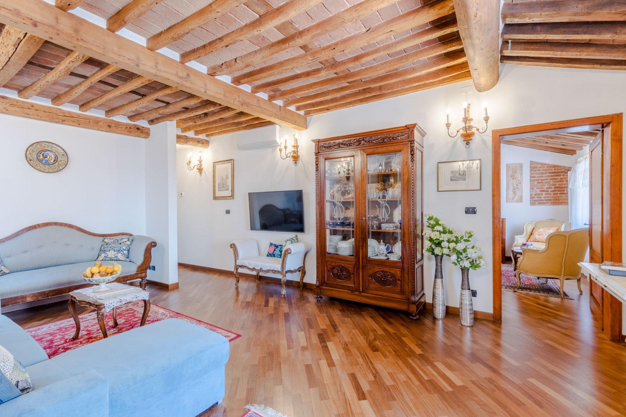 Træd ind i et levende stykke italiensk historie i denne unikke lejlighed, der ligger i det middelalderlige tårn i Bastionen Porta San Gervasio, en af Luccas oprindelige fæstningsværker fra 1100-tallet. Disse historiske mure husede engang byens vagter og deres kommandør, som boede her for at beskytte Lucca fra tårnets høje udsigtspunkt. Nu er det en omhyggeligt designet bolig i tre etager på tredje sal, der blander århundreder gammel arkitektur med vintagemøbler, livlige detaljer og moderne faciliteter, herunder WiFi og aircondition. Lejlighedens panoramavinduer åbner ud mod hustagene og de omkringliggende bakker, hvilket bringer landbrisen ind og indrammer den fredelige skyline. Dens layout inkluderer en hyggelig opholdsstue, et fuldt udstyret køkken med charmerende udsigt, to badeværelser, et soveværelse, et værelse med to enkeltsenge og ovenlysvindue, et vaskerum og et soveværelse på øverste niveau med en fransk dør, der tilbyder spektakulær udsigt - det tidligere kammer for den middelalderlige chefvagt. Charmen ved dens middelalderlige struktur er intakt, hvilket gør det til et sjældent og fordybende ophold, selvom det måske ikke er egnet til gæster med mobilitetsproblemer. Lejligheden er centralt beliggende inden for Luccas bymure, inden for den begrænsede trafikzone (ZTL), og tilbyder ikke parkering på stedet. Den nærliggende Mazzini-parkeringsplads ligger dog en kort gåtur væk og er let tilgængelig ved at følge skiltningen for at undgå områder med begrænset trafik. Med shopping, caféer og monumenter i nærheden tilbyder boligen en balance mellem historie og bekvemmelighed. Bemærk venligst, at sen indtjekning er mulig mod et gebyr, og at tjenesterne er selvforplejning i overensstemmelse med italiensk lejelovgivning. Bemærk: Turistskat skal betales på ejendommen.
