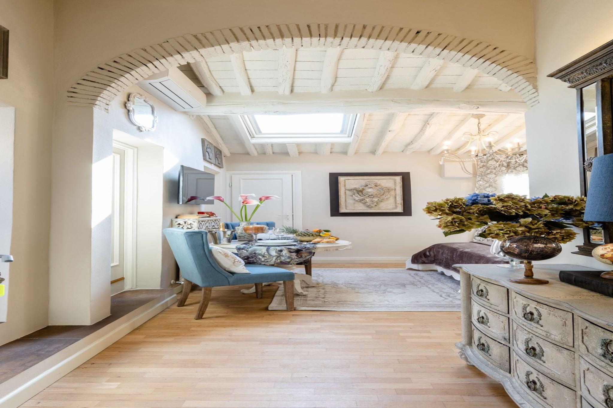 Denne kompakte og elegante studiolejlighed i hjertet af Lucca tilbyder en komfortabel dobbeltseng og er bedst egnet til solorejsende eller par, der søger et hyggeligt ophold i byens historiske centrum. Lejligheden er på 25 m² og ligger på tredje sal, og inkluderer et opholdsområde i loftsstil med lavt til loftet for ekstra charme. Selvom den er lille i størrelse, tilbyder lejligheden en komplet oplevelse med moderne bekvemmeligheder og vigtige tjenester som aircondition og højhastighedsinternet. Kæledyr er ikke tilladt, men valgfrie tjenester såsom lokale vinpakker kan arrangeres for at forbedre dit ophold. Lejligheden er ideelt beliggende ved siden af Piazza San Michele og kun få skridt fra Via Fillungo, og tilbyder direkte adgang til Luccas mest ikoniske attraktioner. Gæsterne kan nemt udforske lokale butikker, caféer, restauranter og pizzeriaer, som alle er inden for gåafstand. Beliggenheden inden for Luccas gamle mure giver en autentisk toscansk oplevelse. Der er offentlig parkering inden for ti minutters gang, og nærliggende offentlige transportmuligheder sikrer nem transport til og fra byen. Lejligheden har et smart, fuldt udstyret køkken med essentielle apparater, perfekt til at tilberede enkle måltider. Et moderne badeværelse har et indbygget brusebad og er fyldt med friske håndklæder og toiletartikler. Yderligere faciliteter inkluderer et tv, varme og alt nødvendigt sengetøj. Serviceydelser som slutrengøring, internet og elektricitet er inkluderet i bookingen, mens ekstra faciliteter såsom sen indtjekning eller en velkomstflaske vin kan tilføjes mod et gebyr. Bemærk: Turistskat skal betales på ejendommen.