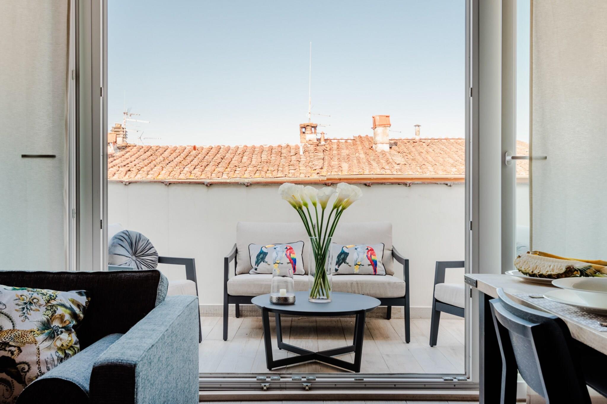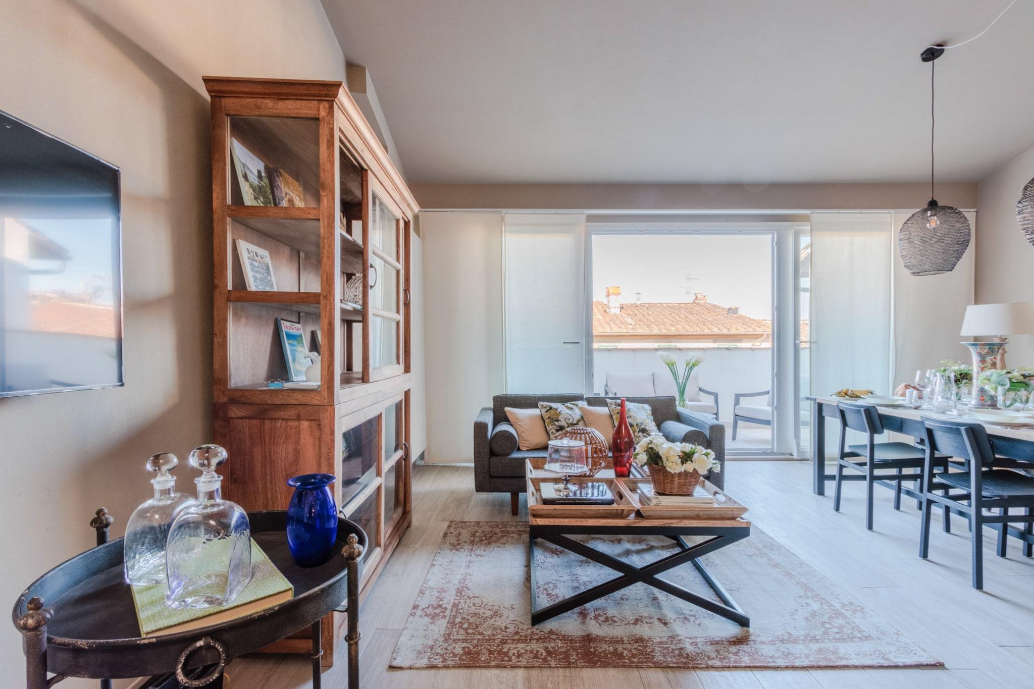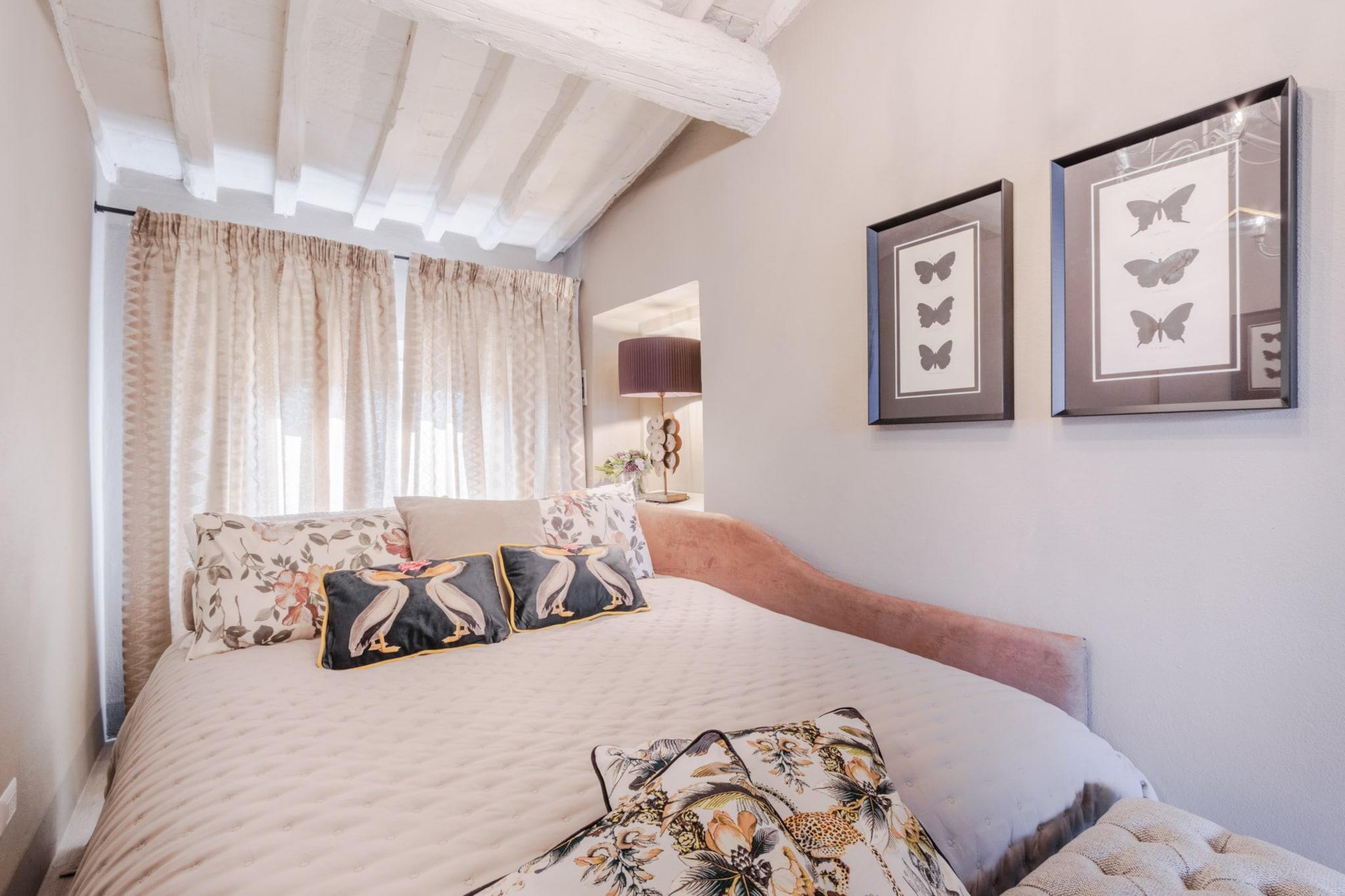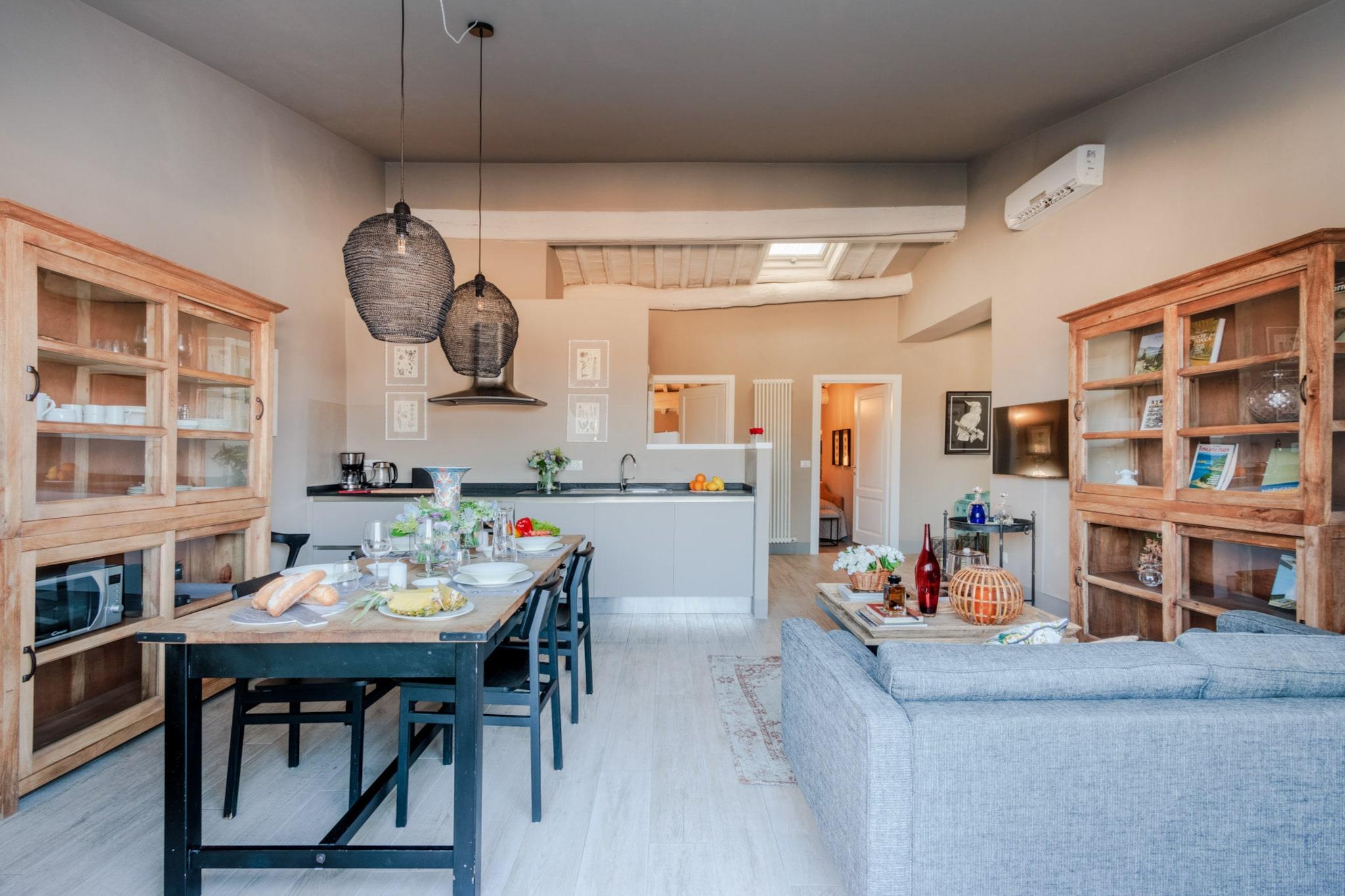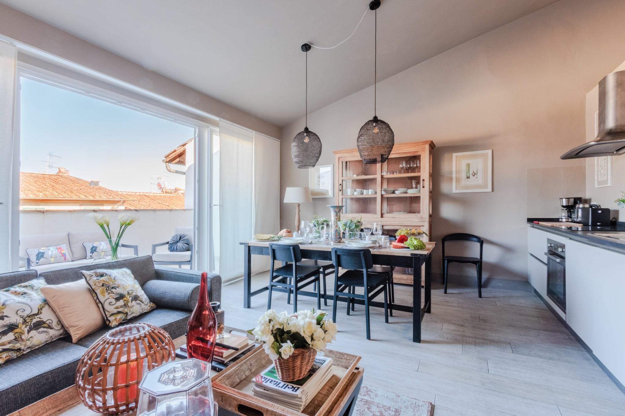 Dette lyse og velbeliggende feriehus på tredje sal tilbyder to dobbeltværelser og kan komfortabelt rumme op til fire gæster. Det er fuldt airconditioneret og omhyggeligt møbleret, og det har en hyggelig opholdsstue med sofa, en rummelig spiseplads og en privat udendørs terrasse, der er ideel til at nyde måltider under den toscanske himmel. Ejendommen er ikke kæledyrsvenlig og har ikke elevator. En højstol og barneseng er tilgængelige efter anmodning, og valgfrie ekstrafunktioner som lokale vine kan bookes for at forbedre dit ophold. Lejligheden ligger inden for Luccas historiske mure og har en førsteklasses beliggenhed kun få skridt fra Via Fillungo, byens mest populære gågade. Med ikoniske vartegn som Torre delle Ore og Piazza San Michele inden for gåafstand er omgivelserne ideelle til sightseeing, shopping og spisning. Lokale bagerier, købmandsforretninger, togstationen og busterminalen er let tilgængelige til fods, mens sikker offentlig parkering er tilgængelig i nærheden på Parking Mazzini. Lejligheden har et fuldt udstyret køkken med moderne apparater, et komplet badeværelse og et dedikeret vaskerum med vaskemaskine. En glasdør i fuld længde fører ud til den solrige terrasse med udsigt over Luccas hustage. Alle forbrugsomkostninger, sengelinned, Wi-Fi og slutrengøring er inkluderet i prisen. Yderligere tjenester kan arrangeres gennem eksterne partnere, der passer til både korte og længere ophold. Bemærk: Turistskat skal betales på ejendommen.