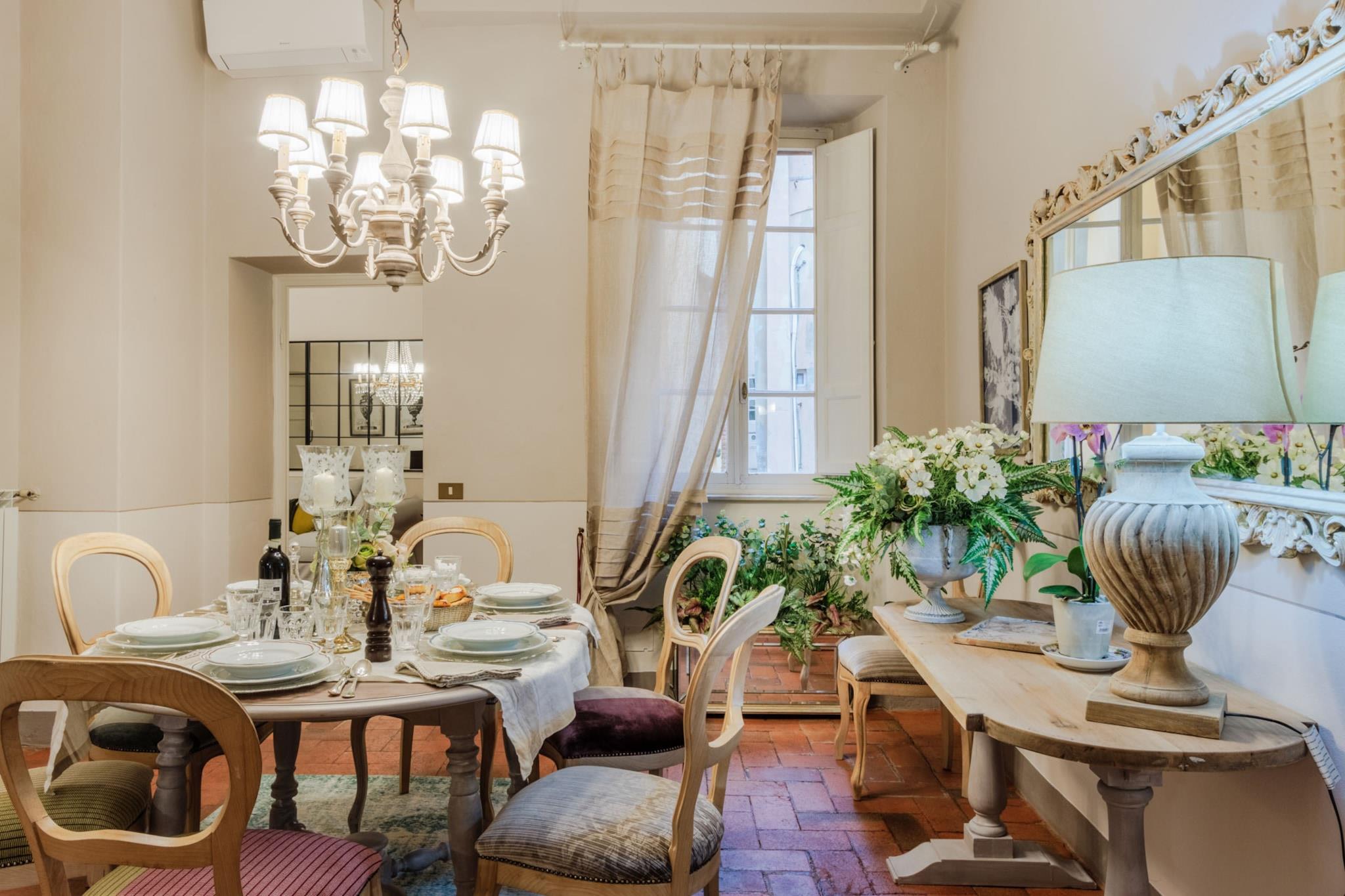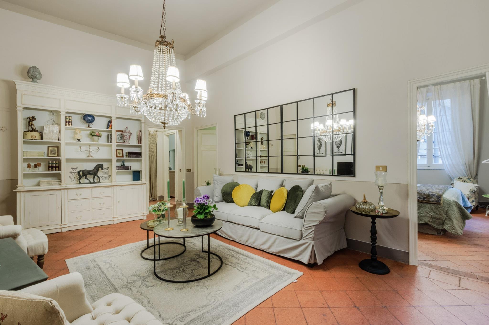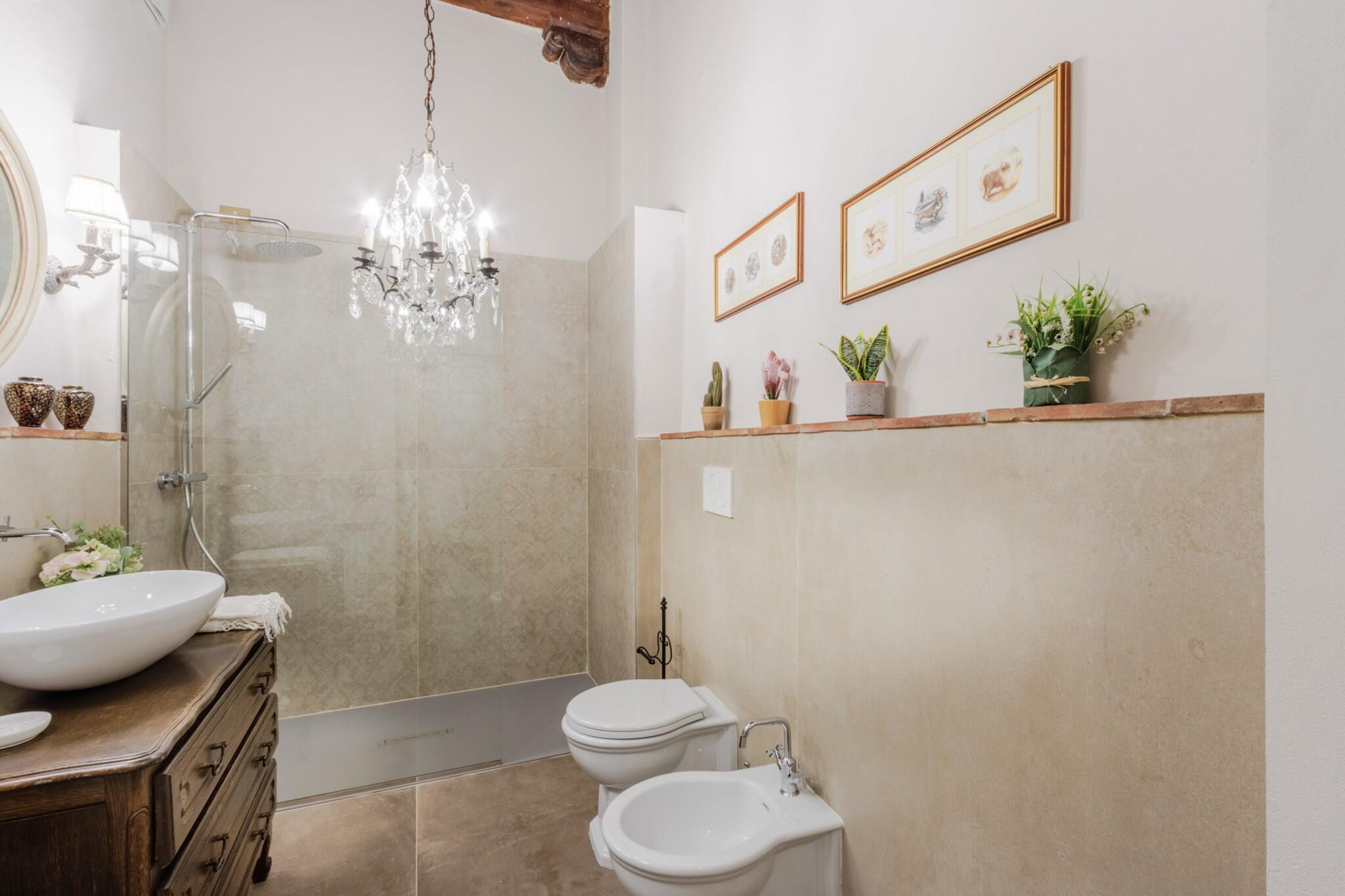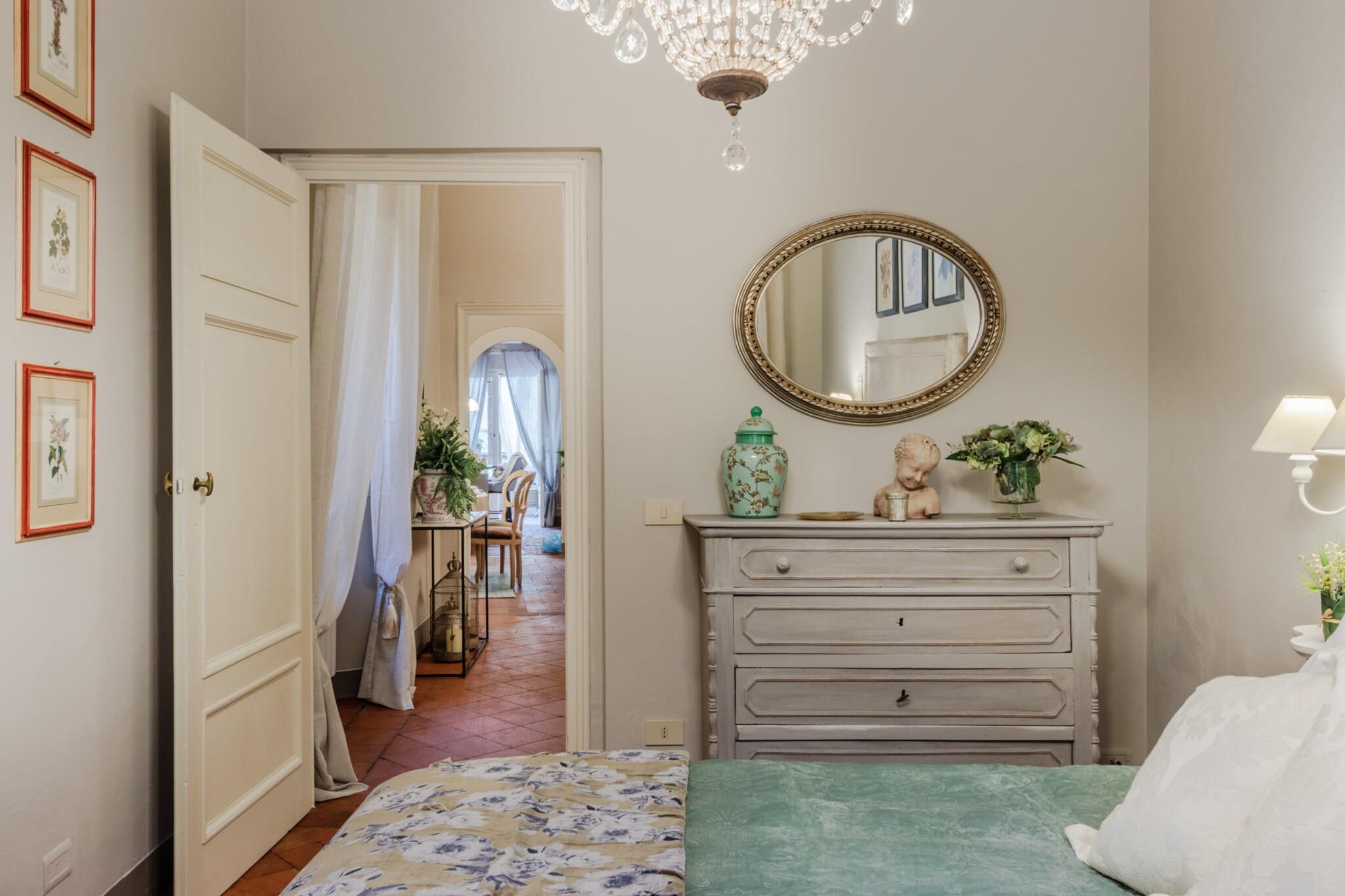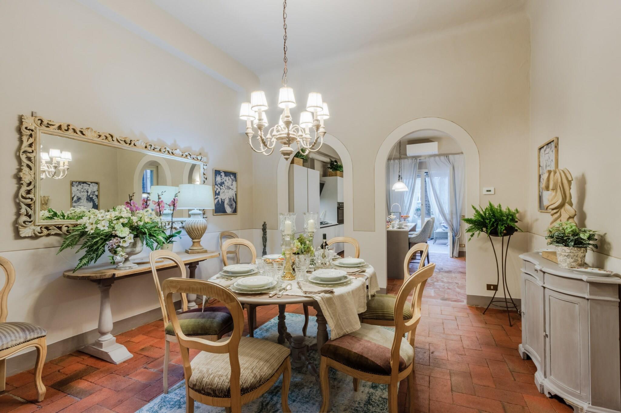 Oplev Luccas charme fra denne elegante lejlighed på første sal, hvor moderne komfort møder historisk italiensk charme. Dette hjem med tre soveværelser og to badeværelser tilbyder et stilfuldt og roligt tilflugtssted, perfekt til familier eller små grupper, der søger en autentisk oplevelse i bymidten. Træd ind i en lys opholds- og spisestue, designet til afslapning og hyggelige måltider, og nyd et fuldt udstyret køkken, hvor det er nemt at tilberede morgenmad eller en afslappet middag. Hvert soveværelse har en komfortabel dobbeltseng, og soveværelset har et ensuite badeværelse, mens det ekstra badeværelse betjener de andre soveværelser og sikrer privatliv og bekvemmelighed for alle gæster. Lejlighedens sande højdepunkt er dens store terrasse. Her kan du nippe til morgenkaffe, spise udendørs eller blot slappe af, mens du nyder panoramaudsigten over Luccas historiske hustage, charmerende haver og den indviklede arkitektur i renæssancepaladser. Terrassen giver et fredeligt sted at nyde middelhavssolen, mens du føler dig forbundet med den pulserende energi i byen nedenfor. Beliggende kun få skridt fra ikoniske vartegn som katedralen, Piazza Anfiteatro, Piazza San Michele og Via Fillungos butikker og caféer, placerer denne lejlighed det bedste af Lucca lige uden for døren. Med sin blanding af elegance, historiske omgivelser og udendørs plads er denne lejlighed en perfekt base for at udforske Lucca og tilbyder en mindeværdig flugt i bymidten, hvor hvert øjeblik er fyldt med italiensk charme. Rygning og kæledyr er ikke tilladt, hvilket sikrer et roligt og velholdt miljø. Bemærk: Turistskat skal betales på ejendommen.