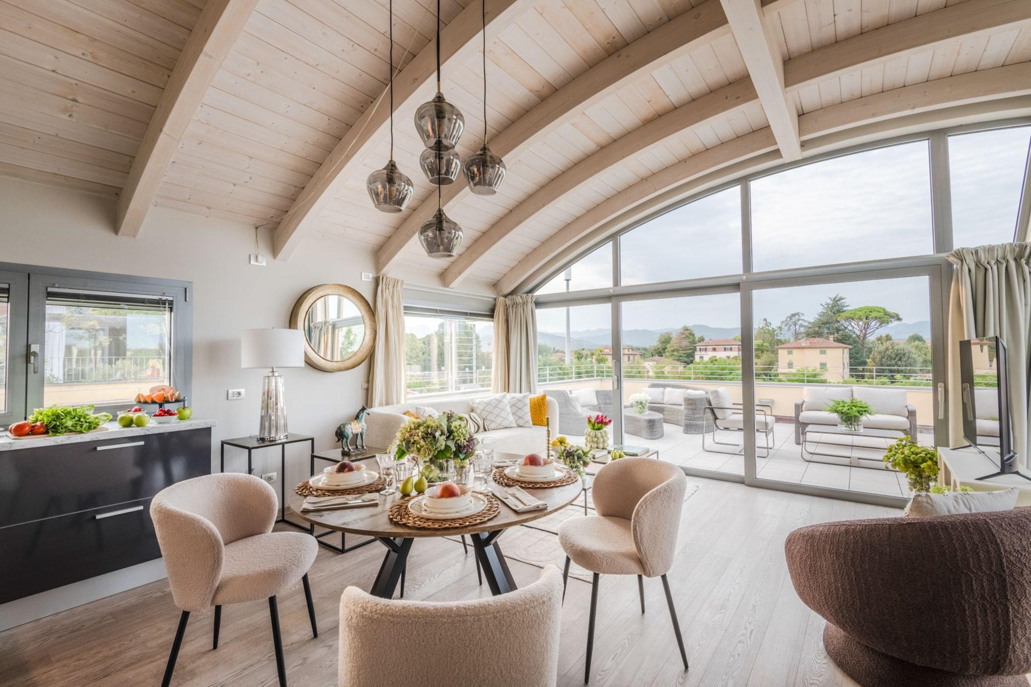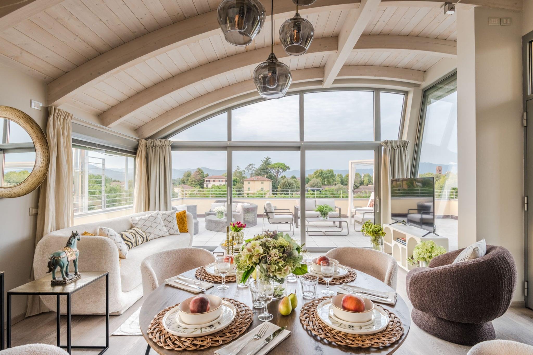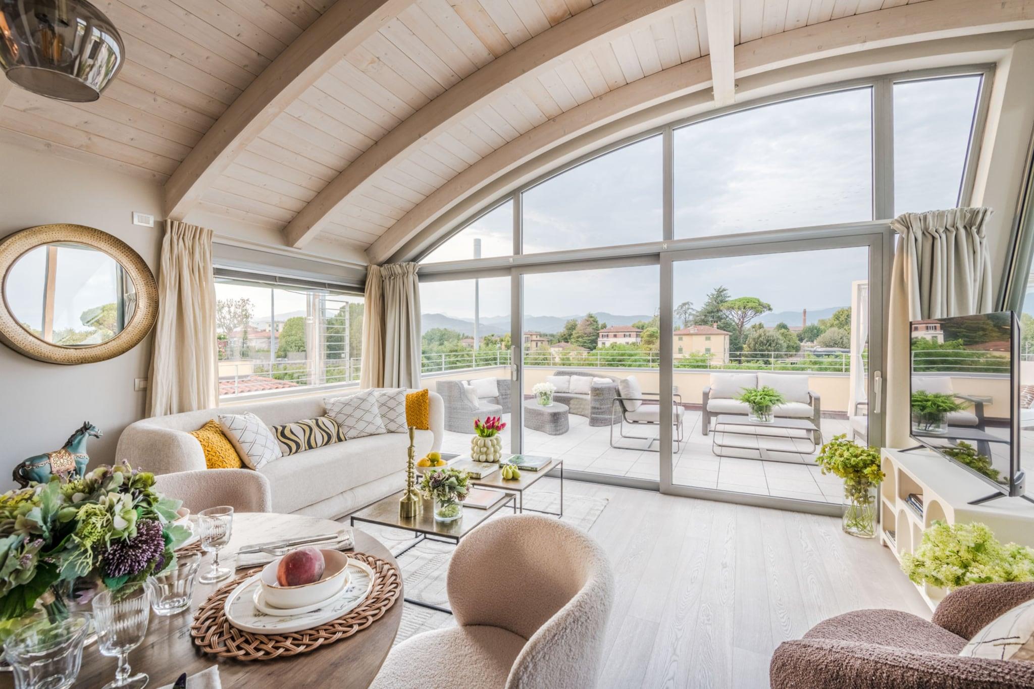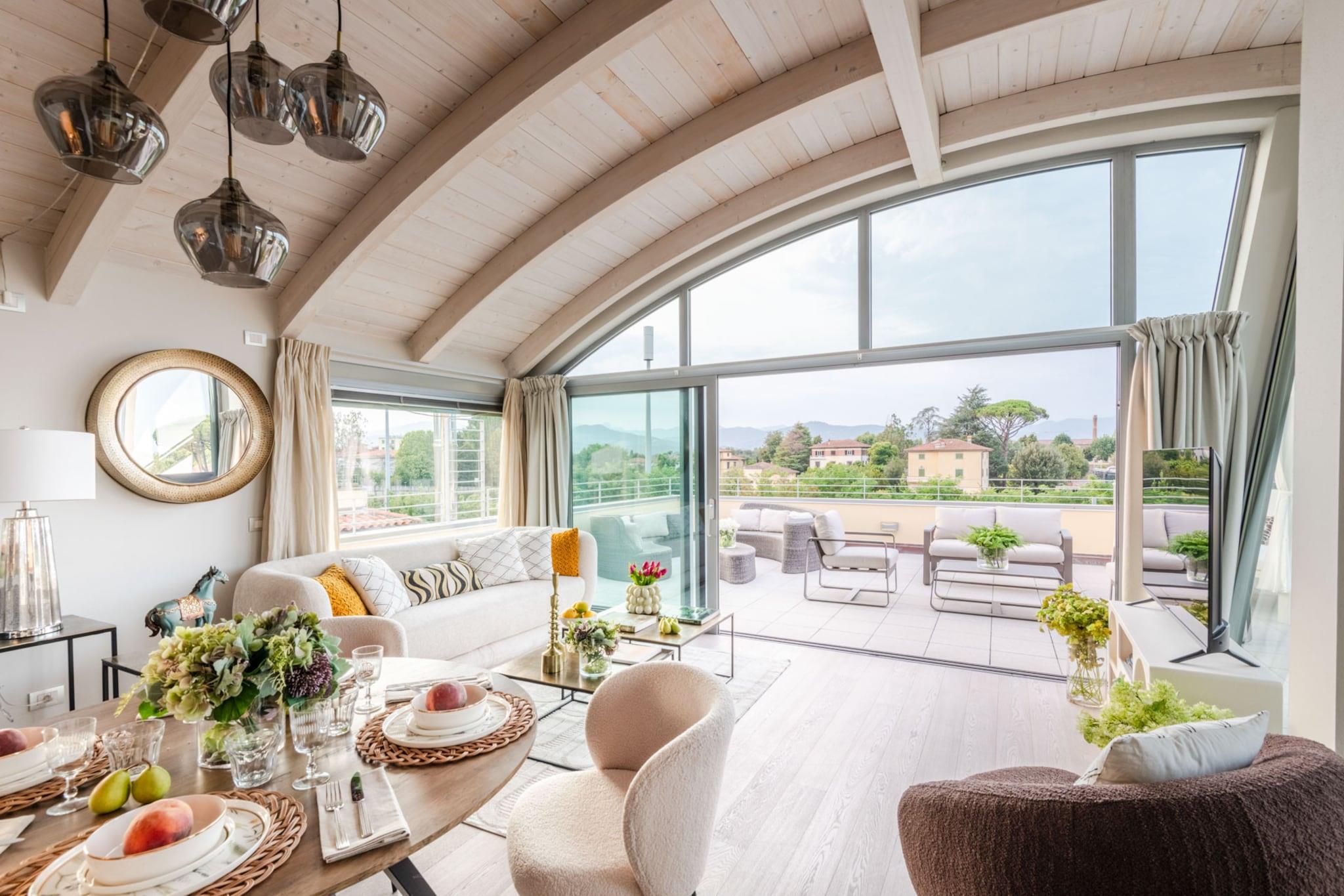 Forestil dig at vågne op i et solbeskinnet fristed over Luccas historiske mure, badet i gyldent lys gennem gulv-til-loft-glas. Denne moderne penthouse i rolige San Concordio tilbyder uovertruffen luksus og blander moderne design med Toscanas tidløse skønhed. Træd ind i et rummeligt, åbent opholdsrum, hvor elegante møbler møder naturligt lys. Glasvægge indrammer en betagende panoramaudsigt over Luccas gamle fæstningsværker og forbinder problemfrit indendørs elegance med udendørs pragt. Hjertet i denne penthouse er dens store terrasse - et privat fristed for morgenespresso eller solnedgangsvin over de toscanske bakker. Denne udendørs oase udvider dit opholdsrum, perfekt til udendørs spisning eller blot til at nyde byens rolige atmosfære. Indretningen omfatter en stue med spisestue og køkken, et soveværelse, et soveværelse med to enkeltsenge og et badeværelse med bruser. Beliggende på en fredelig gade med gratis parkering, kombinerer denne penthouse bekvemmelighed med ro. Oplev lokale skatte som håndværksbagerier, caféer og gelato-butikker kun få skridt væk. En fem minutters gåtur fra Lucca togstation giver nem adgang til Toscanas vidundere: Firenze, Chianti og Cinque Terre. Med elevatoradgang er det nemt at vende tilbage til dette luksuriøse tilflugtssted. Her møder moderne elegance Italiens vedvarende charme og skaber en uforglemmelig oplevelse. Bemærk: Turistafgiften skal betales på stedet.