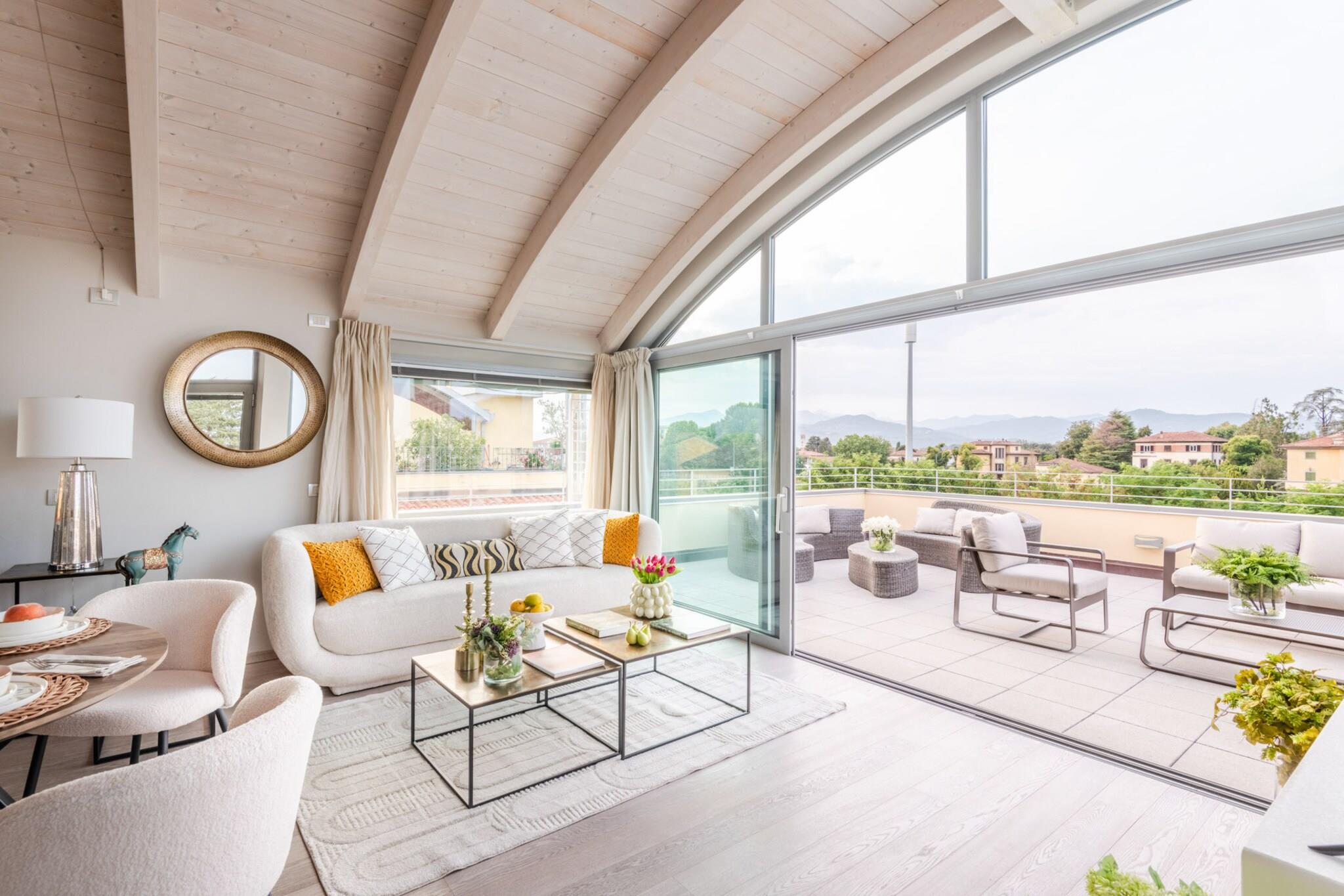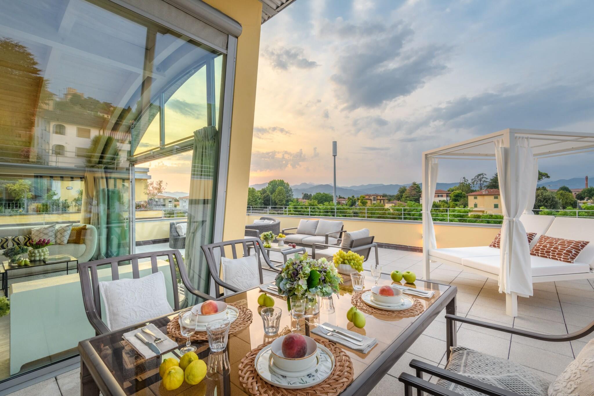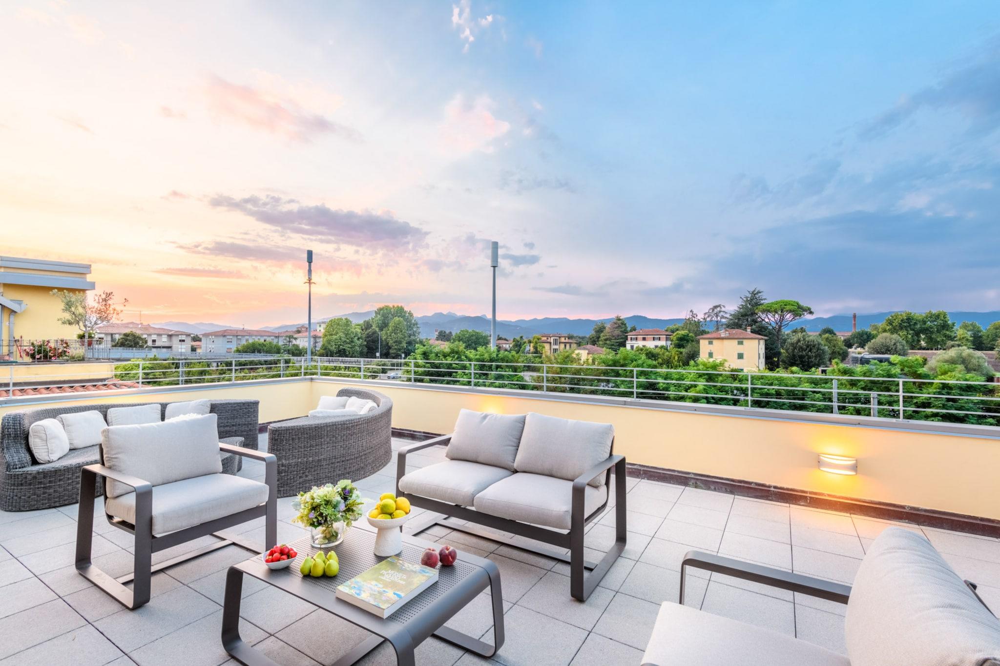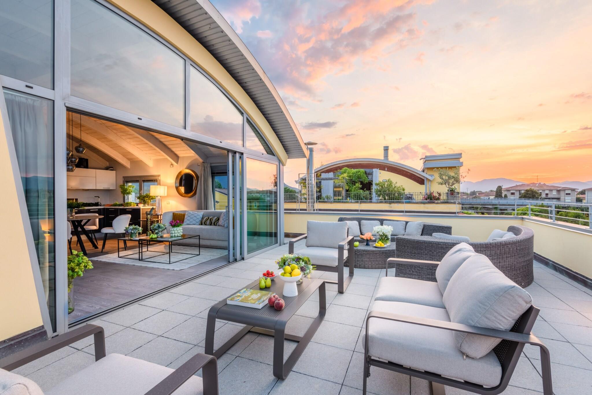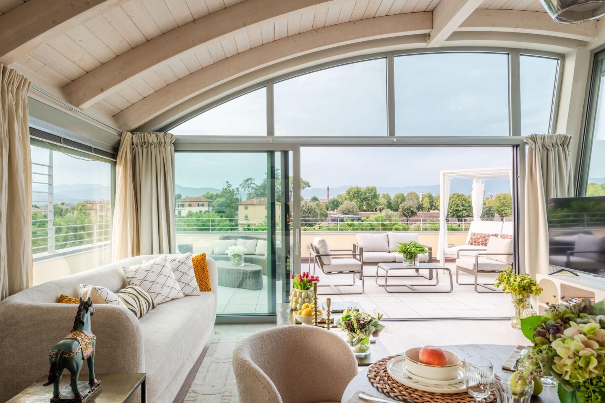 Forestil dig at vågne op i et solbeskinnet fristed over Luccas historiske mure, badet i gyldent lys gennem gulv-til-loft-glas. Denne moderne penthouse i rolige San Concordio tilbyder uovertruffen luksus og blander moderne design med Toscanas tidløse skønhed. Træd ind i et rummeligt, åbent opholdsrum, hvor elegante møbler møder naturligt lys. Glasvægge indrammer en betagende panoramaudsigt over Luccas gamle fæstningsværker og forbinder problemfrit indendørs elegance med udendørs pragt. Hjertet i denne penthouse er dens store terrasse - et privat fristed for morgenespresso eller solnedgangsvin over de toscanske bakker. Denne udendørs oase udvider dit opholdsrum, perfekt til udendørs spisning eller blot til at nyde byens rolige atmosfære. Indretningen omfatter en stue med spisestue og køkken, et soveværelse, et soveværelse med to enkeltsenge og et badeværelse med bruser. Beliggende på en fredelig gade med gratis parkering, kombinerer denne penthouse bekvemmelighed med ro. Oplev lokale skatte som håndværksbagerier, caféer og gelato-butikker kun få skridt væk. En fem minutters gåtur fra Lucca togstation giver nem adgang til Toscanas vidundere: Firenze, Chianti og Cinque Terre. Med elevatoradgang er det nemt at vende tilbage til dette luksuriøse tilflugtssted. Her møder moderne elegance Italiens vedvarende charme og skaber en uforglemmelig oplevelse. Bemærk: Turistafgiften skal betales på stedet.