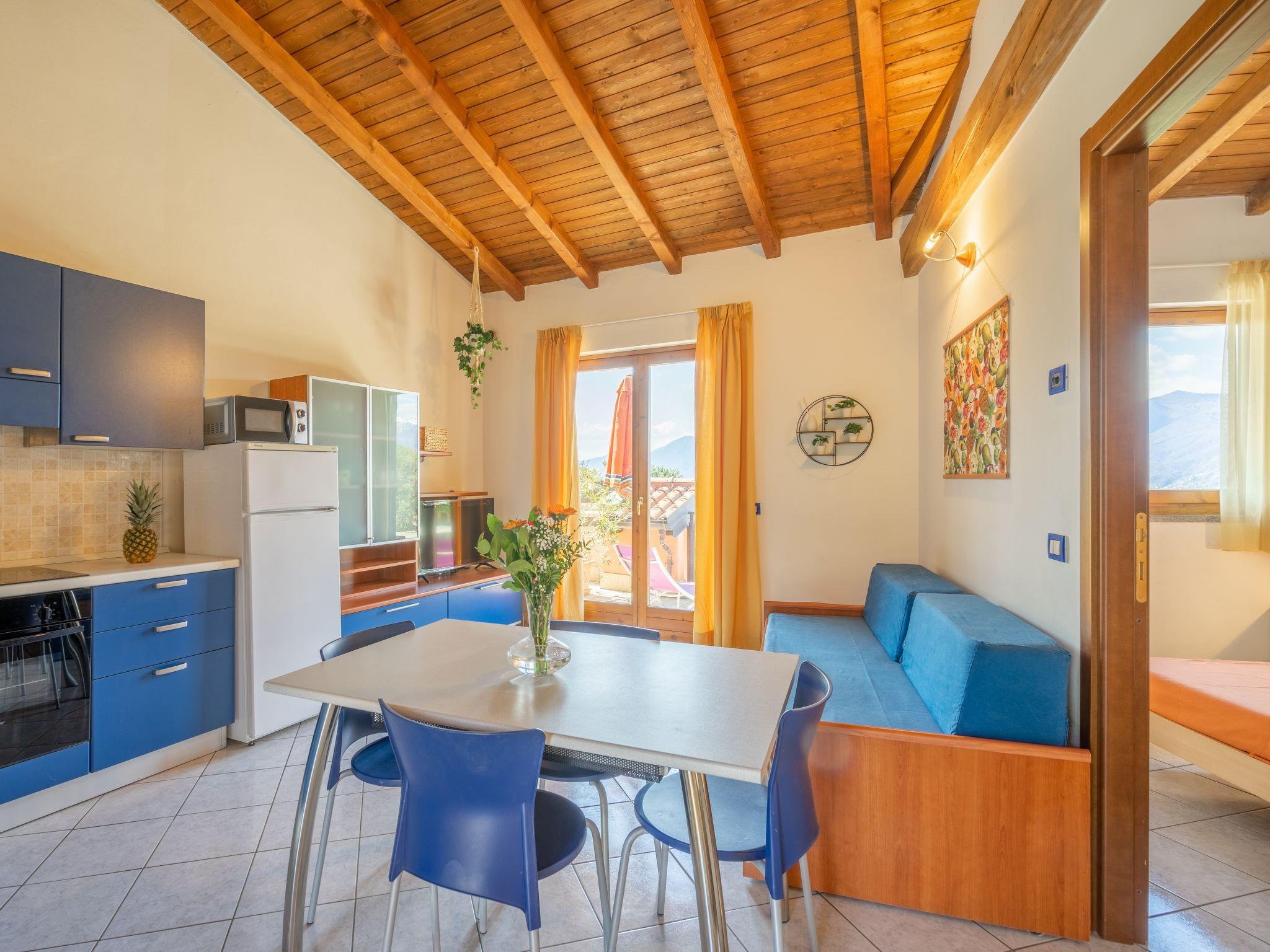 Holiday development "Residenza Agrifoglio". 17 apartments in the property. 2 km from the centre of Luino, in a sunny, elevated position, 3 km from the lake, in a cul-de-sac. For shared use: property (fenced) with lawn and trees, swimming pool (12 x 5 m, depth 140 cm, seasonal availability: 01.May. - 30.Sep. pool opening hours: 09:00-20:00). Outdoor shower, table tennis, volleyball court, barbecue, children's playground. In the house: washing machine (for shared use, extra), heating available only from 05.Oct. - 25.Apr.. 50 m long steep motor access to the house. Parking on the premises. E-charging station. Shop 2 km, supermarket 2 km, restaurant 1.5 km, bar 1.5 km, bus stop 400 m, railway station "Luino" 3 km, shingle beach "Le Serenelle" 3 km, indoor swimming pool 400 m. Tennis 400 m. Nearby attractions: Maccagno 12 km, Laveno 20 km. Please note: car recommended, no lift. Residence with electric gates. Animals in the neighbourhood. Residence consisting of apartments distributed in small buildings with a small garden and / or private balcony. One parking space for each apartment (2 for 6-person apartments). Unattended swimming pool. 2 charging stations available (the activation card must be booked in advance).