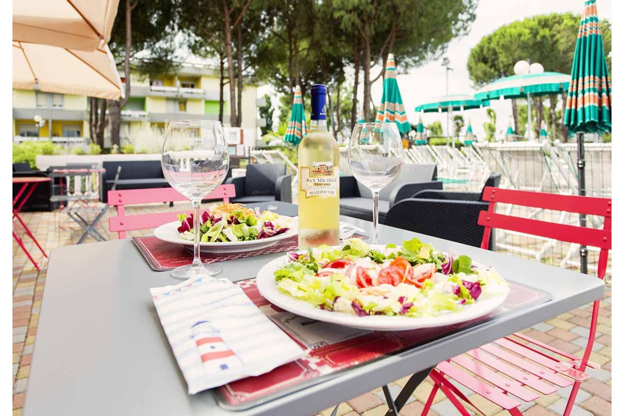 Stue(dobbeltsovesofa, Fjernsyn(parabol)), tekøkken(kogeplade(Komfur med fire kogeplader, gas), ovn, køleskab), soveværelse(dobbeltseng), badeværelse(badekar eller bruser, håndvask, toilet, føntørrer), Reception, Parkering, Cykeludlejning, Tennisbane, Bordtennis, Restaurant, Bar, Legeområde, Vaskeri, balkon, klimaanlæg, have(deles med andre gæster), havemøbler, liggestole, Parasol, swimmingpool(deles med andre gæster, inkl. separat børne swimmingpool (maks. dybde 50 cm), opened from Jun upto and including 1/2 Sep), elevator, baby crib(paid)