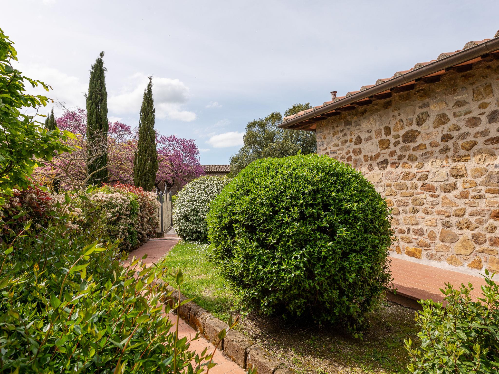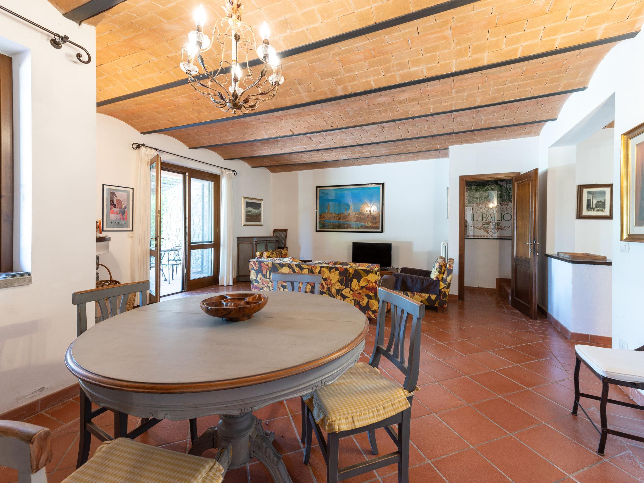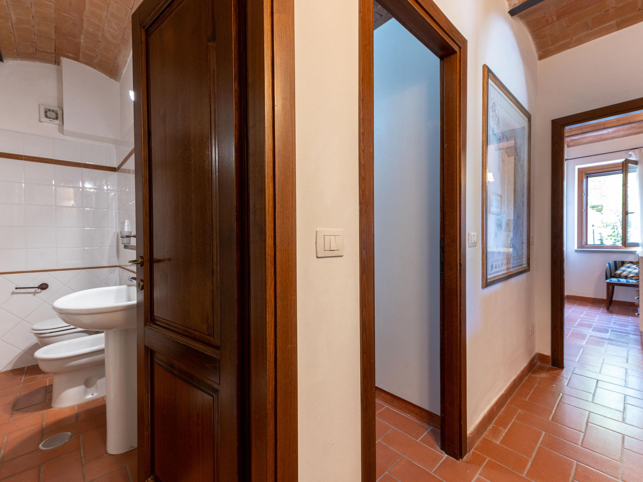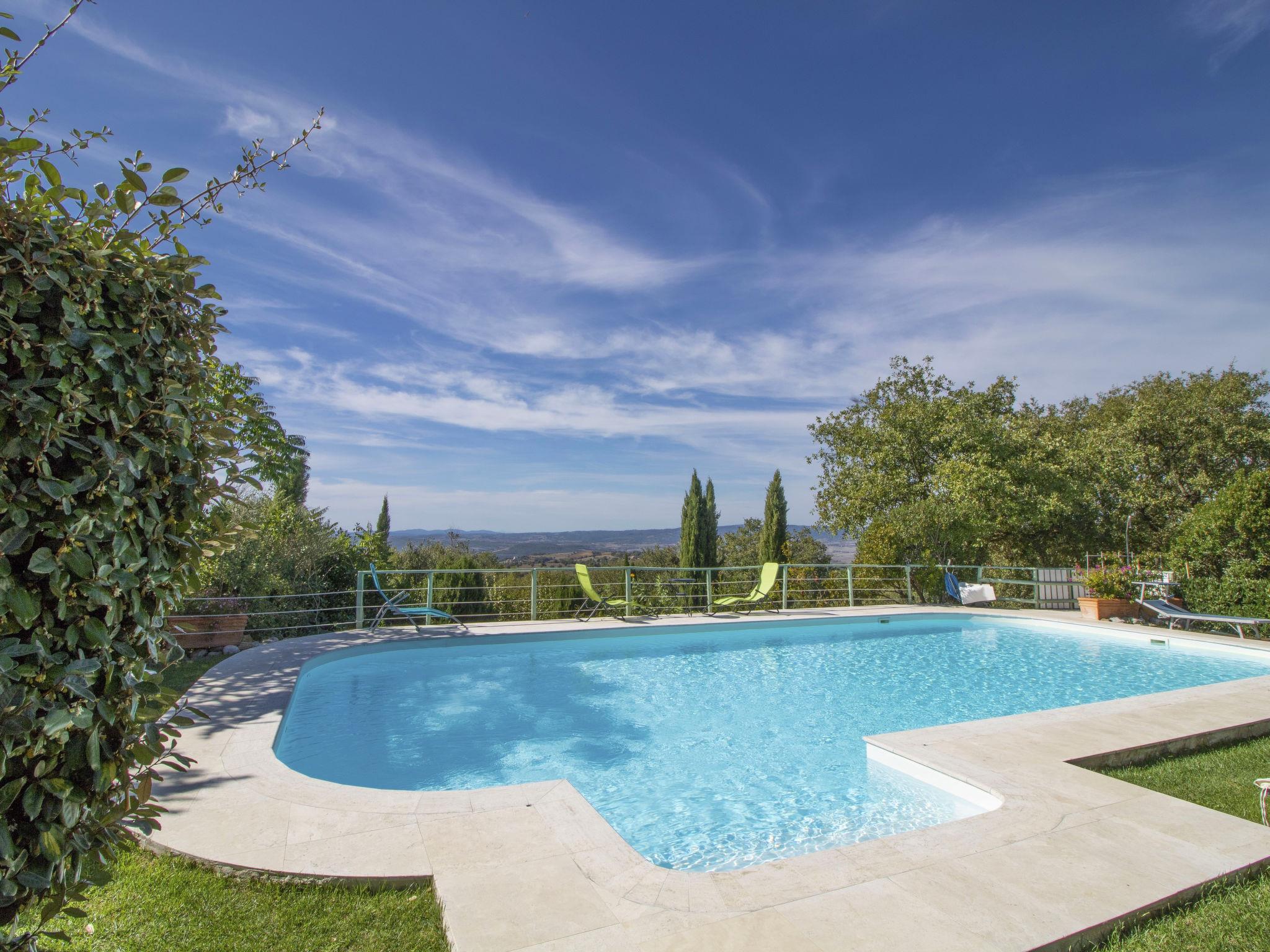 The property is situated on a hill with a fantastic panoramic view as far as the sea and the islands of Giglio and Montecristo (480 metres above sea level). Situated above the small medieval villages of Montemerano and Saturnia, famous for their warm, natural waterfalls and thermal baths. Beautiful villa 480 m a.s.l., 2 storeys, detached. In the hamlet Poderi 7 km from the centre of Saturnia, 3 km from the centre of Montemerano, 3 km from the centre of Manciano, in a quiet, sunny position on top of a hill, 50 m from the edge of the forest, 3500 km from the sea, 35 km from the beach, in the countryside. Private: property 2'000 m2 (fenced), beautiful garden to relax, swimming pool (7 x 14 m, depth 110 - 170 cm, seasonal availability: 01.Jun. - 30.Sep.) with internal staircase and salt-electrolysis pool-cleaning system. Outdoor shower, terrace, garden furniture, barbecue, pool maintenance by the owner/gardener. In the house: washing machine. Room cleaning on request (extra). Parking. Shop 2 km, supermarket 3 km, restaurant 2 km, bakery 2 km, café 2 km, bicycle rental 4 km, bus stop 200 m, railway station "Orbetello" 35 km, sandy beach "Giannella - Feniglia" 37 km, thermal baths "Saturnia" 8 km, bathing lake "Bolsena" 46 km. Golf course (18 hole) 8 km, tennis 6 km, riding stable 6 km, walking paths from the house 50 m. Nearby attractions: Pitigliano 20 km, Scansano 25 km, Capalbio 30 km, Monte Argentario 35 km, Grosseto 55 km. Well-known lakes can easily be reached: Bolsena 45 km. Please note: car recommended. Part of the house is closed and unoccupied. Beaches at Monte Argentario and the Parco d'Urcellina nature reserve, 35 km. Situated in the centre of Maremma and close to Etruscan excavations. Siena and the rest of Tuscany are within easy reach. Furnished terrace with view of the valley, garden with herbs. Pressure jet massage in one of the bathtubs.