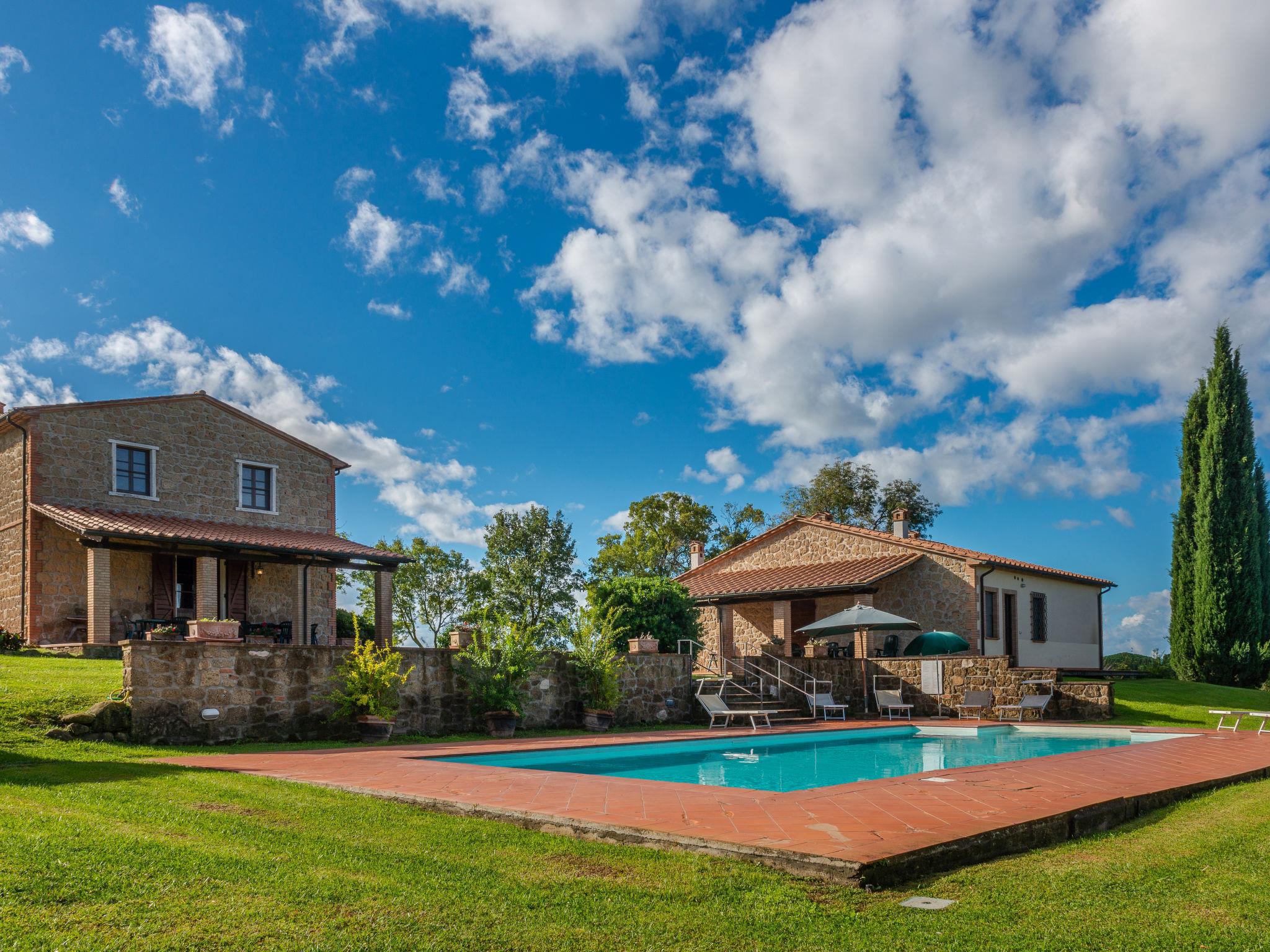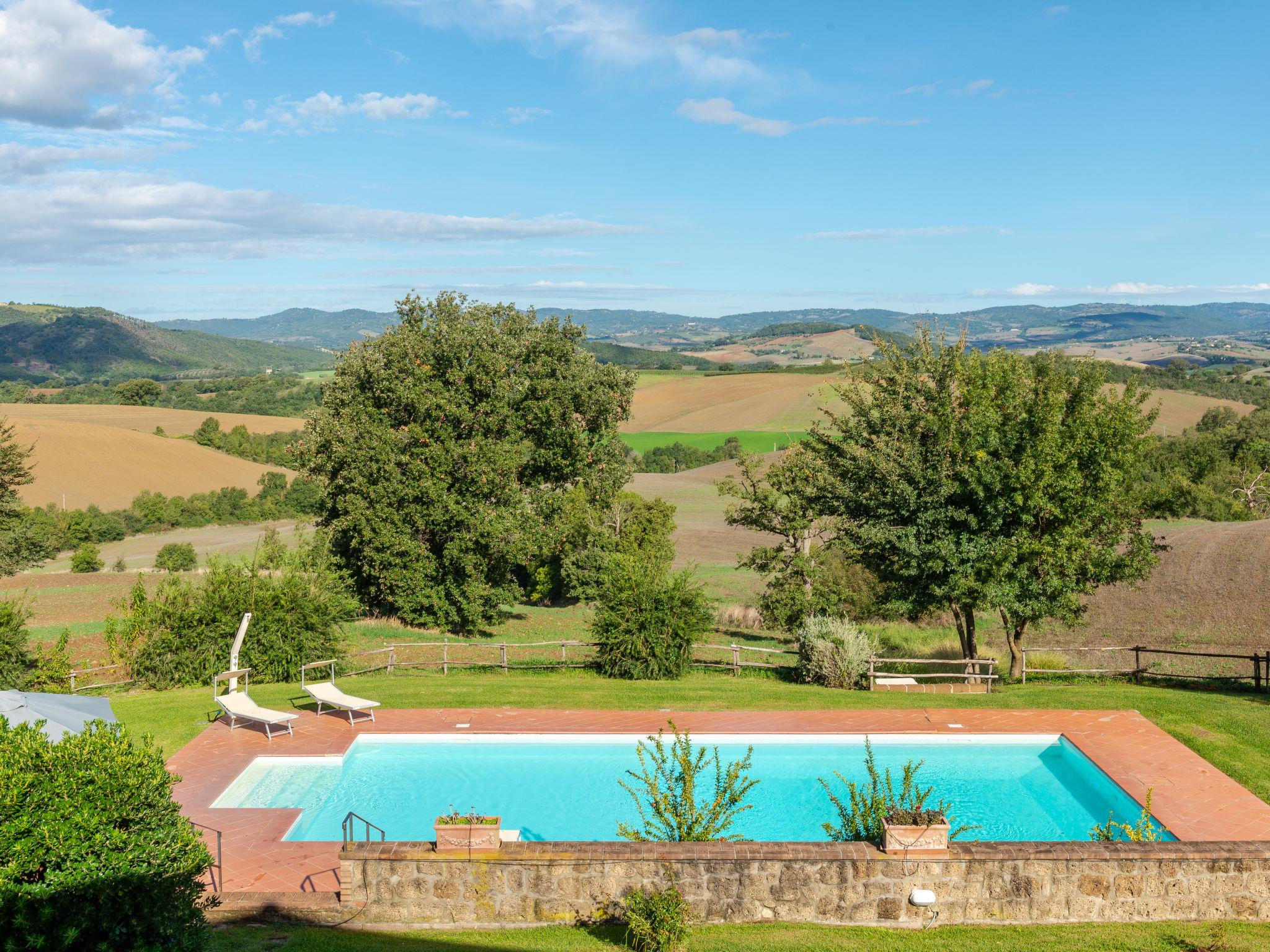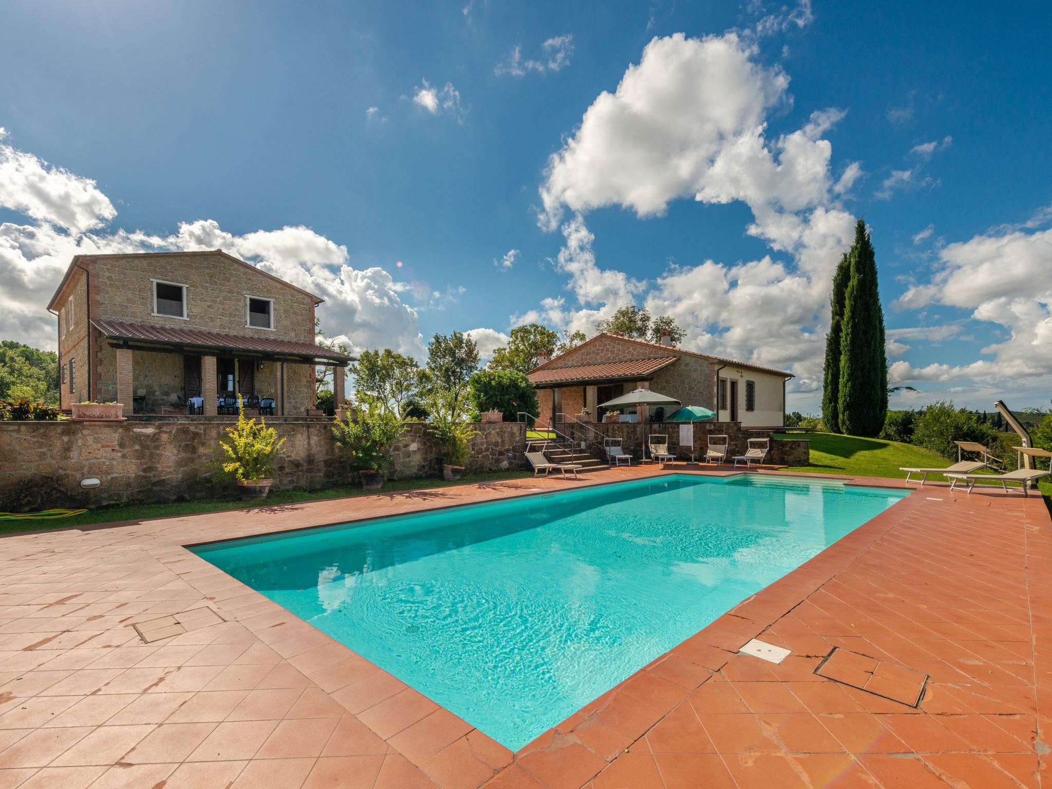 This property is situated in a dominant position among the gentle Maremma hills. The complex is part of an important farm with 330 ha grounds. The house, dating from the end of 1800, have been renovated with care of the architecture and traditions, such as the wonderful "travertino" stone staircase. It can host 11 people in total. Lots of privacy and large outdoor area with furniture to dine oudoors. On request it is possible to take part in the grape harvest, see the cows being milked and visit the zoological centre. Clients are greeted with 1 bottle of red wine and 1 bottle of white wine on the house. Siena 140 km, Fiumicino airport (Rome) are 140 km away. Beautiful country house, surrounded by trees and fields. Property composed of main house and outbuilding 10 km from the centre of Manciano, 25 km from the centre of Saturnia, in a quiet, sunny position on top of a hill, 25 km from the sea, in the countryside. Private: property 1'500 m2, garden (not fenced), swimming pool (14 x 7 m, depth 140 - 90 cm, seasonal availability: 30.May. - 01.Oct.) with internal staircase. Terrace, garden furniture, barbecue. In the house: internet access, WiFi, central heating system, washing machine. 300 m long motor access (via unmade road). Parking on the premises. Shop 8 km, restaurant 2 km, sandy beach 25 km. Golf course 15 km, tennis 10 km, riding stable 10 km. Nearby attractions: Saturnia 15 km, Pitigliano 30 km, Argentario 35 km, Albinia 25 km. Hiking paths: Parco Naturale della Maremma 45 km. Please note: car recommended.