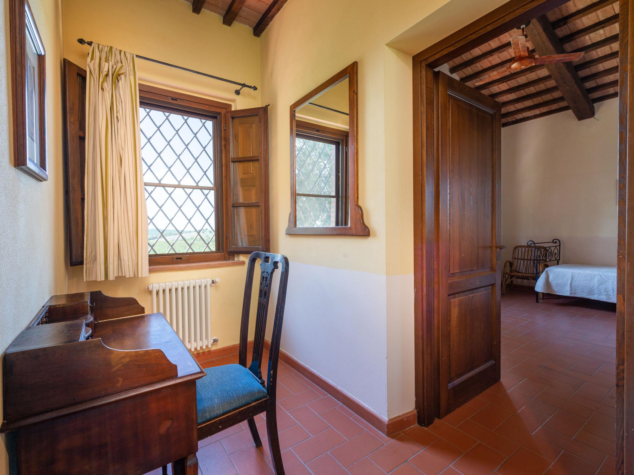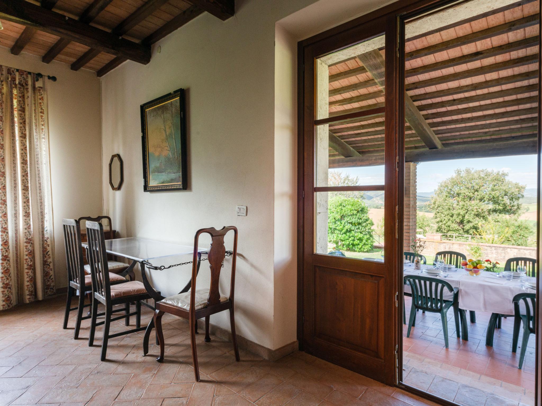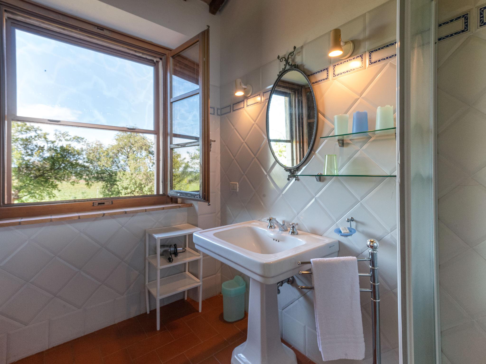 "Poggio Campana", 7-room house 370 m2 on 2 levels. Spacious, comfortable and tasteful furnishings: living room 40 m2 with open-hearth fireplace and TV. Exit to the garden, to the swimming pool. 1 double bedroom with shower/bidet/WC. 1 room with 1 bed, 1 double bed and shower/bidet/WC. Kitchen (4 hot plates, oven, dishwasher, toaster, freezer, electric coffee machine) with open-hearth fireplace and dining table. Exit to the terrace. Sep. WC. Upper floor: 1 double bedroom with shower/bidet/WC. 1 room with 2 beds. 1 double bedroom. Shower/bidet/WC. Gas heating. Natural stone floors. Comfortable furnishings in the country house style. 3 terraces covered. Terrace furniture, barbecue. Very beautiful panoramic view of the countryside. Facilities: washing machine, iron, mosquito net, children's high chair for up to 2 year olds, hair dryer. Internet (WiFi, free). Please note: maximum 2 pets/ dogs allowed. Private entrance. No internal connecting door between the separated properties. Main house approx. 240m², annexe of approx. 130m², approx. 20m away from each other and without internal connection. Main house: on the ground floor kitchen, large living room, separate toilet , on the 1st floor 2 double bedroom (one with shower/bidet/wc), 1 twin bedroom and a separate shower/bidet/WC. Annex: 1 twin bedroom with fireplace and ensuite shower/WC. 1 double bedroom with 1 extra bed and ensuite shower/WC (suitable for disabled). Living room with kitchenette and fireplace. IT053014B5TUJ7UD5C