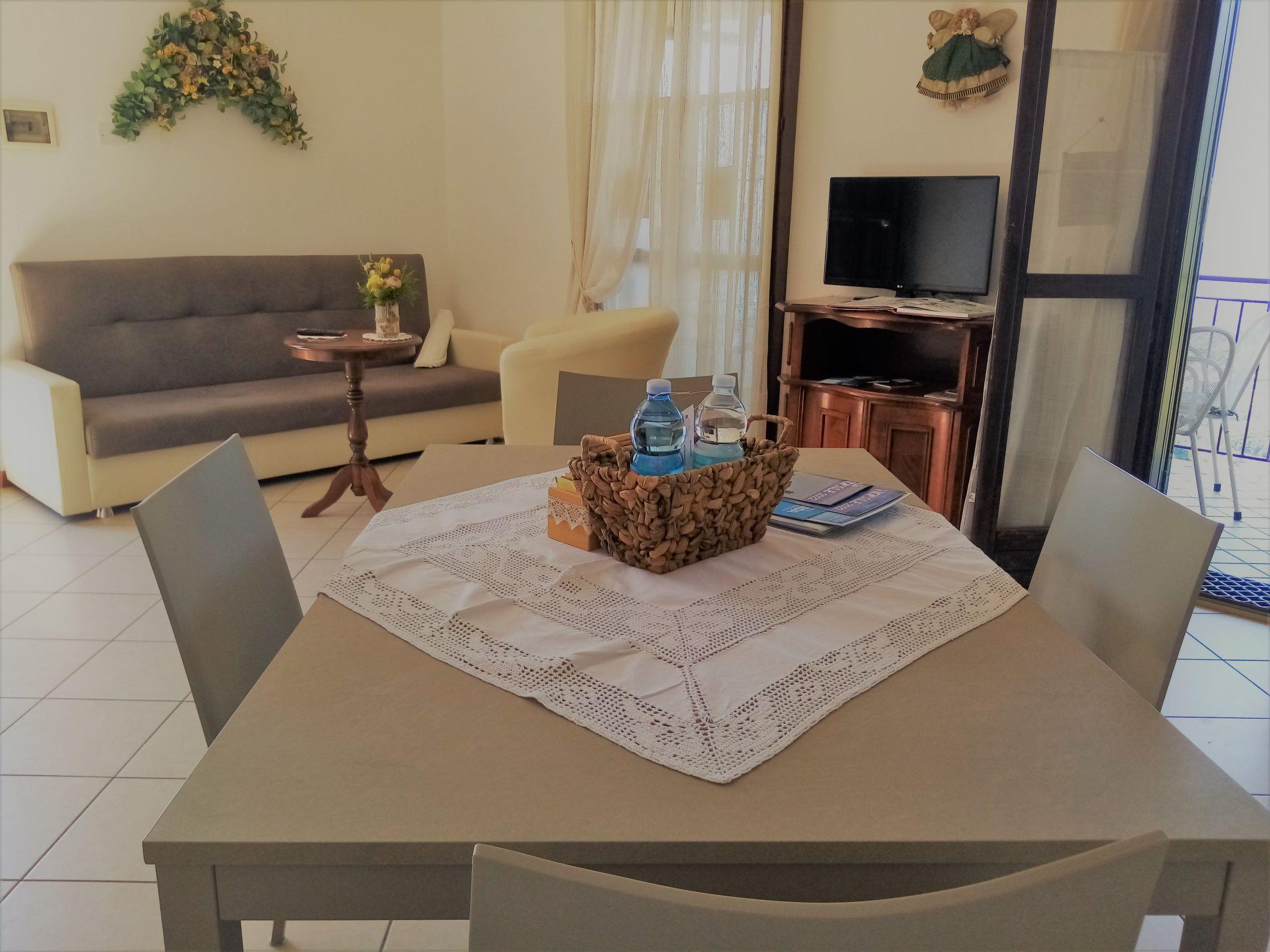 Inside, the flat welcomes its guests with a warm and inviting atmosphere. It consists of two bedrooms, one with a double bed (160 x 190cm) and the other with two single beds (80 x 190cm), ideal for a comfortable rest after a day of adventures. The bathroom is equipped with a shower and bidet, while the living room-kitchen, which serves as the heart of the house, is conveniently equipped with a comfortable sofa, satellite TV, a table with chairs and a kitchen complete with a gas cooker, microwave oven, toaster, coffee machine and refrigerator with freezer.