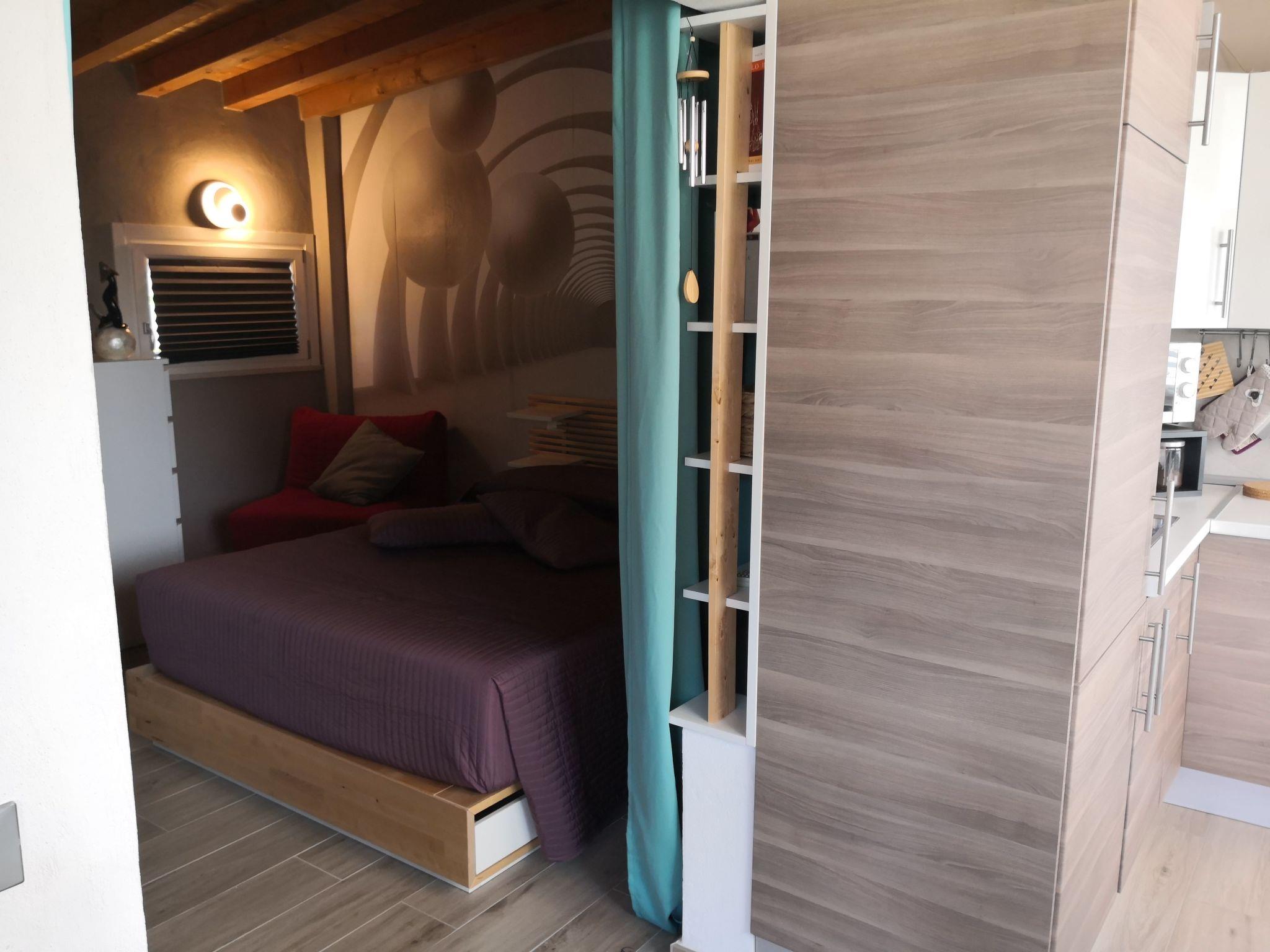 Internally, the flat has partial air conditioning to ensure comfort on hot days. The bedroom, which can be darkened, promises rest and privacy, while the living room is ideal for relaxing moments. The kitchen, equipped with an induction cooker and capsule coffee machine, offers everything you need to prepare delicious meals to be enjoyed in privacy. The flat also has a fan to keep the environment cool and pleasant.