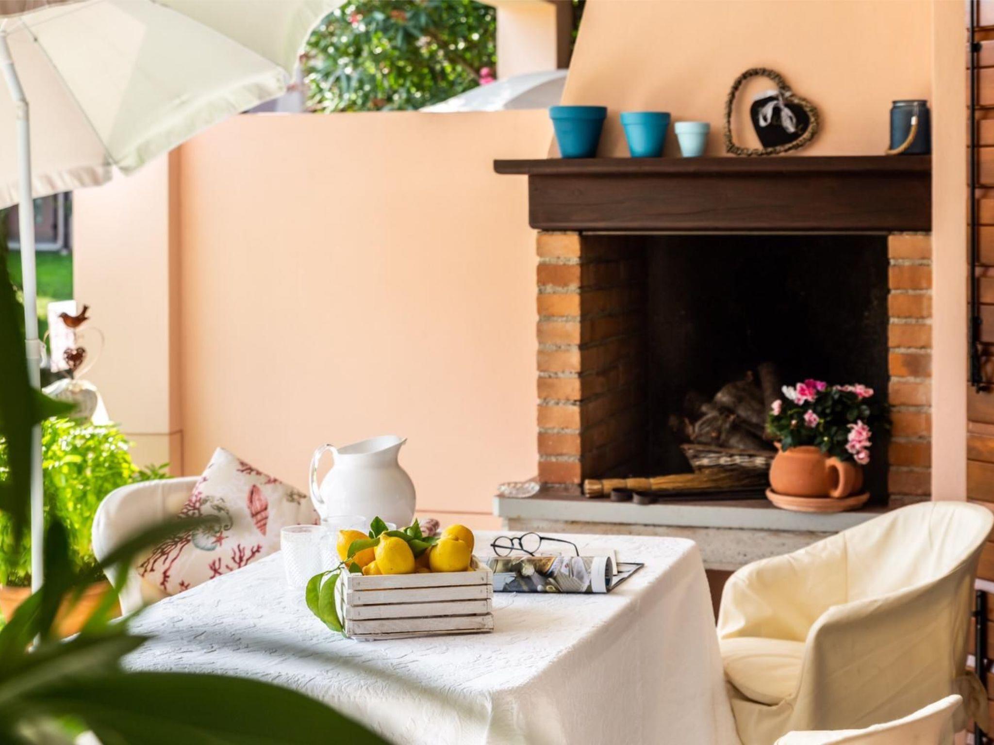 The porch is the size of a living room and is airy and shady even at midday. It has a red brick fireplace for grilling and a white plastic table and chairs. From here you can look out over the greenery and the pool.