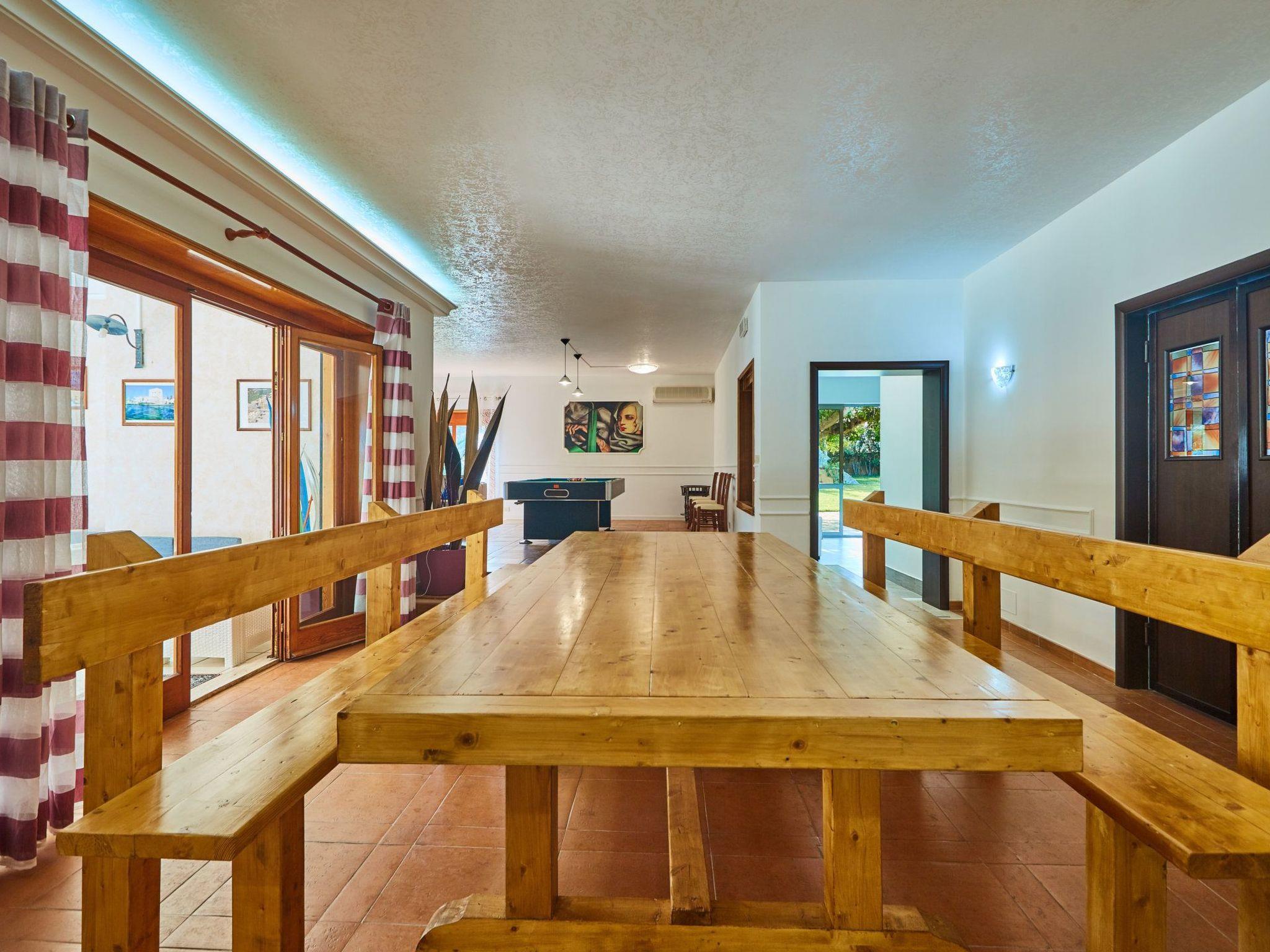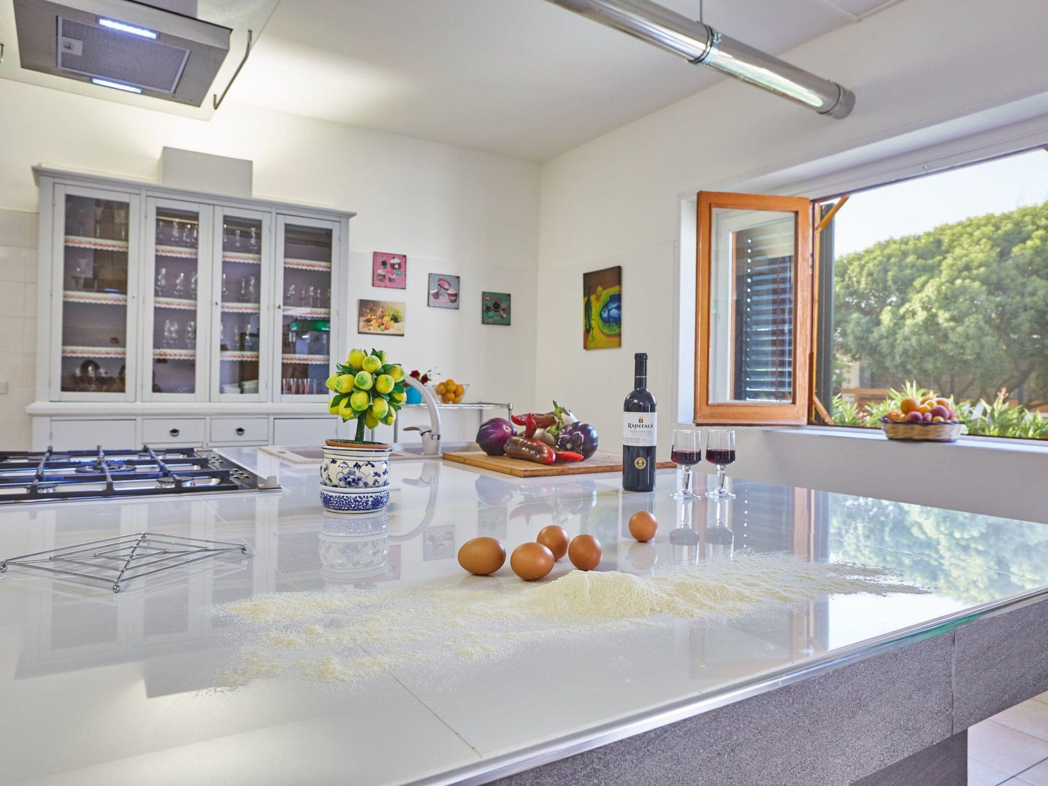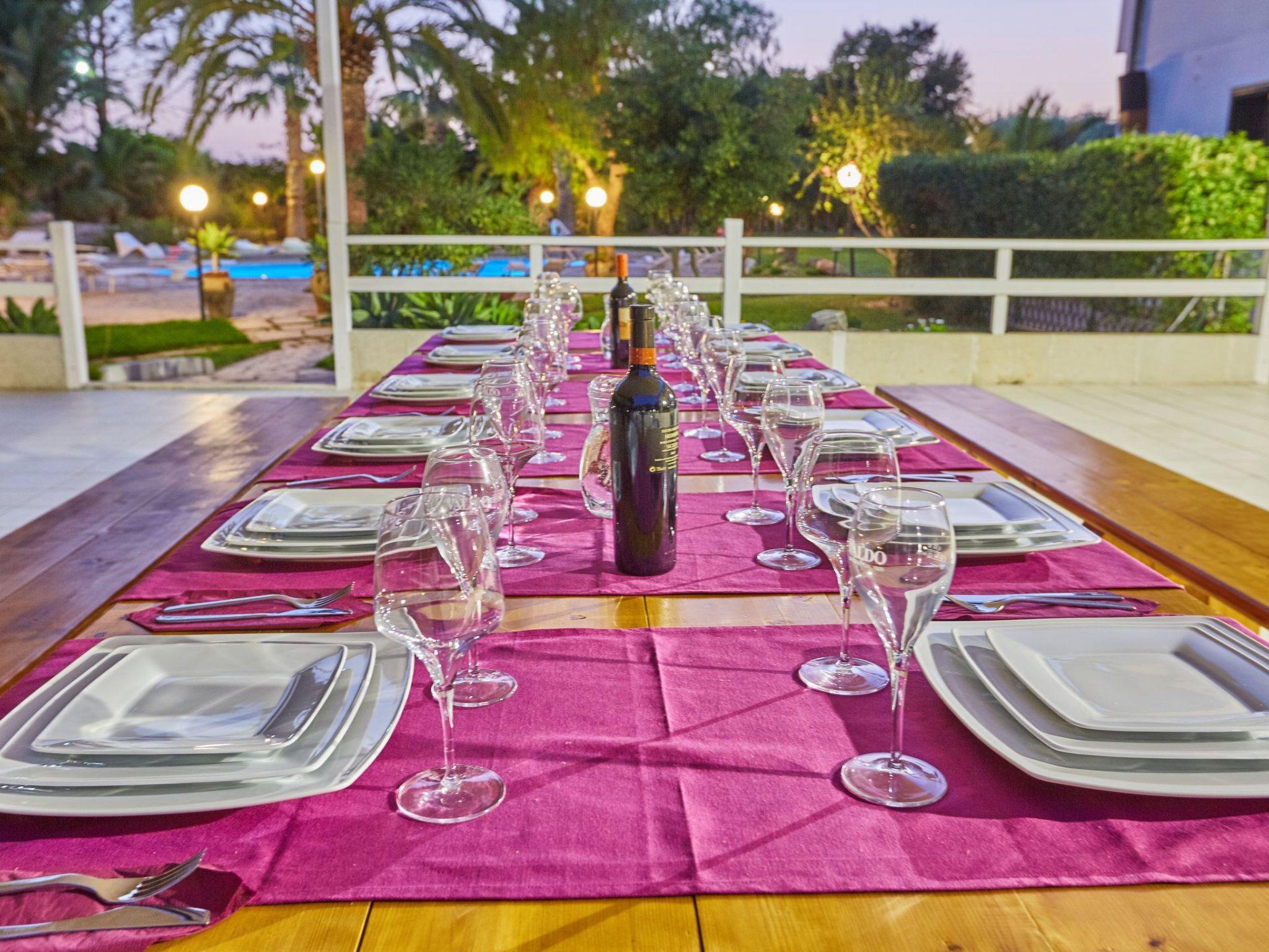 Leaving the room where there is the large table, there is a patio of about 50 square metres furnished with polirattan lounges and a table for 20 people where you can dine in the evening enjoying the coolness of the park. As soon as you pass through the entrance gate you have the feeling that you have arrived in a wonderful place, at guests' disposal there is a 10,000 square metre lawn, decorated and embellished with palm trees and centuries-old carob trees as well as many other species of Mediterranean plants. The park is criss-crossed with lanes of local white stone so that it already looks like a painting. Then we find a gazebo with a very large wooden table for sitting at the barbecue and in the immediate vicinity bordering on another area where there is a nice table tennis table, and further on, to the delight of the little ones, there is a small recreation area. Continuing the walk, we come to the centrepiece of the park, a large inregular swimming pool and all around sun loungers with sunshades and 2 round wrought-iron tables with chairs so that you can spend days in absolute relaxation. About 15 metres away is a semi-covered terrace with sails and furnished with polirattan loungers, all adjacent to the kitchen.