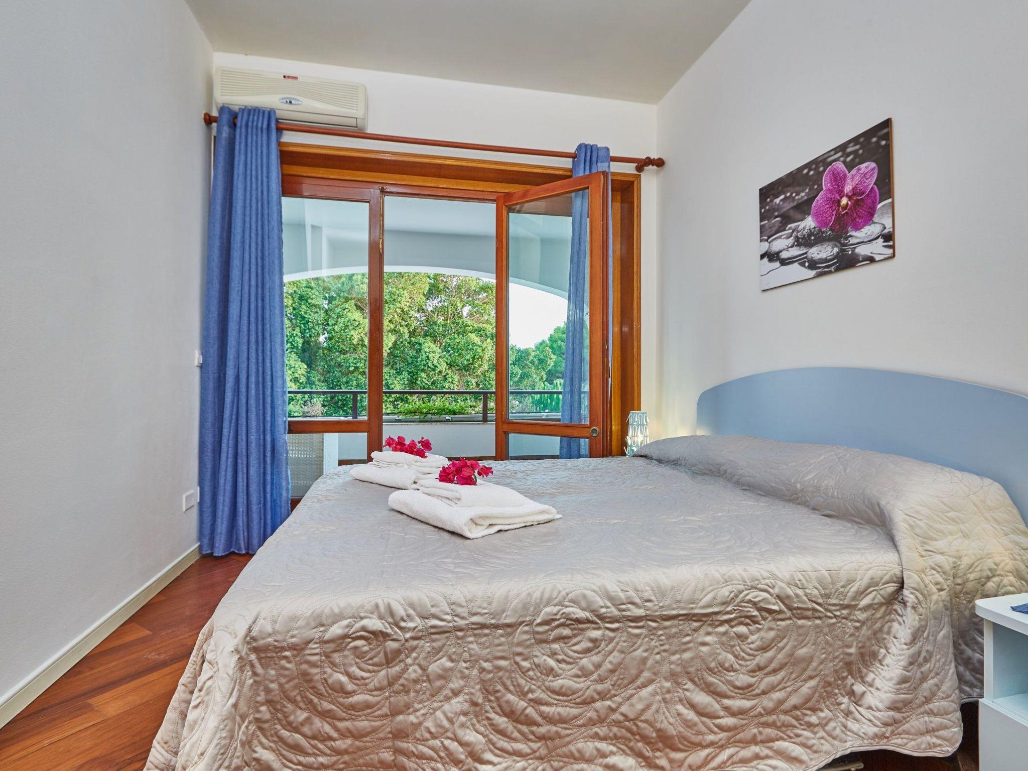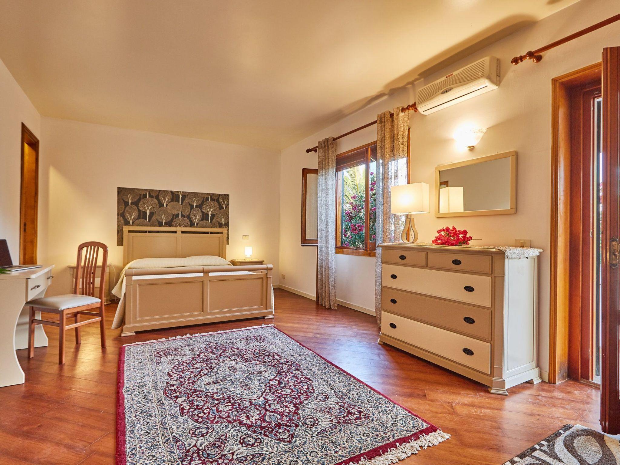 On the ground floor there is a large table where you can have lunch or dinner for about 15 people. Further on there is a billiard room, table football, 2 sofas and a Hi-Fi. Here you can put in your pen drive or CD or listen to the radio both inside and outside via a switch and hear the music by the pool. To the side of this room is the living area where there are 4 sofas seating 3 each and a beautiful flat screen TV with satellite, DVD supported by a shelf with books and a magnificent window to admire the surrounding park, the whole building is air conditioned. Also on the ground floor there is a very large kitchen measuring about 50 square metres with a work cube measuring 2x2 metres where there is a hob with 5 burners, an oven, a washbasin and various drawers with various utensils (plates, glasses, cutlery, pots, pans, etc., all for 20 people), a tall fridge freezer and two large fridges. The kitchen area is completed by a dishwasher and washing machine as well as various worktops. We go up to the first floor of about 160 square metres accessed via a beautiful wooden staircase where all the rooms are reached via a parquet corridor. The rooms are all equipped with air conditioning, toilet, bidet, shower, sink, room No. 1 is the most 'beautiful furnished in a very fine way with Persian carpet and sofa bed and enjoys a large terrace overlooking the sea furnished with a white polirattan lounge (shared with 2 other rooms) with a magnificent view of the park, then there are 2 single rooms and 5 other elegantly furnished double rooms, all overlooking the park or swimming pool.