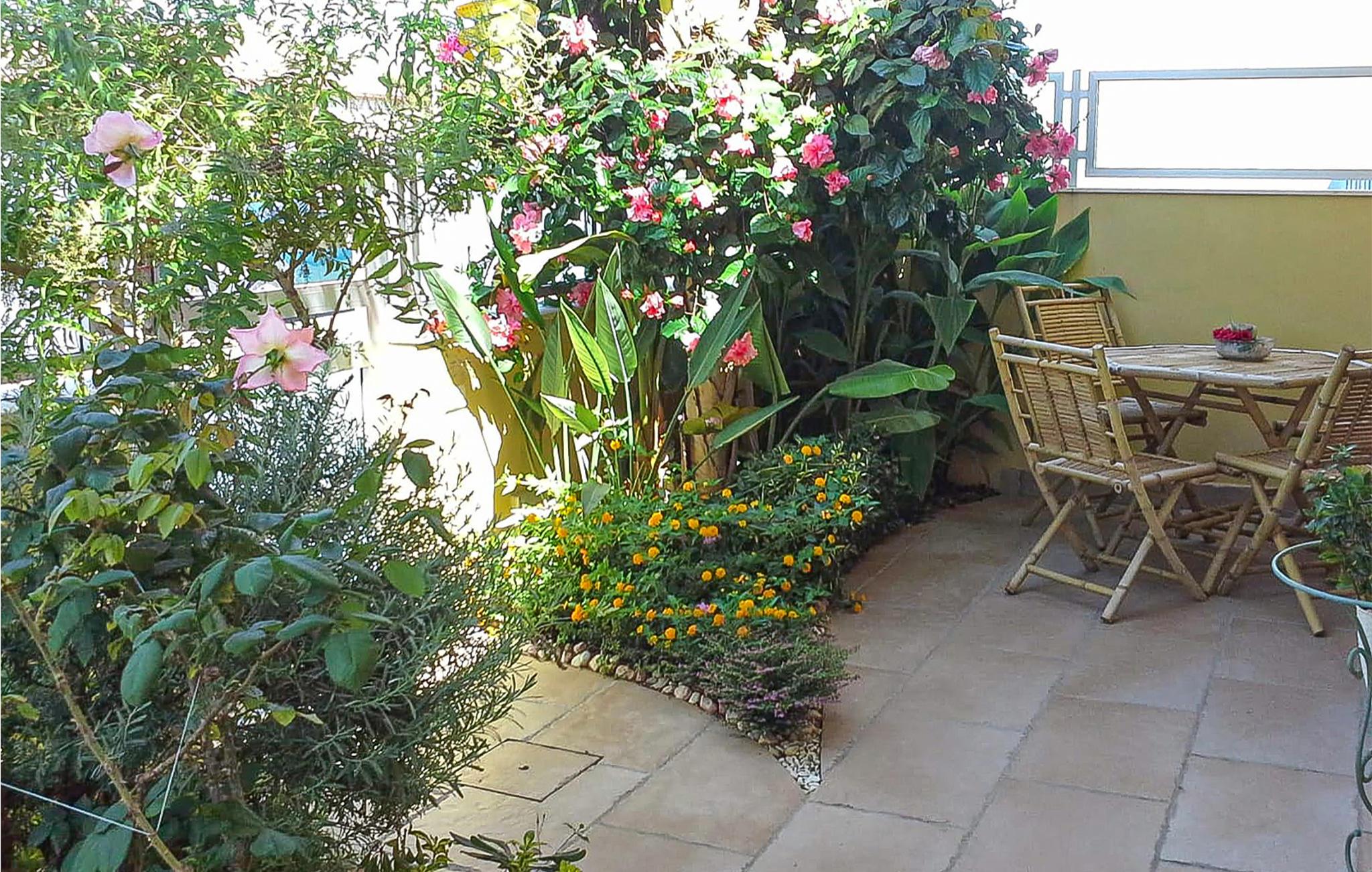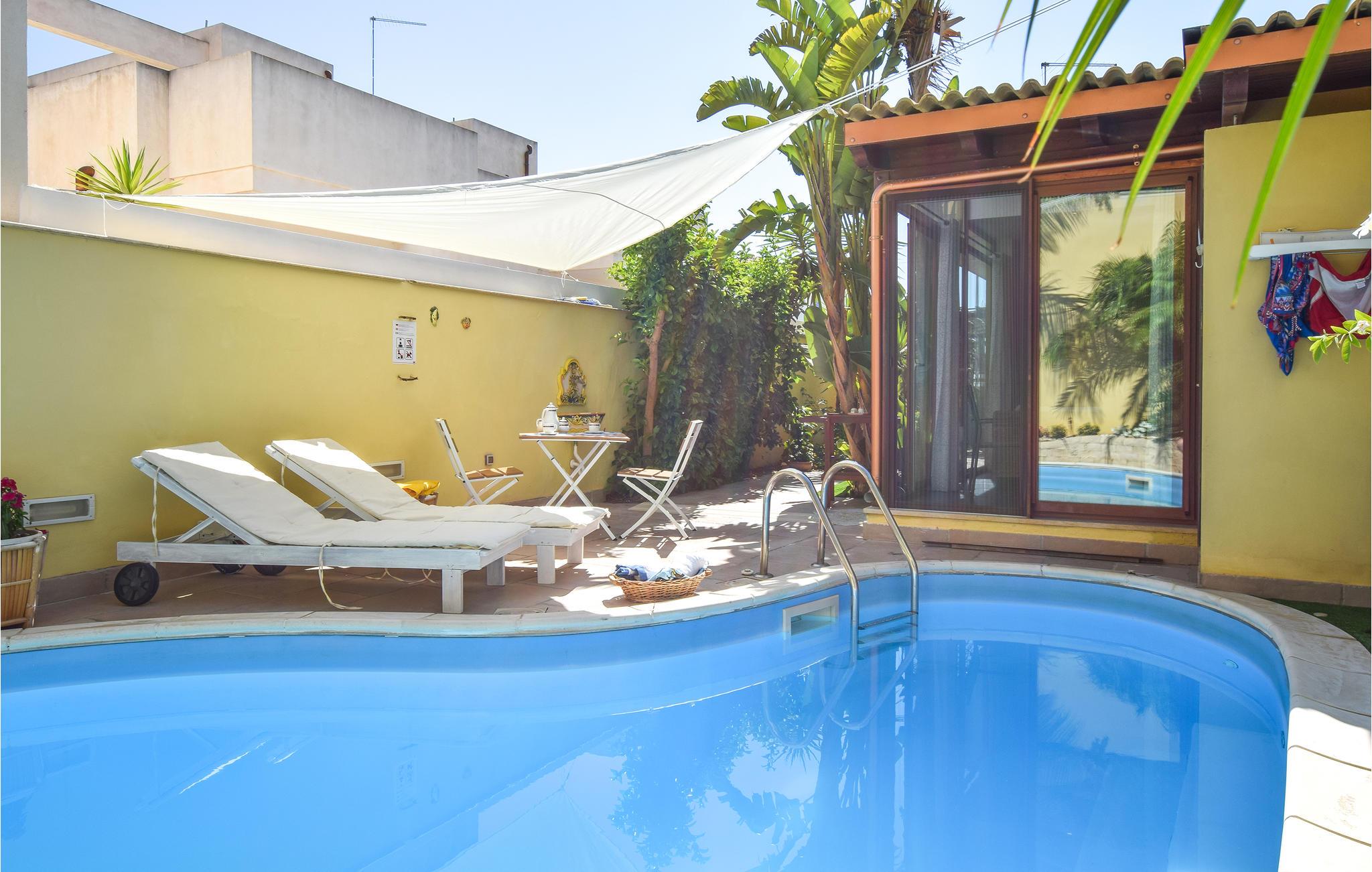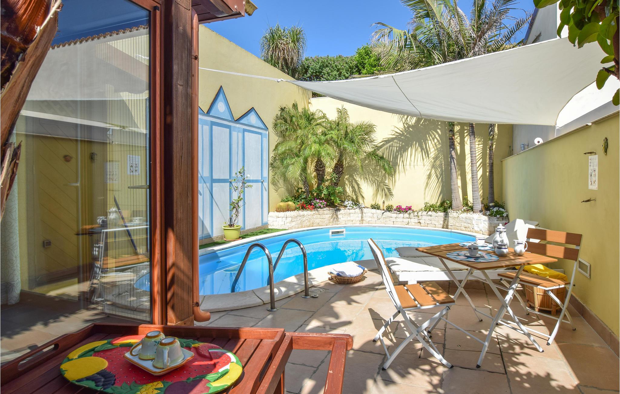 Huset har en solrig udendørs veranda, et siddeområde udstyret med havemøbler og en pool (dybde 1,20 m - 2,40 m) med et hydromassagehjørne til to personer samt en udendørsbruser.