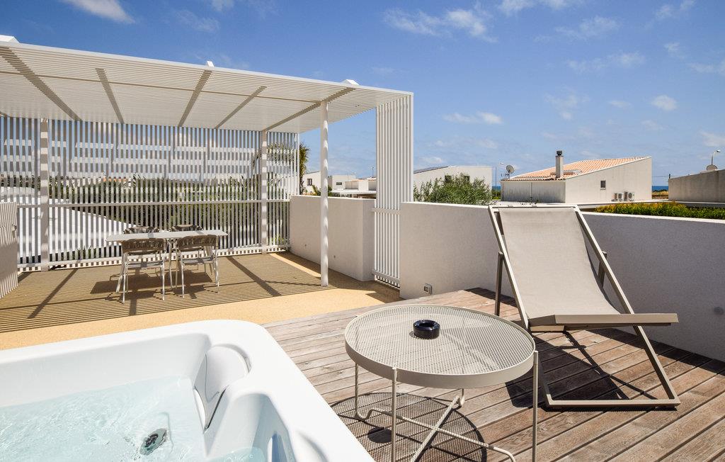 Solbad på terrassen med udsigt til den velholdte have. Senere kan I svømme et par omgange i poolen og afslutte dagen med et beroligende bad i spabadet under stjernehimlen.