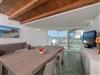 The living room is very bright and panoramic thanks to large glass walls overlooking the terrace and is furnished with a dining table, TV and sofa bed.