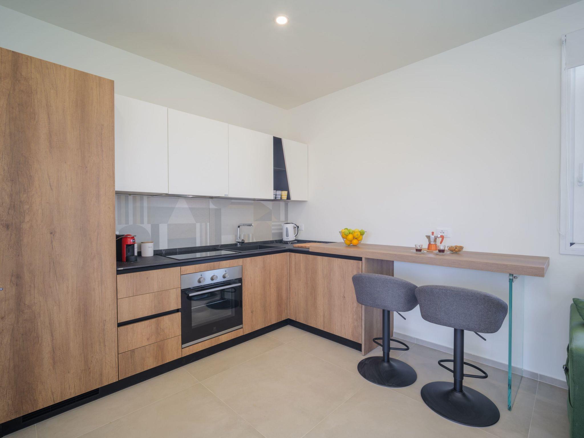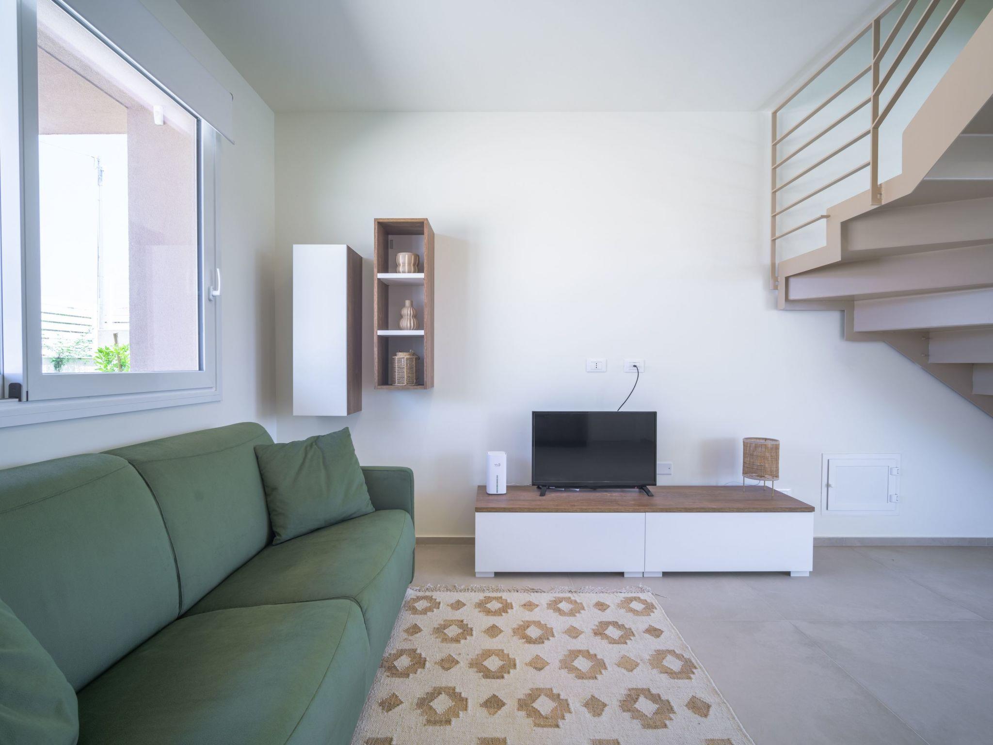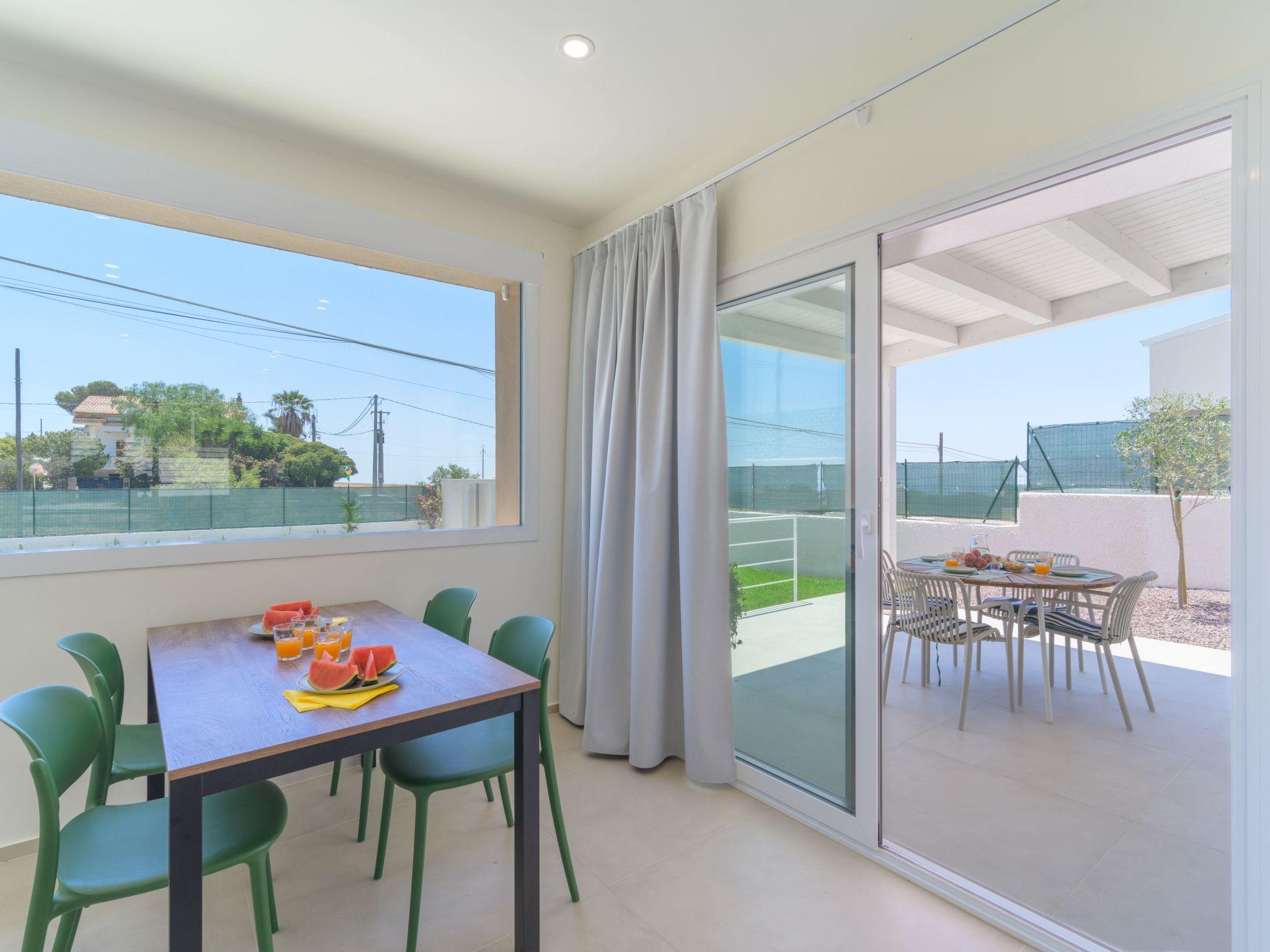 The living area, which overlooks the pool area and terrace, is furnished with a lounge (double sofa bed), smart TV and dining table.