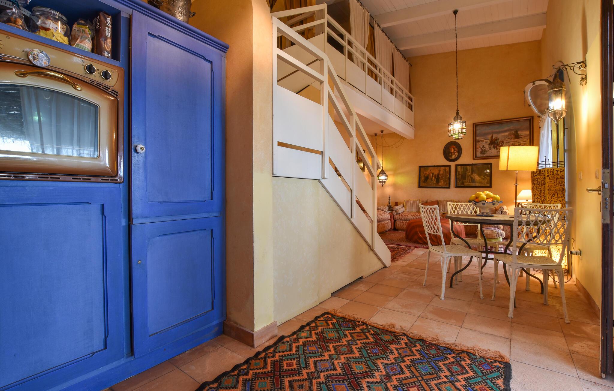 Træd ind i dette unikke feriehus og fordyb jer i en verden af ??varme farver og kunstneriske detaljer. Interiøret er designet i arabisk stil og møbleret med marokkanske møbler og dekorationer. Slap af i de komfortable sofaer og nyd den hyggelige atmosfære under de høje lofter. Ornamenter, tæpper og stilfulde lamper giver værelserne en karakteristisk karakter. Brug den åbne stue og spisestue til afslappende øjeblikke eller træk jer tilbage til galleriet. Det kompakte køkken er farverigt designet og funktionelt udstyret, så I nemt kan tilberede jeres måltider.