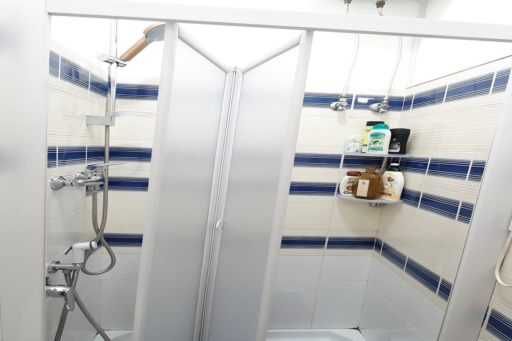 På 1. etage: (Stue(dobbeltsovesofa, Fjernsyn), åbent køkken(kogeplade, kogeplade, komfur, komfur, kaffemaskine, kaffemaskine, køleskab, køleskab), soveværelse(dobbeltseng), badeværelse(bruser, håndvask, toilet, bidet, føntørrer)) varme(elektrisk), klimaanlæg, terrasse, havemøbler, parking lot(public)