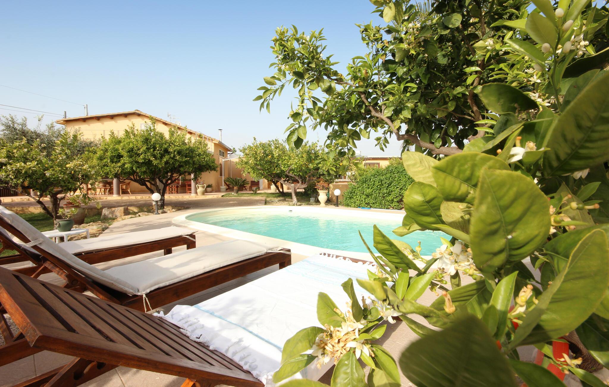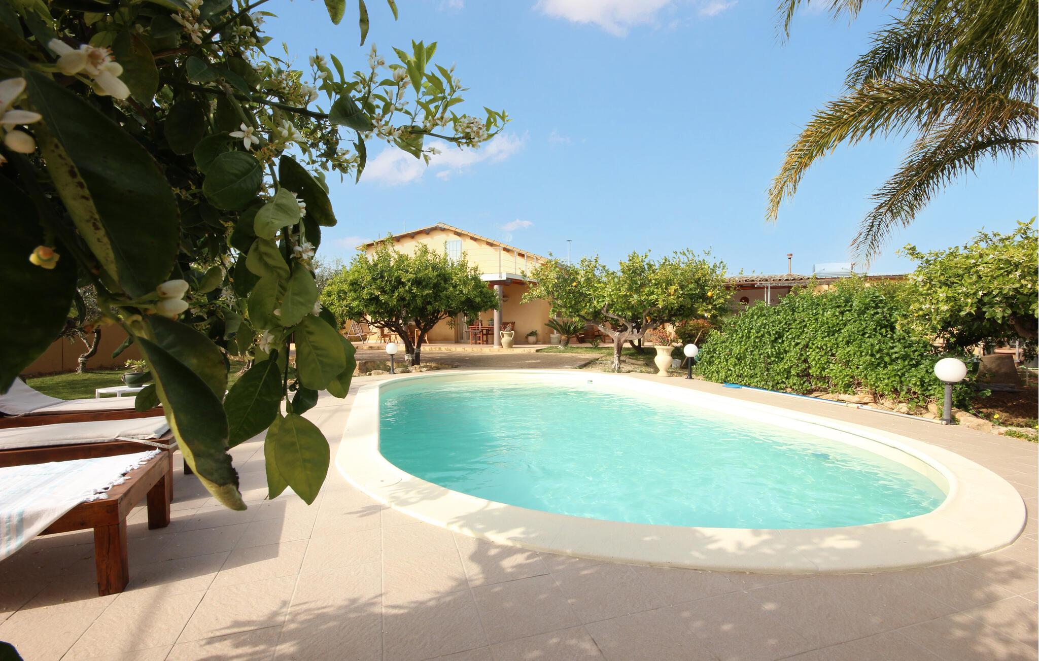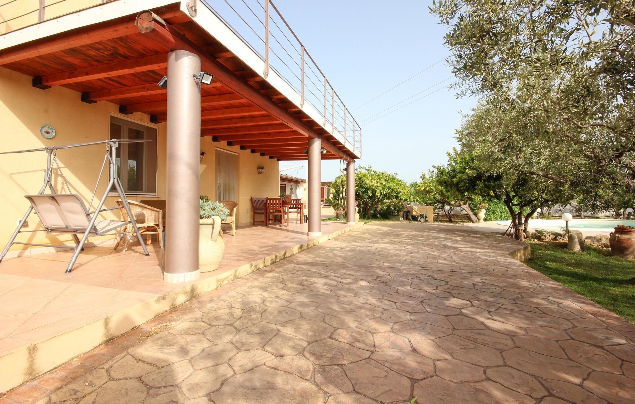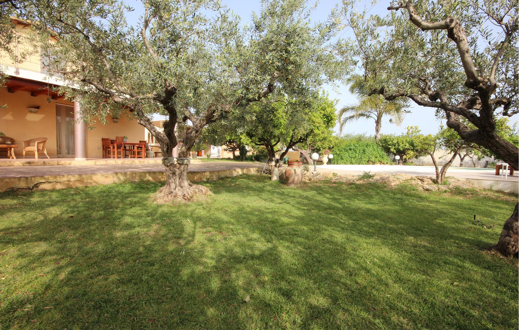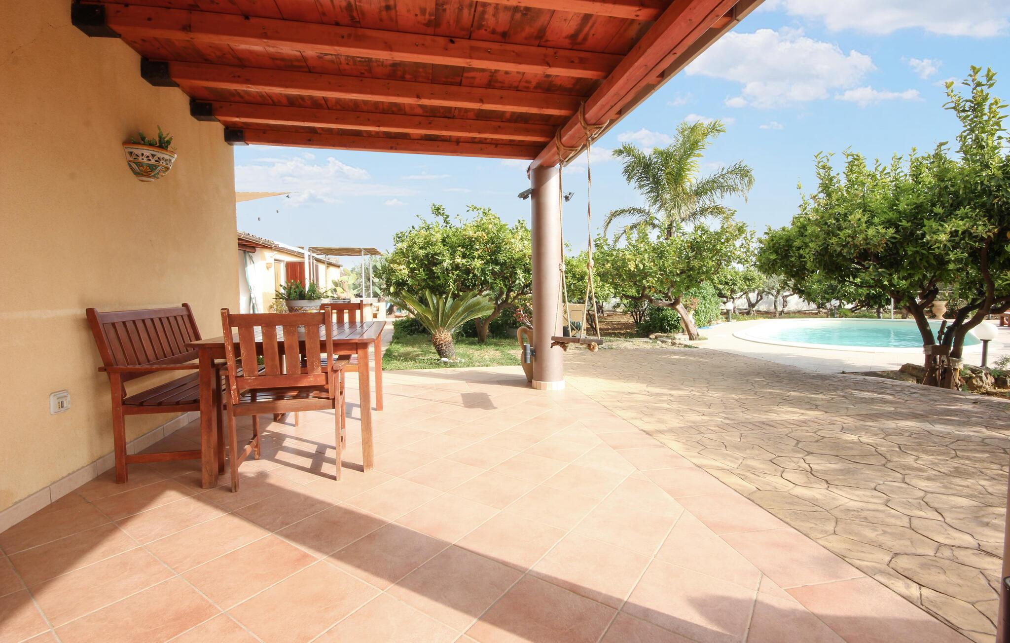 Dette feriehus er et tidligere bondehus, der nu gennem renovering er forvandlet til et fritliggende lille feriehus og ligger ca. tre km fra byen Memfi, på en lille privat grund på en bakke, der falder ned mod havet. Nyd de rolige omgivelser med panoramaudsigt ud over landskabet, blot fire km fra havet (luftlinje – i bil en seks km lang tur). Foran feriehuset ligger den store terrasse med havemøbler og en citrusplantage, et godt udstyret udendørs køkken med stengrill og stenovn. Slap af i den lille ovale pool. Fra den rummelige kombinerede opholds- og spisestue (tv med satkanaler, musik- og klimaanlæg) med sovesofa er der to udgange til haven. I soveværelset med dobbeltseng på første sal er der også klimaanlæg. Enkel og praktisk indrettet. Parkeringsplads med fjernstyret port. Af Afstande: 3 km Menfi (butikker og restauranter), 6 km Fiori med sandstrande; in ca. 10 km det skønneste kystafsnit med klipper og lune sandbugter (naturbeskyttet område) og Portopalo, en berømt badeby med sandstrand og lille marina, 12 km Selinunte (berømt arkæologisk udgravning); 18 km Sciacca en betydningsfuld by på Sydvestsicilien; 70 km Agrigento med den verdensberømte Templets dal.