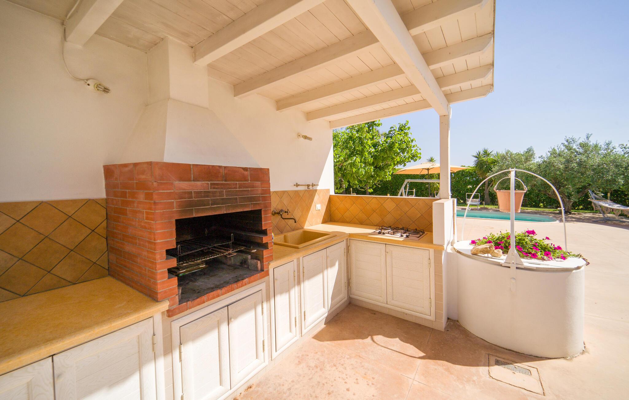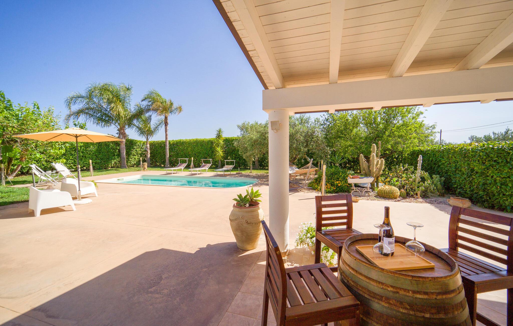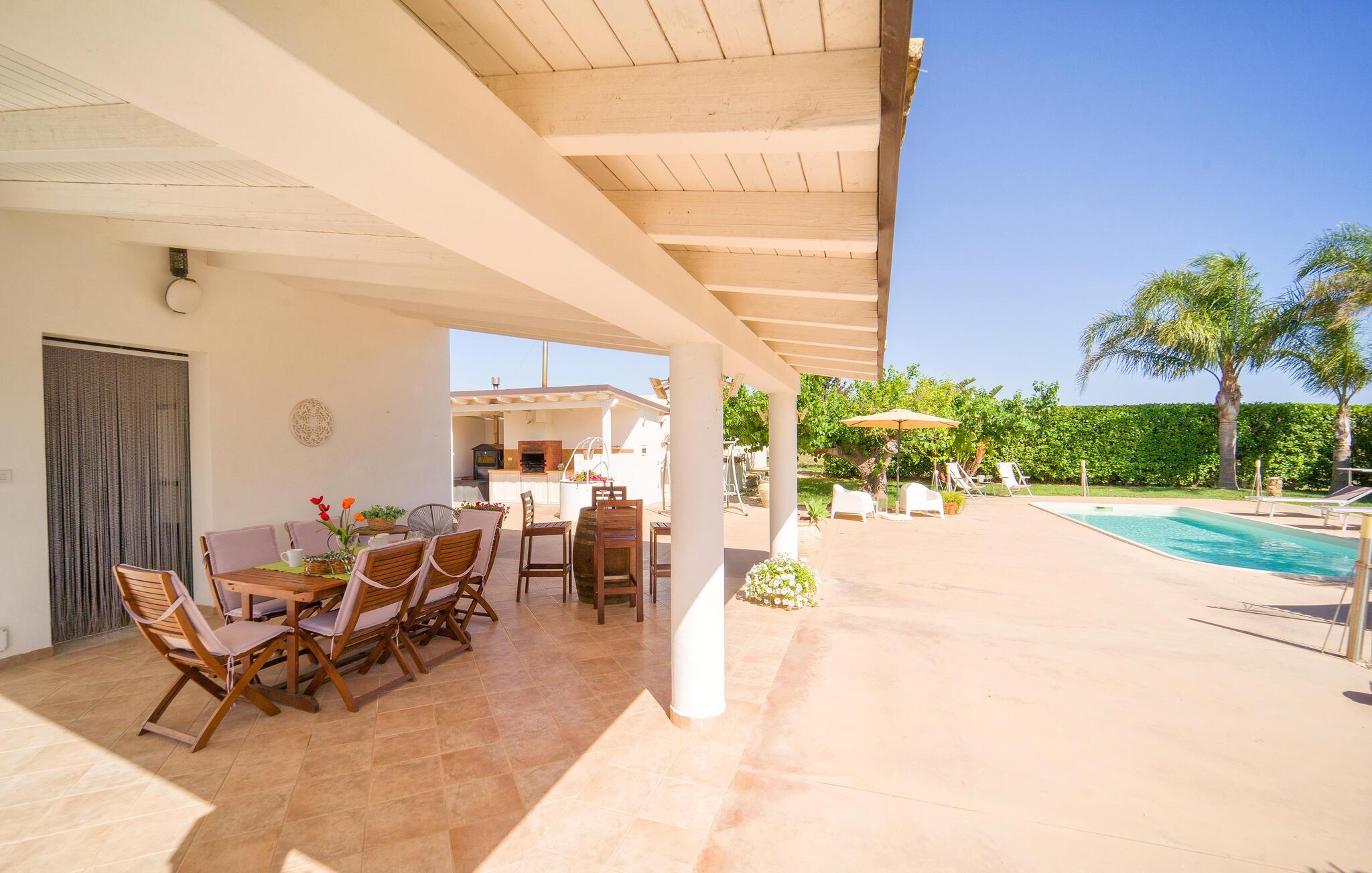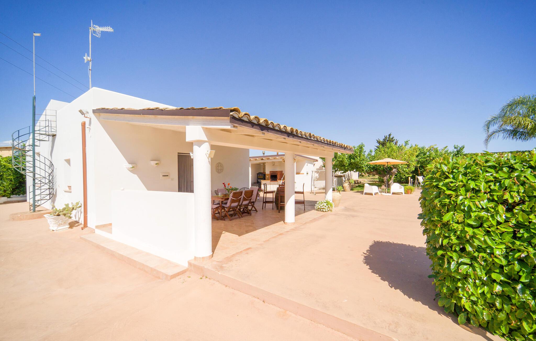 Dejligt hus med privat pool på landet, kun få km fra Menfi, et område kendt for fremragende gastronomi og vin af høj kvalitet. Ejendommen strækker sig over en enkel etage med stort udendørsområde. Verandaen er indrettet til, at I kan slappe af på varme sommerdage og nyde jeres måltider i det fri. Et praktisk udendørskøkken står til jeres rådighed. De dejlige sandstrande af Menfi er også velegnet til familier med små børn (Lido Fiori og Porto Palo). Der er 10 km til kurbadene i Montevago og 20 km til dem i Sciacca. 90 km til Agrigento med den berømte templernes dal. 90 km til Trapani (lufthavn). 120 km til Palermo. Mod reservation og betaling kan husejeren arrangere middage og temaaftener.