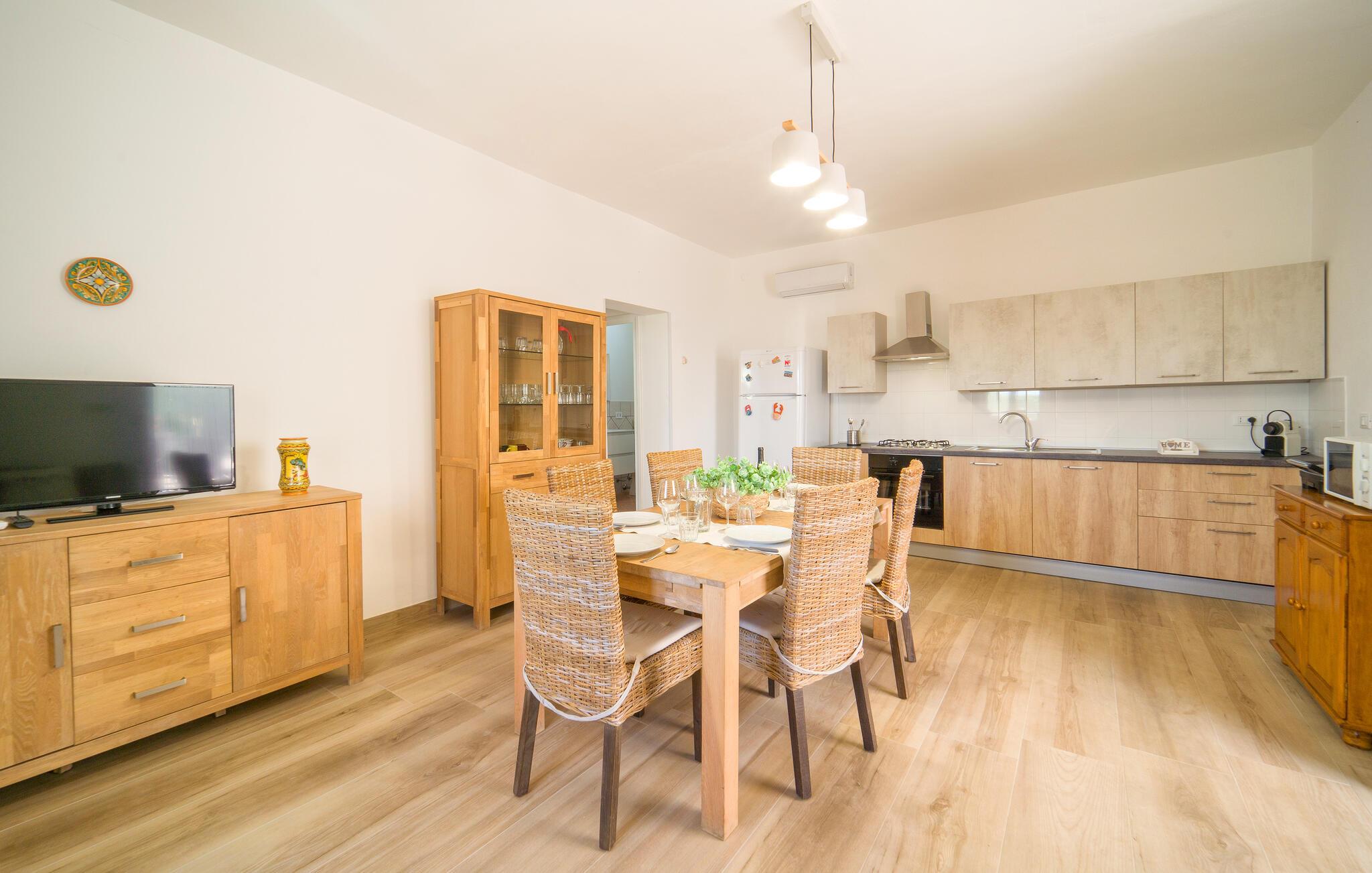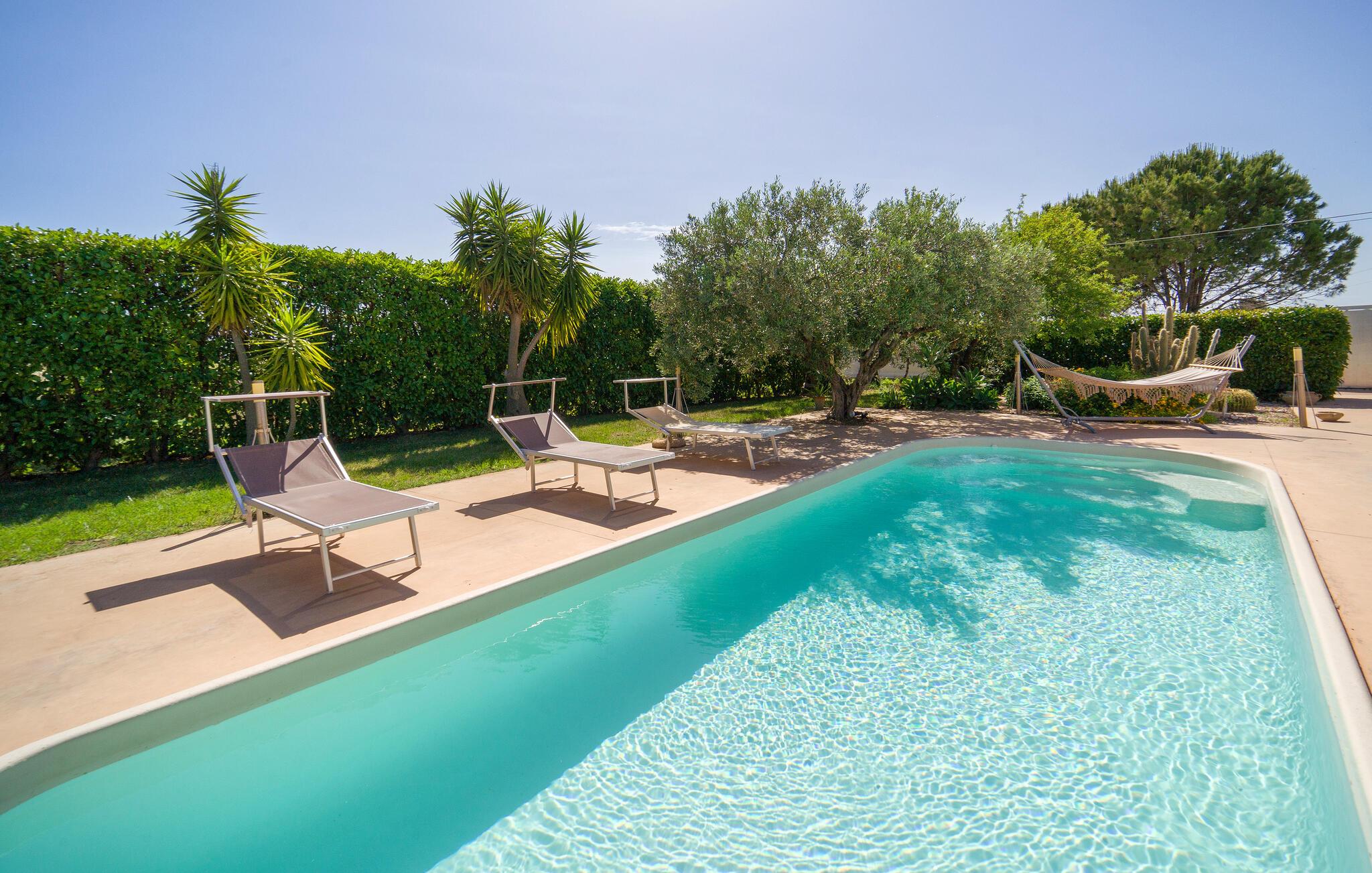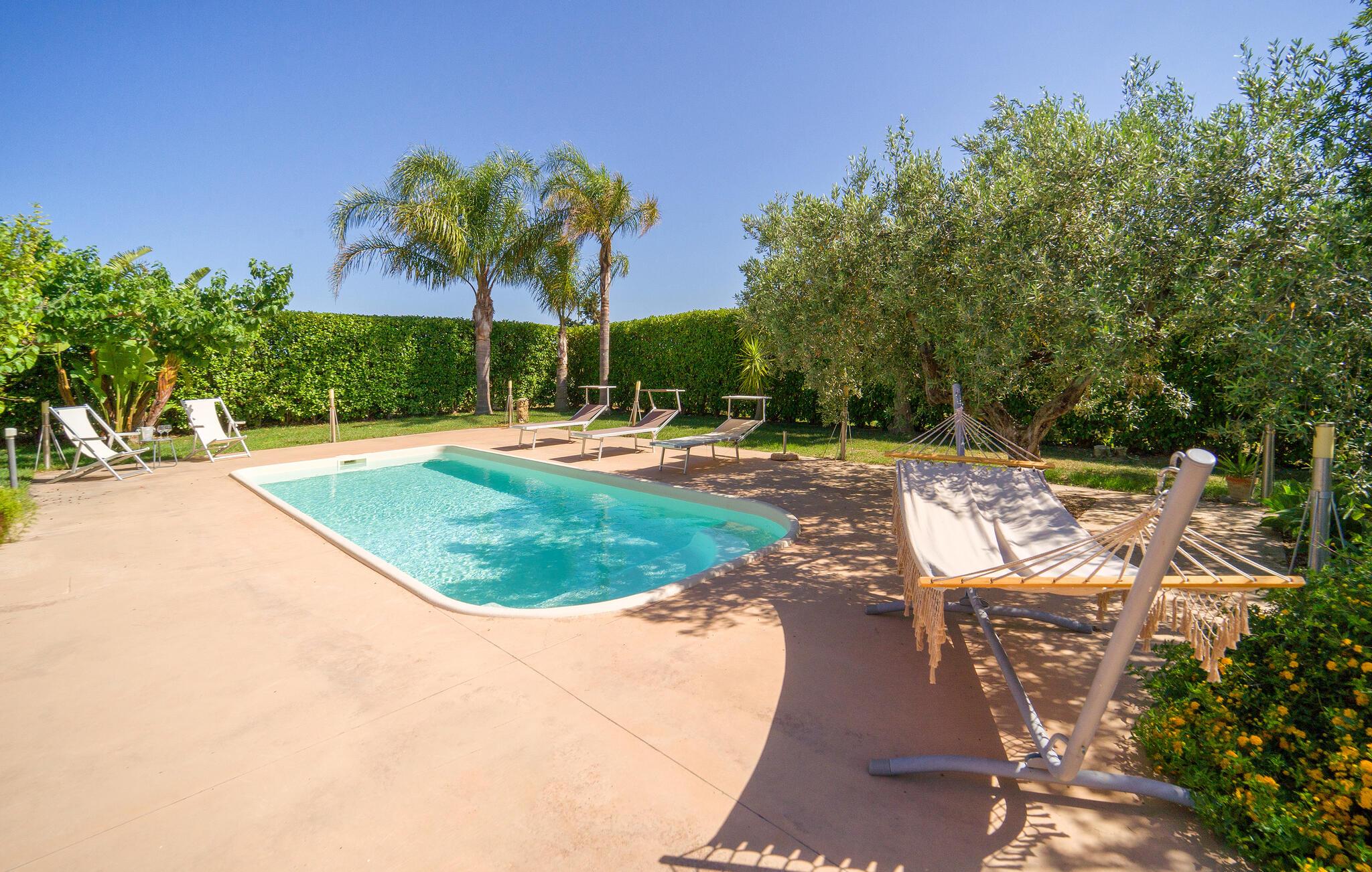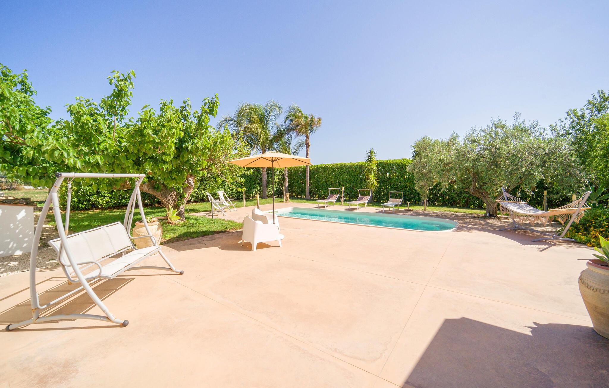 Dejligt hus med privat pool på landet, kun få km fra Menfi, et område kendt for fremragende gastronomi og vin af høj kvalitet. Ejendommen strækker sig over en enkel etage med stort udendørsområde. Verandaen er indrettet til, at I kan slappe af på varme sommerdage og nyde jeres måltider i det fri. Et praktisk udendørskøkken står til jeres rådighed. De dejlige sandstrande af Menfi er også velegnet til familier med små børn (Lido Fiori og Porto Palo). Der er 10 km til kurbadene i Montevago og 20 km til dem i Sciacca. 90 km til Agrigento med den berømte templernes dal. 90 km til Trapani (lufthavn). 120 km til Palermo. Mod reservation og betaling kan husejeren arrangere middage og temaaftener.