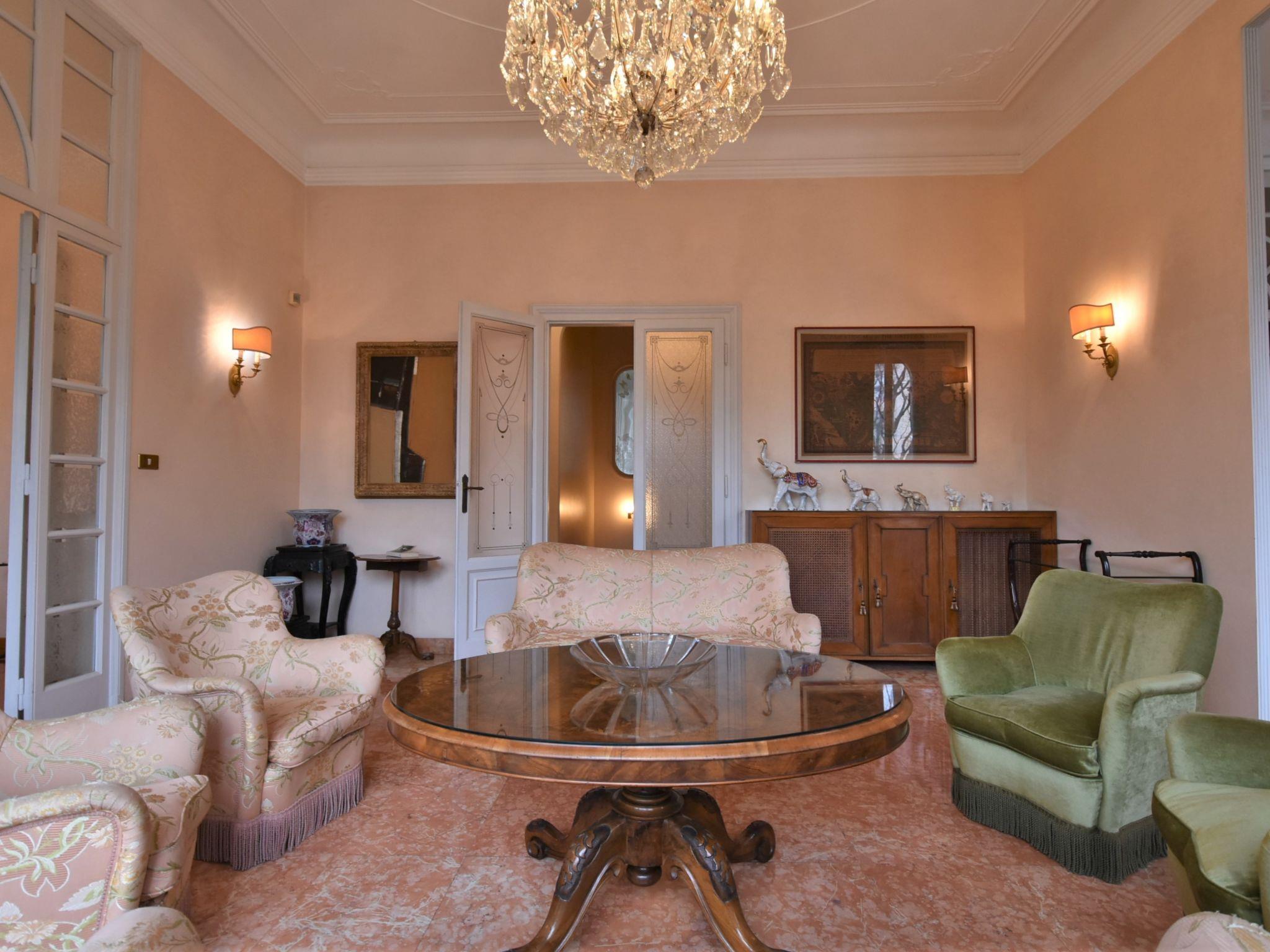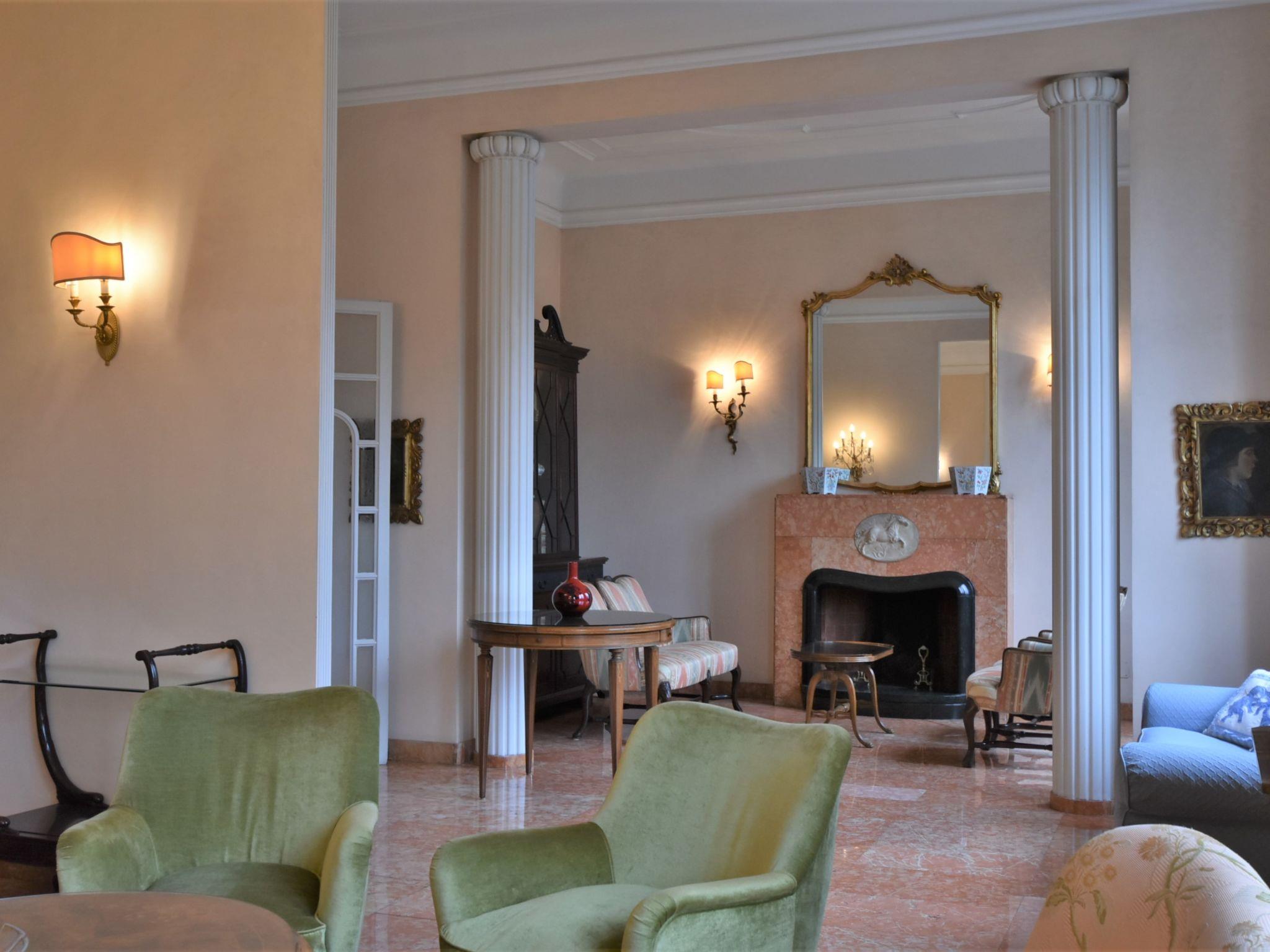 7-room apartment 300 m2 on 2 levels on 2nd floor. Spacious and bright, antique and tasteful furnishings: large living room 100 m2 with open-hearth fireplace (only for decoration), dining table. Exit to the balcony. Large dining room with dining table. Exit to the balcony. 1 double bedroom with TV, radio, CD-player, hi-fi system and air conditioning. Exit to the balcony. 1 room with 1 bed and separate WC. Kitchen (oven, dishwasher, 4 gas rings, toaster, kettle, microwave, electric coffee machine, Capsules for coffee machine (Nespresso) free). Exit to the balcony. Shower/bidet/WC. On the lower ground floor: 1 large room with 1 bed (80 cm, length 180 cm), 1 sofabed (110 cm, length 180 cm), 1 sleeping facility (100 cm, length 190 cm), air conditioning. 1 large double bedroom with shower/bidet/WC and air conditioning. 1 double bedroom. Exit to the balcony. Bath/shower/bidet/WC. Heating. Parquet floors, natural stone floors. Garden. Terrace furniture. View of the garden and the city. Facilities: washing machine, dryer, iron, children's high chair, baby cot, hair dryer. Internet (WiFi, free). Please note: suitable for families. Non-smoking house. IT015146C2HMAIE5CX