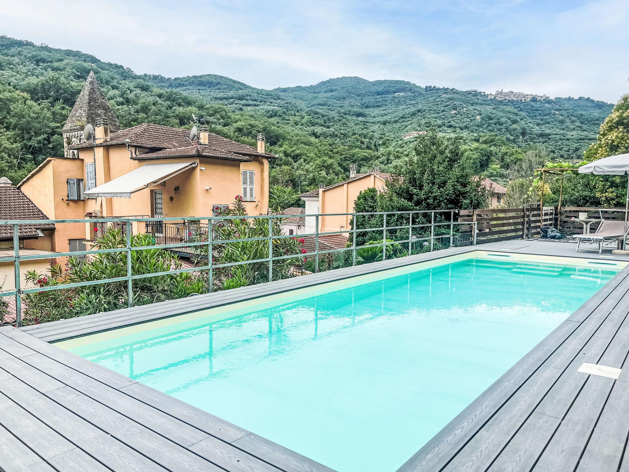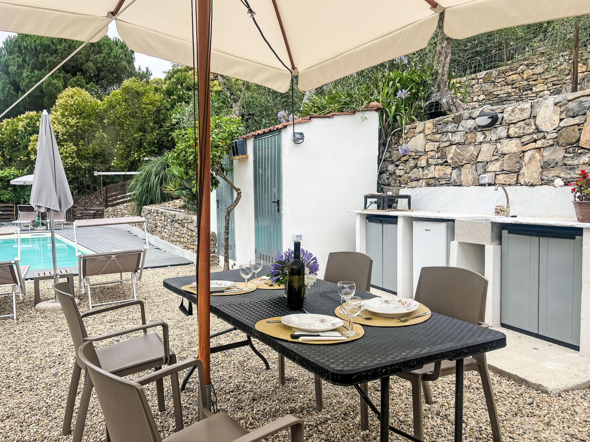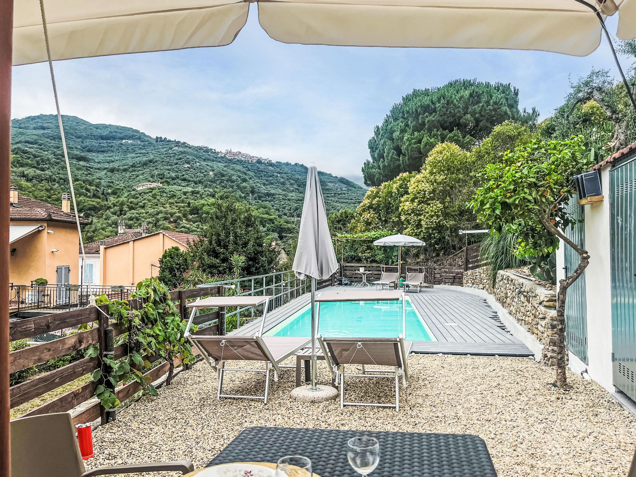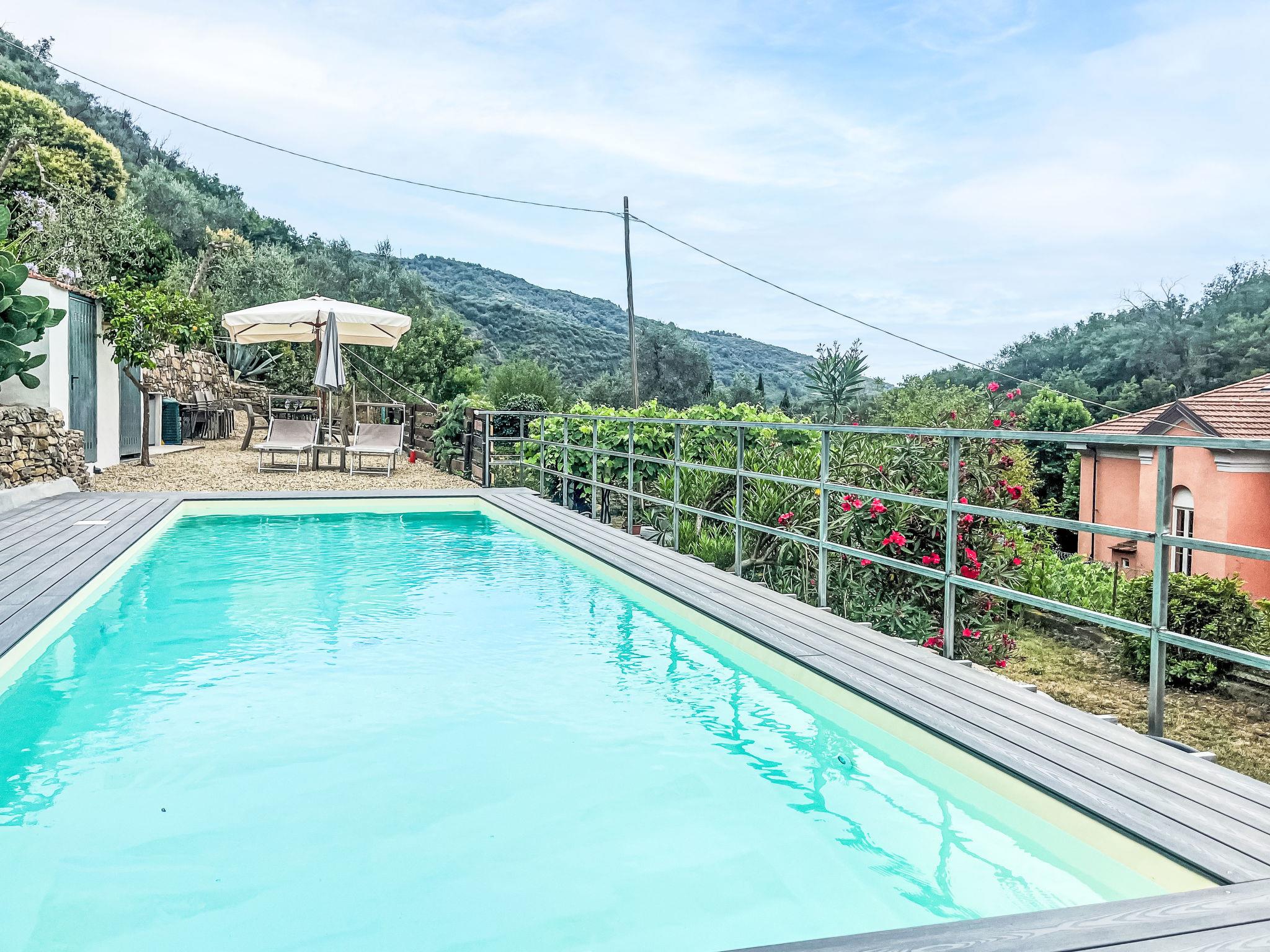 Agriturismo "Borgo Olimpo", 2 storeys, renovated in 2024, surrounded by trees and vineyards. 3 apartments in the property. In the centre of Molini di Prelá 3 km from the centre of Dolcedo, 12 km from the centre of Imperia, in a quiet, sunny position on top of a hill, 12 km from the sea. For shared use: property 3'000 m2, large terraced garden (fenced) with lawn, swimming pool secured, fenced (10 x 3 m, depth 140 cm, seasonal availability: 01.May. - 10.Oct.). Shower/WC in the pool area, outdoor shower, poolhouse with fridge, shower and cooking stove, boccia, patio, arbour, terrace, garden furniture, barbecue, pool maintenance by the owner/gardener. Private: terraced garden, natural garden, orchard. In the house: internet access, WiFi, spa area, storage room for bicycles. Cook on request (extra). Bread roll service and beverage service. Public parking 30 m. Grocery 200 m, supermarket 8 km, shopping centre 12 km, restaurant, bar 20 m, bakery 200 m, café 20 m, bicycle rental 4 km, bus stop "Molini di Prela" 20 m, railway station "Imperia Oneglia" 12 km, sandy beach "Borgo Marina Imperia" 12 km pebble beach "Borgo Prino" 10 km, shingle beach "Borgo Foce Imperia" 10 km, bathing lake "Laghetti di Prelá" 500 m. Walking paths from the house 10 m, cycle lane 12 km, children's playground 30 m. Nearby attractions: Valloria (160 bemalte Türen) 4 km, Porto Maurizio Altstadt Parasio 12 km, Bussana Vecchia Erdbebendorf 25 km, Triora Hexendorf 45 km. Hiking paths: Monte Faudo (1149 m) Mountainbike Trails 15 km, Laghetti di Lecchiore (Wanderweg) 10 km. Please note: car recommended.