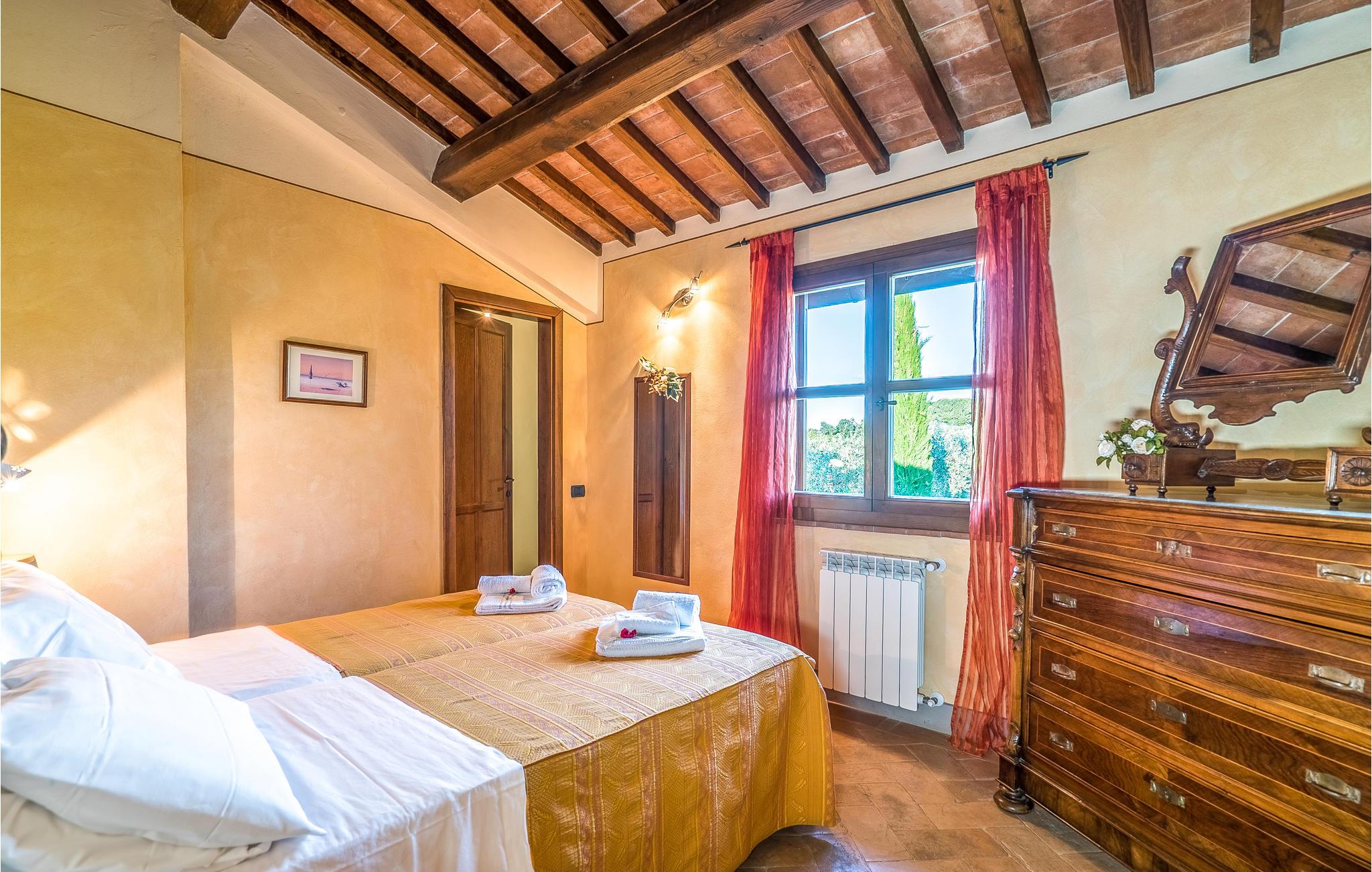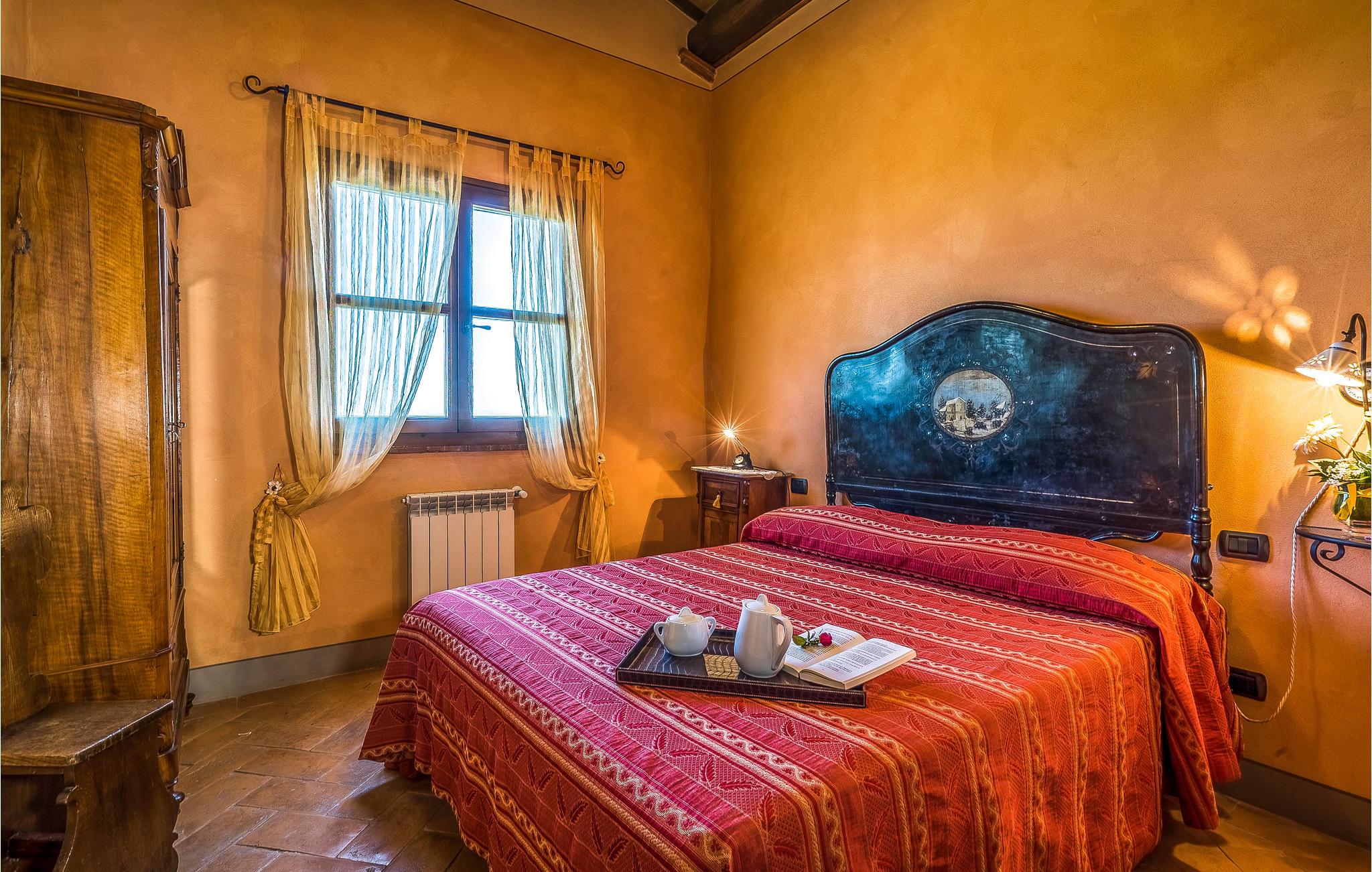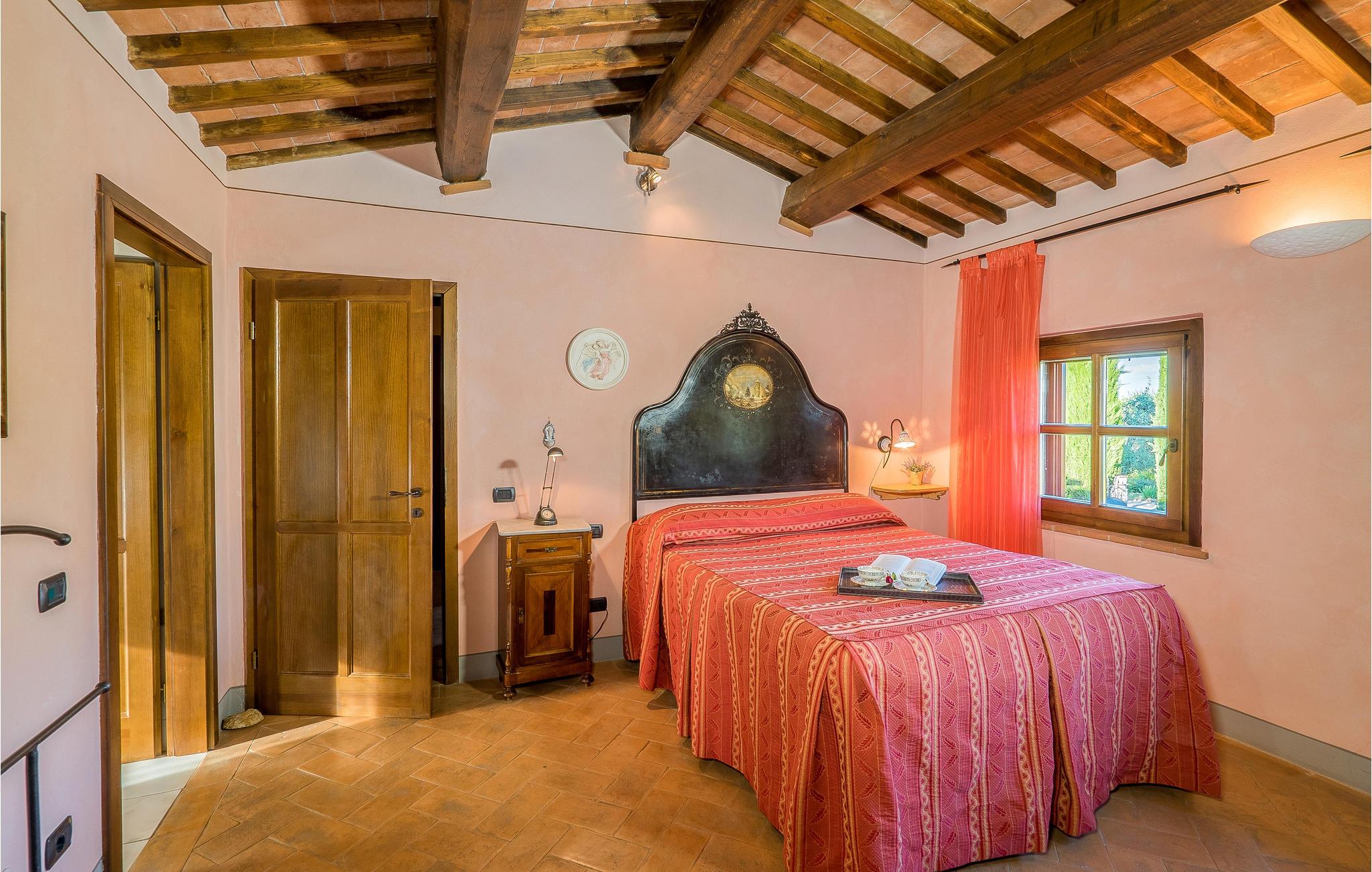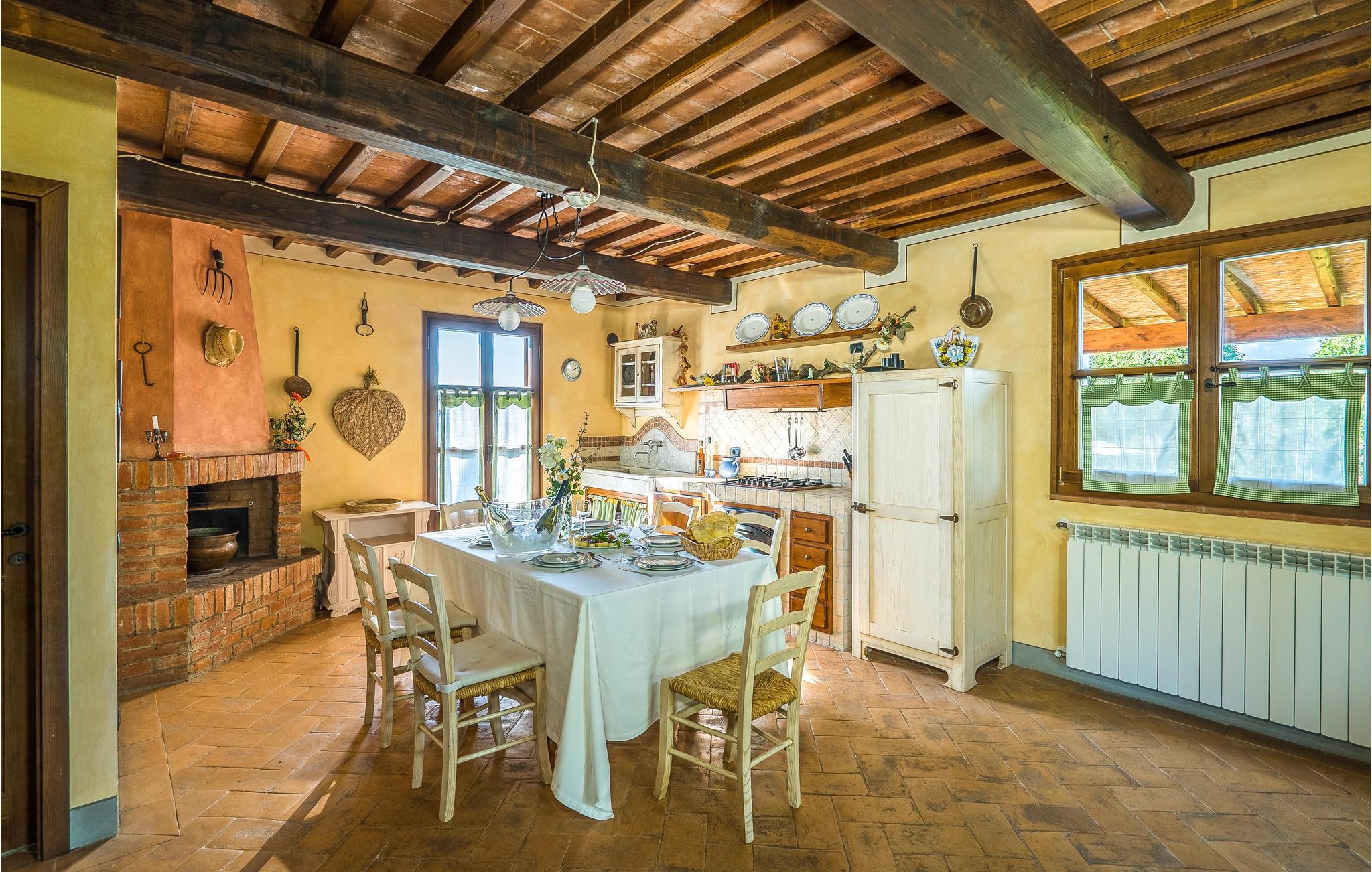 Dette rummelige feriehus er omgivet af bølgende bakker, hvilket har en skøn, beroligende ffekt. Begynd jeres dage med en forfriskende svømmetur i den private pool omgivet af grønne haver og nyd derefter morgenmaden på den skyggefulde terrasse, hvorfra I har en flot udsigt over det smukke landskab. Feriehusets stilfulde interiør med rustikke træbjælkelofter og traditionelle toscanske møbler lægger op til at læne sig tilbage og slappe af. Brug det rustikke køkken til at fremtrylle regionale delikatesser og nyd jeres måltider ved den hyggelige spiseplads eller udendørs under den overdækkede pavillon.