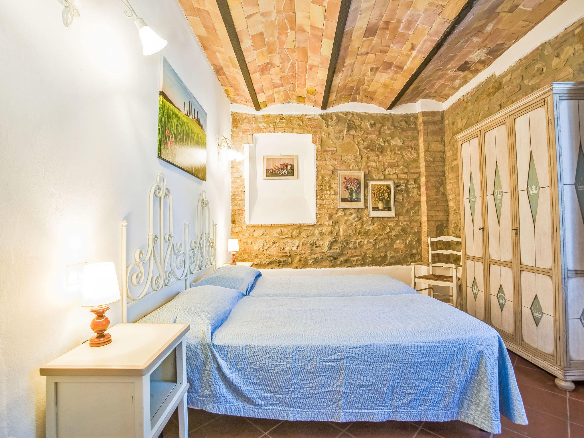 Montalcino: Country house "Podere San Giuseppe", renovated, surrounded by fields and vineyards. 6 apartments in the residence. 7.5 km from the centre of Buonconvento, 16 km from the centre of Montalcino, in a sunny position on top of a hill, in the countryside. For shared use: natural state property, swimming pool (8 x 16 m, depth 140 - 140 cm, seasonal availability: 01.Apr. - 30.Oct.). Children's pool, outdoor shower, terrace, pool maintenance by the owner/gardener. In the house: reception, WiFi, washing machine. Linen change (suppl. charge extra). Room cleaning on request (extra). Cook on request (extra). 3 km long bumpy motor access to the grounds. Parking on the premises. Shop 7.5 km, grocery 7.5 km, supermarket 7.5 km, restaurant 7.5 km, bus stop "Buonconvento" 7.5 km, railway station "Buonconvento" 7.5 km. Nearby attractions: Siena 35 km, Pienza 35 km, Montepulciano 50 km. Please note: baby equipment (included). Suitable for events. The photo is just an example. All houses/apartments are individually designed/furnished. Obligation to wear bathing caps.
