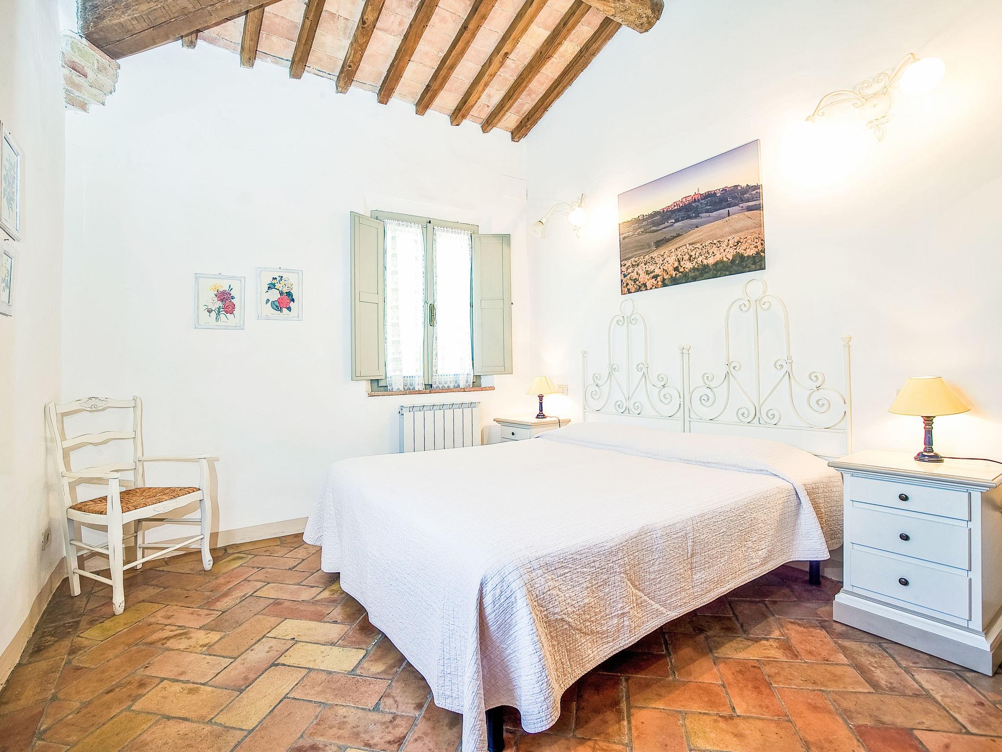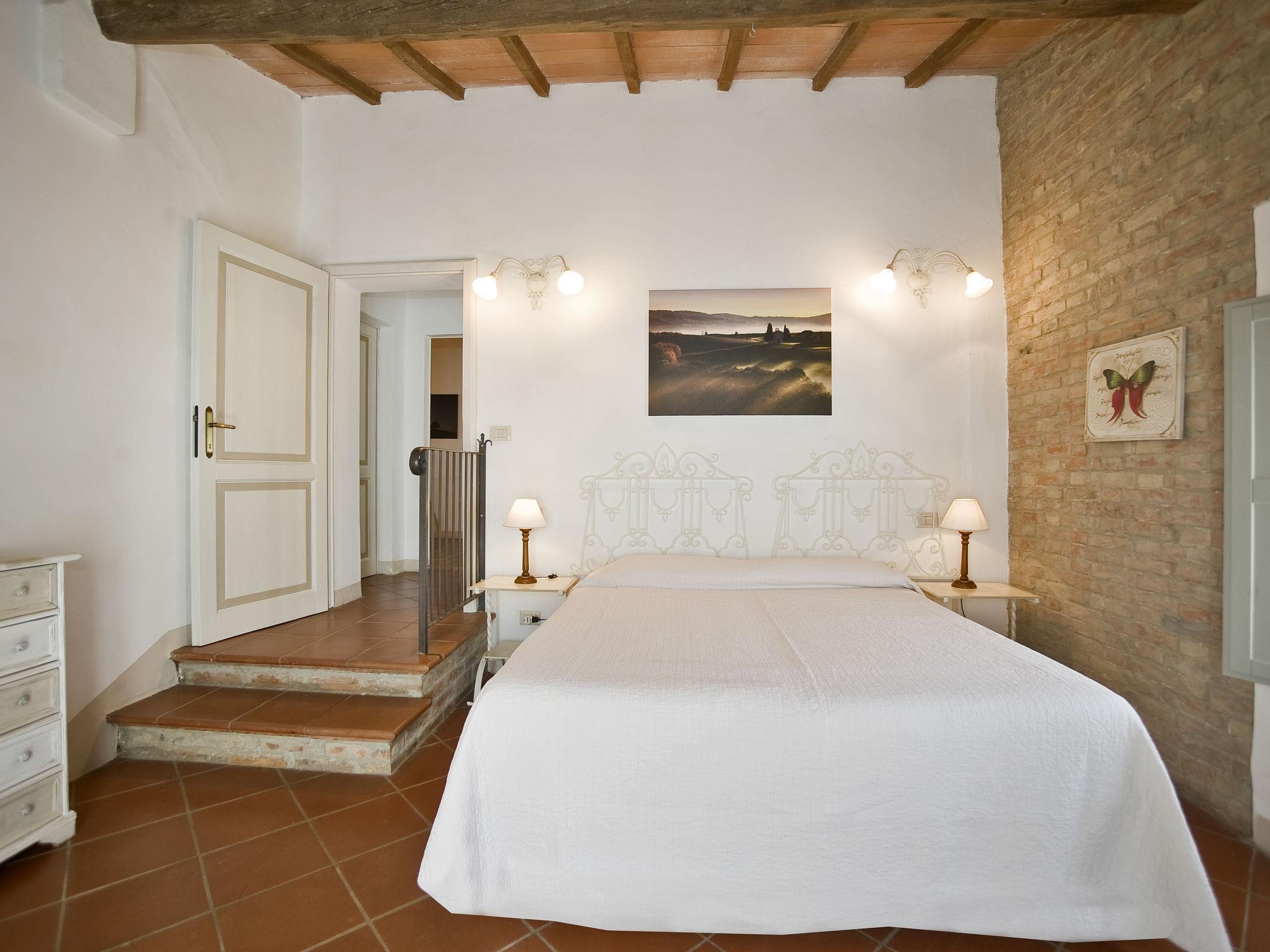 "Pienza", 3-room apartment 85 m2 on 1st floor. Renovated, tasteful furnishings: 2 double bedrooms, each room with shower/bidet/WC. Kitchen-/living room (dishwasher, 4 gas rings, kettle, electric coffee machine) with open-hearth fireplace. Heating. Patio. Very beautiful panoramic view of the countryside. Facilities: children's high chair, baby cot for up to 2 year olds, hair dryer. Internet (WiFi, free). Parking at the house. Please note: non-smokers only. Maximum 1 pet/ dog allowed. Private entrance, smoke alarm, fire extinguisher. IT052037B43S46MVTH