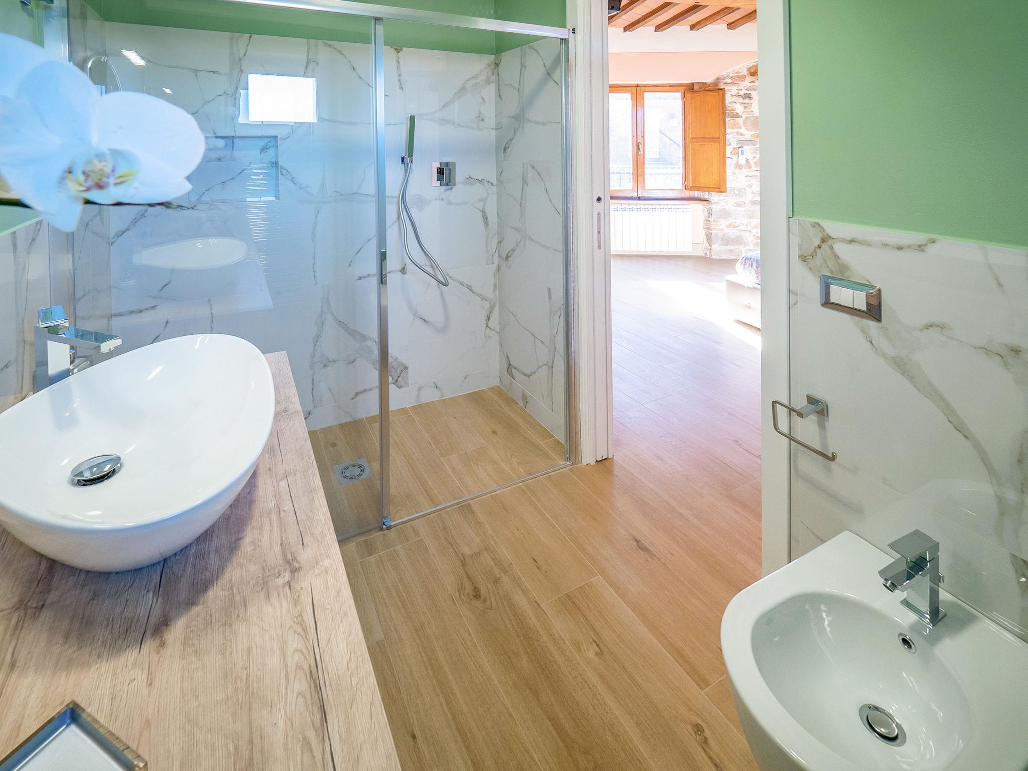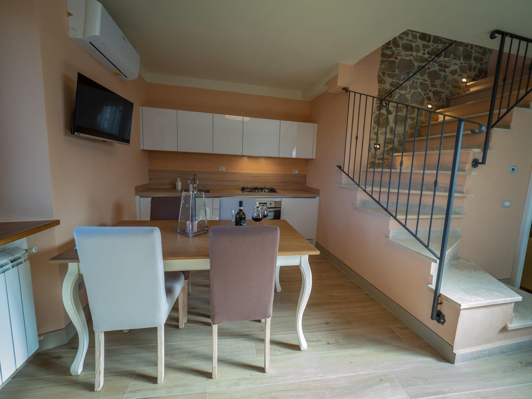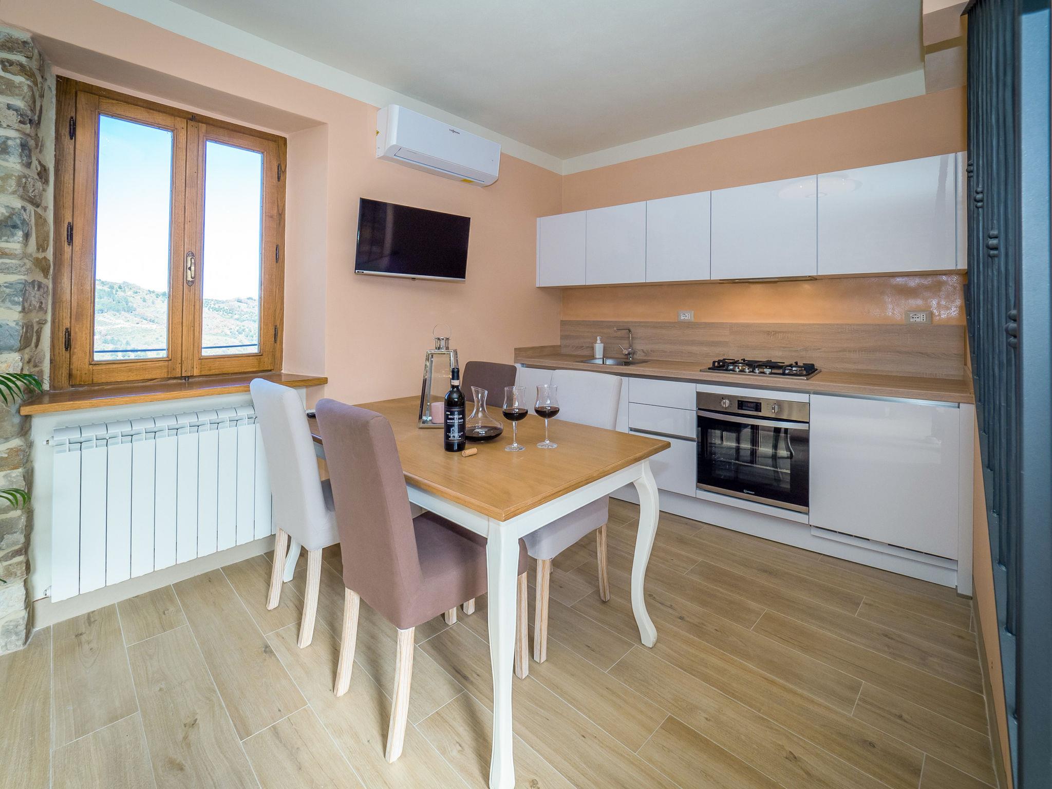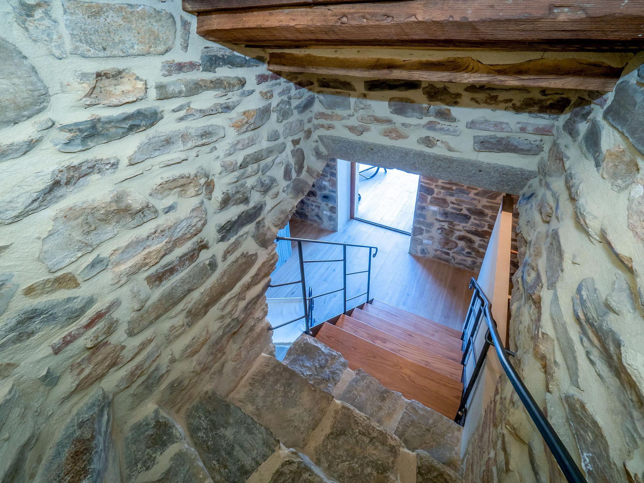 "La Suite del Benessere", 2-room house 70 m2 on 3 levels. Object suitable for 2 adults + 2 children. Fully renovated in 2019, very tasteful and stylish furnishings: living/sleeping room with 1 double sofabed (160 cm), satellite TV. Kitchenette (4 hot plates, oven, dishwasher, 4 gas rings, toaster, kettle, electric coffee machine) with dining table. On the lower ground floor: (steep stair) with shower/bidet/WC and hydro massage bath. Exit to the terrace. Upper floor: 1 open room with panoramic window with 1 french bed (160 cm), shower/bidet/WC. Electric heating, gas heating, air-conditioning. Natural stone floors. Terrace. Terrace furniture, barbecue, deck chairs. Marvellous view of the valley, the countryside and the forest. Facilities: washing machine, safe, children's high chair, baby cot for up to 2 year olds, hair dryer. Internet (WiFi, free). Please note: non-smokers only. Smoke alarm, fire extinguisher. A natural stone staircase leads down from the living room to the wellness area with a large hydro massage bath in the natural stone vaulted cellar of the house. No mandatory extra charges to be paid on-site except for local tax. IT053025C28GWESZXY