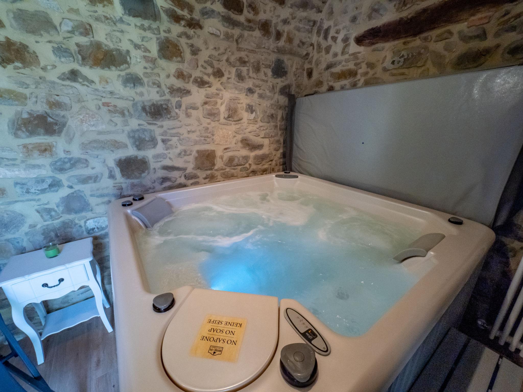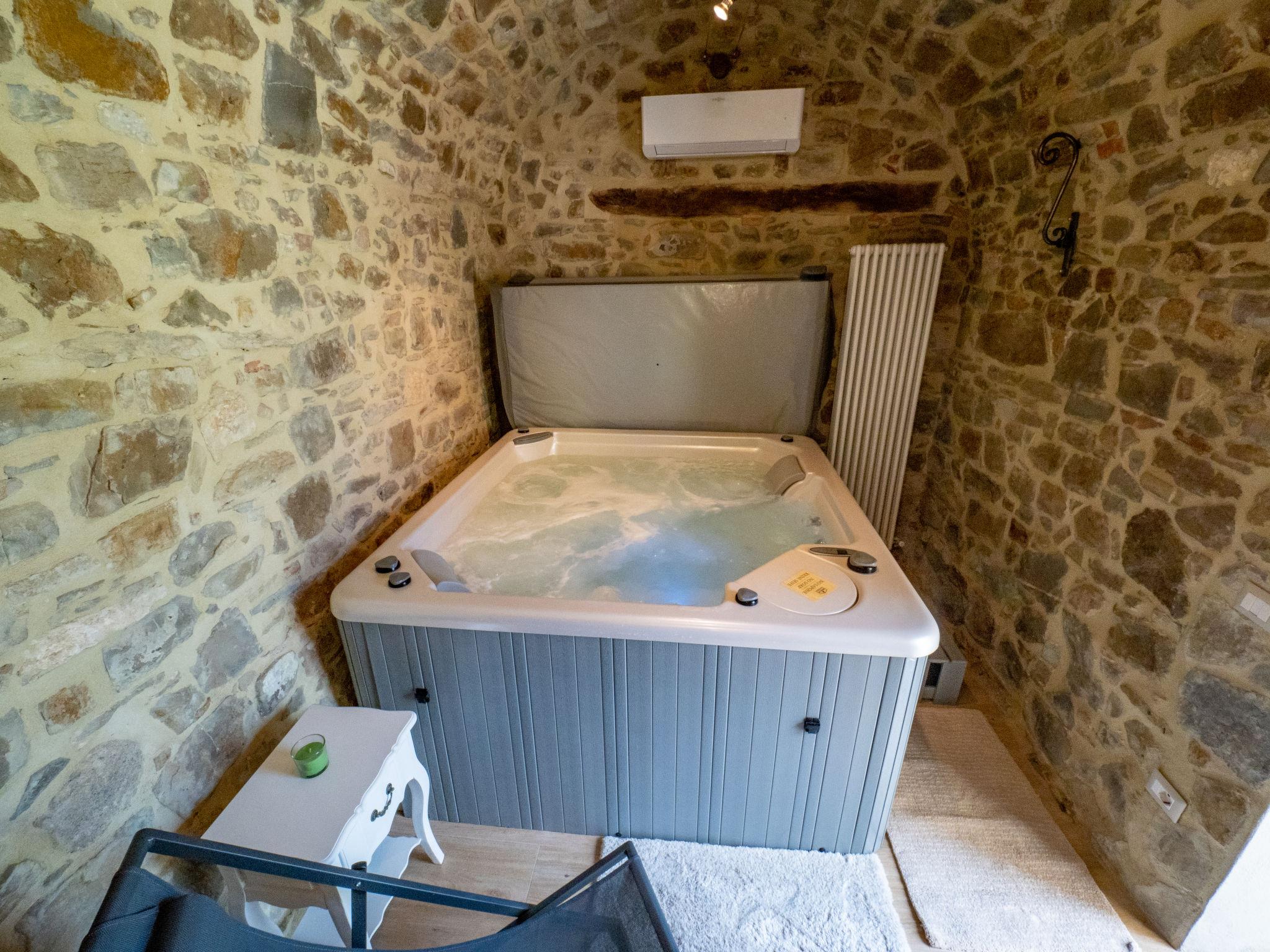 Seggiano 23 km from Montalcino: Very beautiful, cosy, comfortable house "La Suite del Benessere", renovated in 2019. In the centre of Seggiano 23 km from the centre of Montalcino, 65 km from the centre of Siena / Grosseto, in a central, elevated position on a slope, excellent location: right in the centre but still quiet. Private: small terraced garden, 25 m2 (fenced) with lawn. Shower/WC in the pool area, hot tub, terrace, barbecue. In the house: hot tub (all included), spa area. Parking at the house. Shop, grocery 500 m, supermarket 23 km, restaurant, bar 50 m, bakery 200 m, 1 minute walk to the centre, bus stop 240 m. Nearby attractions: Monte Amiata 10 km, Bagno Vignoni 19 km, San Quirico d'Orcia 23 km. Please note: baby equipment (included). Object suitable for 2 adults + 2 children.