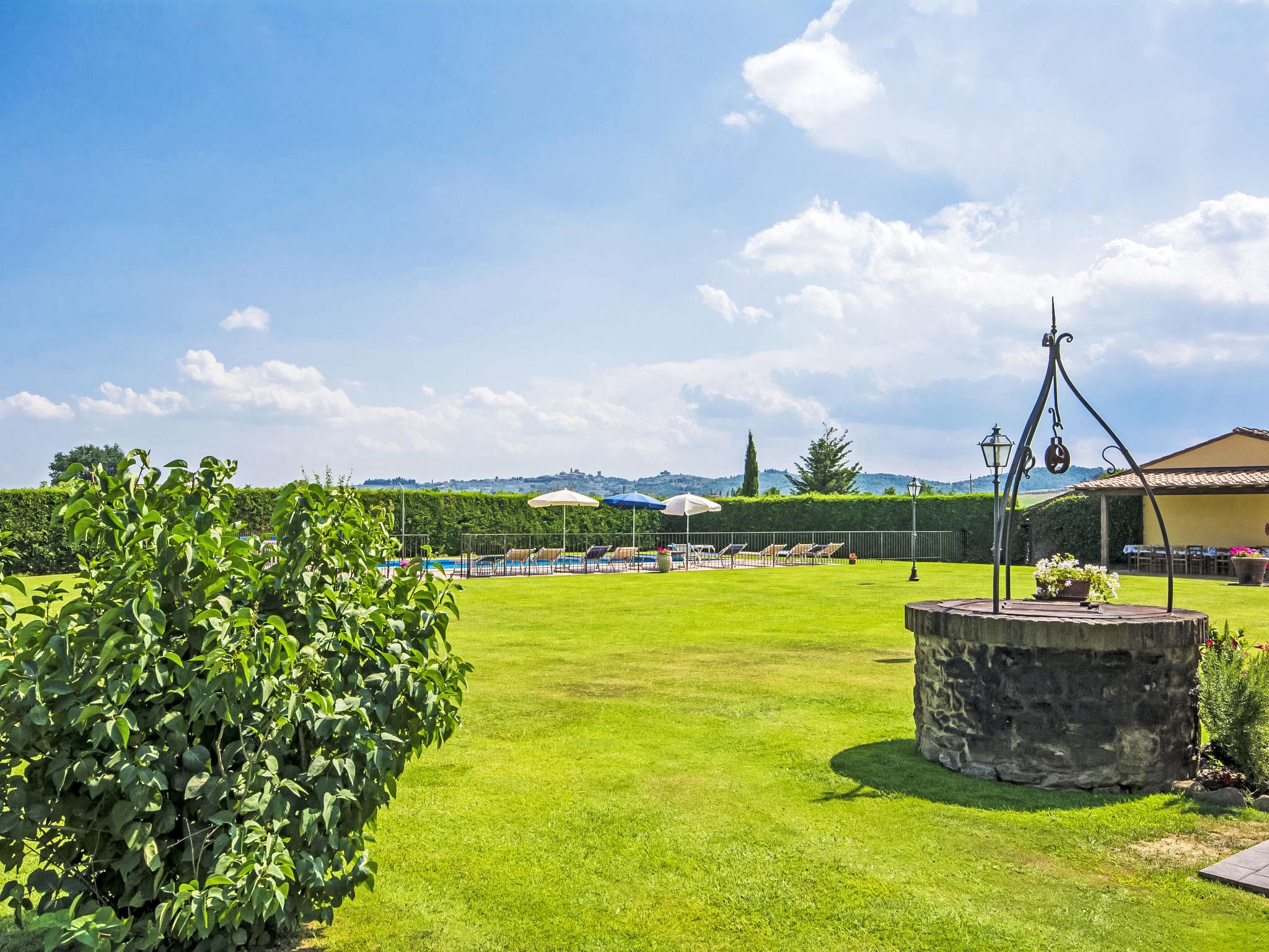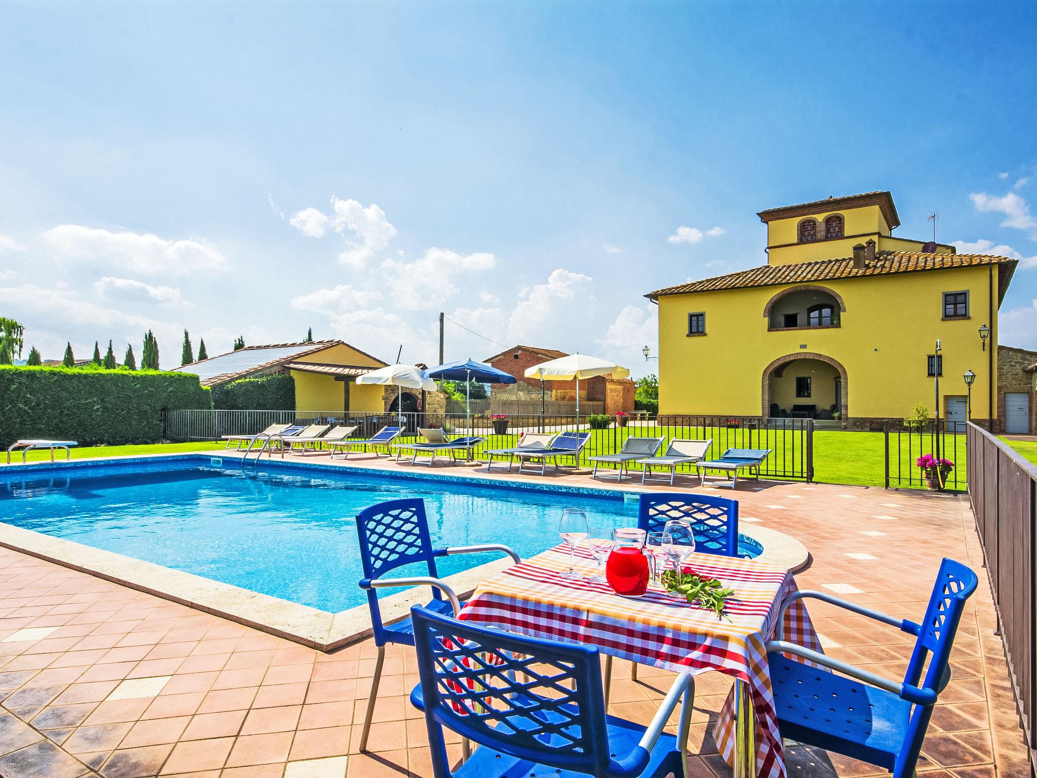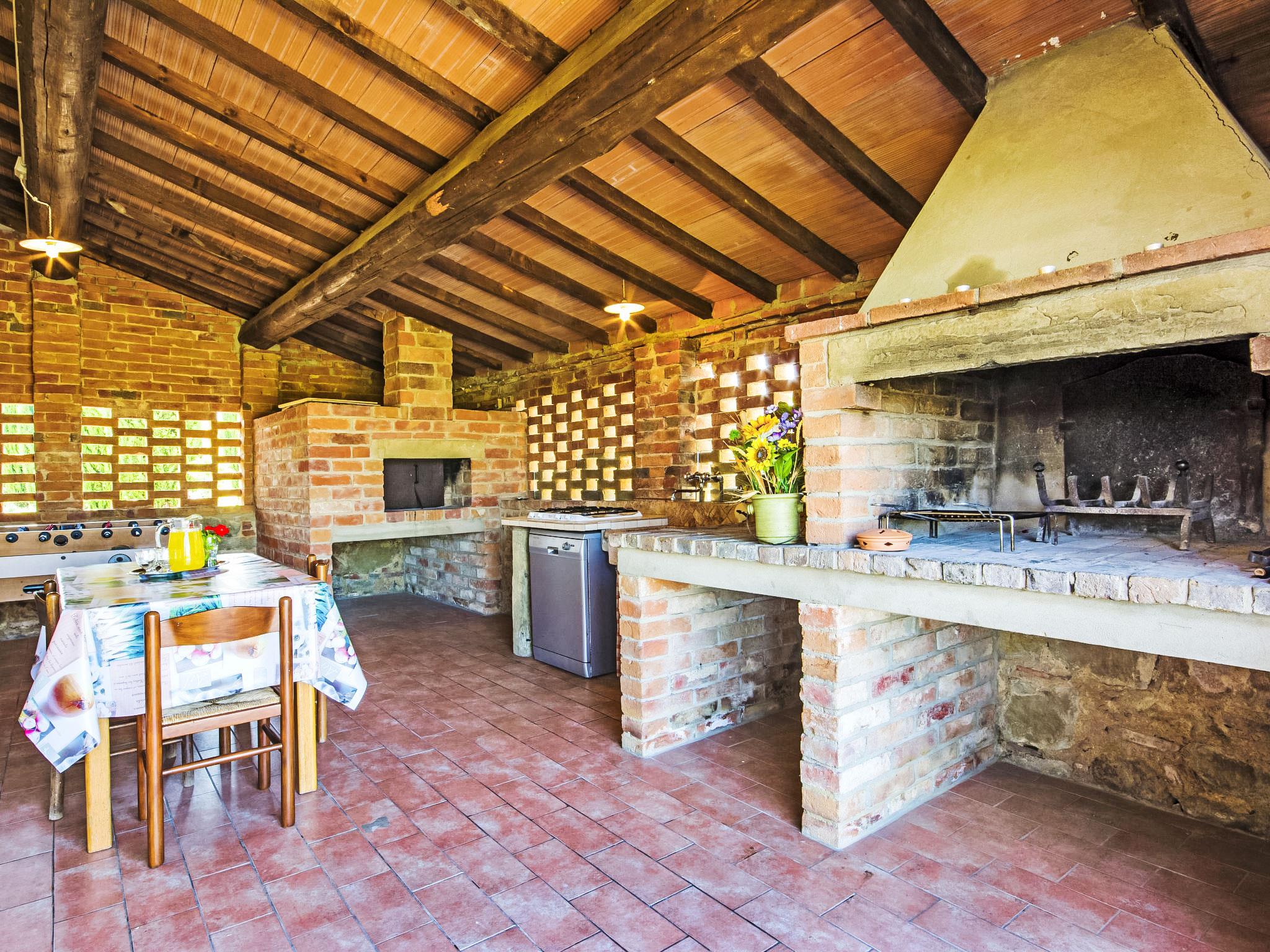 Farm house with characteristic pigeon-loft, beautifully renovated, with large outdoor areas provided with wood burning oven, r and gazebo, under the porch there are barbecue, pizza oven, dishwasher working top for eating al fresco near the swimming pool. It is surrounded by many sunflower fields. The property has automatic gates and offers total privacy beccaue the annex next to it is not for residential use. The interiors are evocative of a period house with a spacious living room with fireplace, big dining table, terracotta floorings, high beamed ceilings. The house is approx 2 km from the motorway access (800 m flying distance) which makes it ideal for visiting the most important towns in Tuscany. Very large, beautiful, comfortable villa, built in 1814, renovated, surrounded by meadows. 3 km from the centre of Monte San Savino, 7 km from the centre of Lucignano, 80 km from the centre of Firenze, in a sunny position, in the countryside. Private: property 6 ha, garden 2'000 m2 (fenced) with lawn, swimming pool fenced (6 x 12 m, depth 120 - 230 cm, seasonal availability: 18.May. - 05.Oct.) with internal staircase. Outdoor shower, table tennis, arbour, garden furniture, barbecue, children's playground (slide). In the house: table tennis, central heating system, washing machine, heating to be paid on the spot, heating available only from 01.Nov. - 07.Apr.. Room cleaning on request (extra). Cook on request (extra). Parking. Supermarket 3 km, shopping centre 12 km, bus stop 4 km, railway station "Monte San Savino" 3 km, thermal baths "Serre di Rapolano" 34 km. Riding stable 12 km. Nearby attractions: Arezzo 12 km, Montepulciano 33 km, Pienza 39 km, Siena 40 km, Cortona 42 km, Montalcino 46 km. Suitable for events.