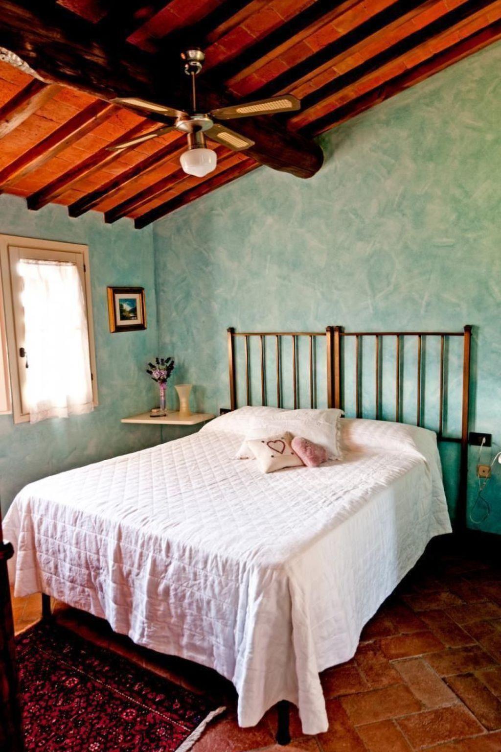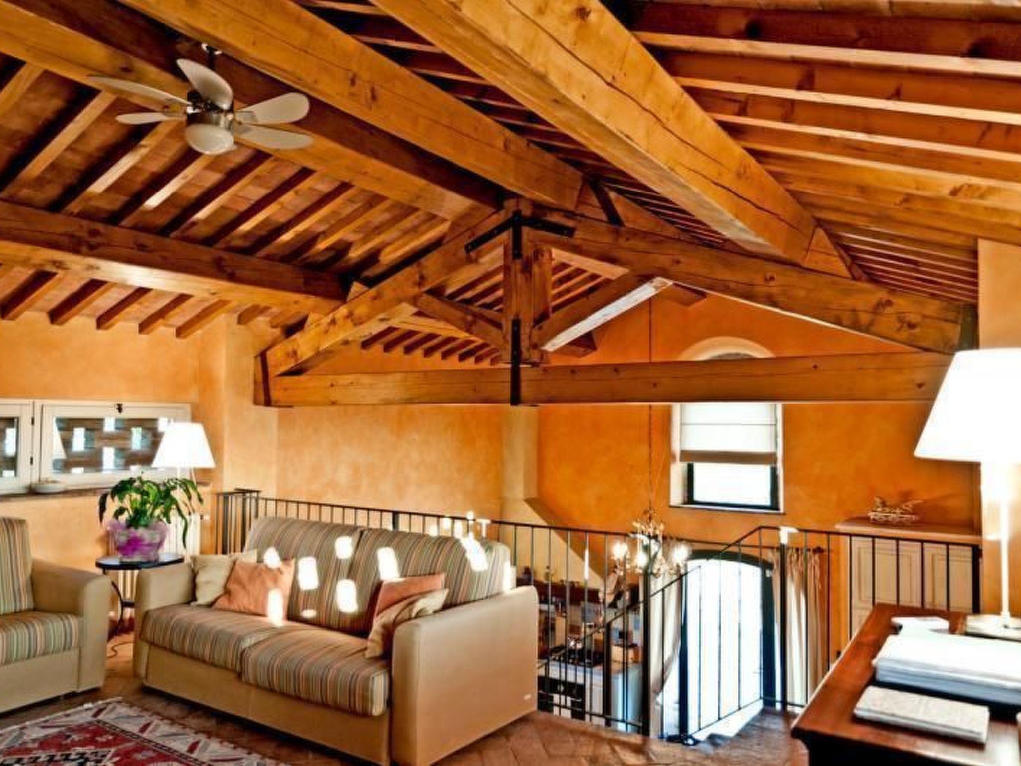 It can accommodate up to six people and consists of a bright, colourful and fully equipped kitchen with modern conveniences, two double bedrooms with original antique wrought-iron beds and two bathrooms with shower cubicles. On the upper floor there is a delightful loft with a fireplace, used as a living room with two sofas (one of these is a sofa-bed for two people) and furnished again in typical Tuscan style with an antique and original 19th century chest of drawers, satellite TV, DVD, stereo with CD player, free internet connection, books and magazines, and a basket of wood for the fireplace.