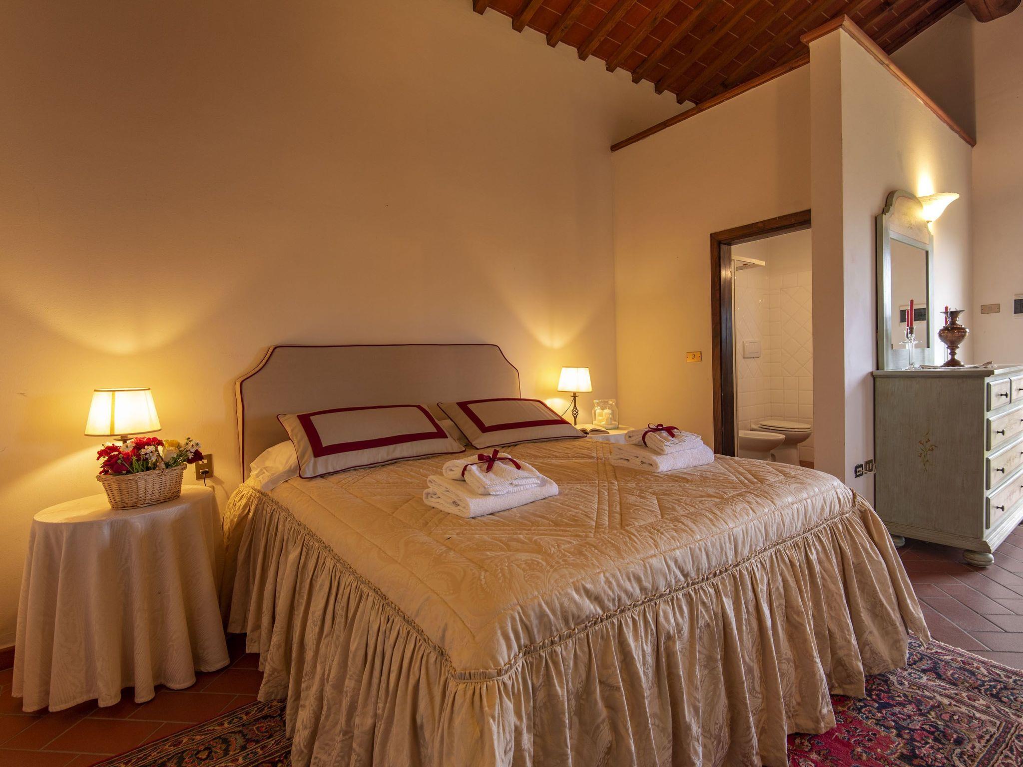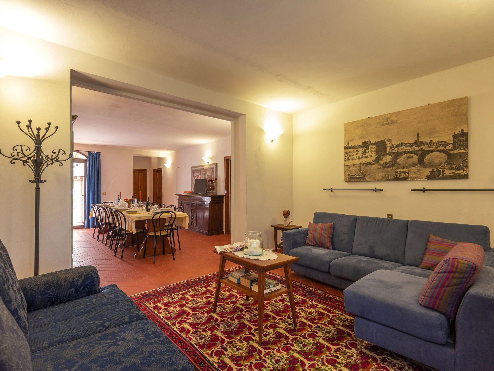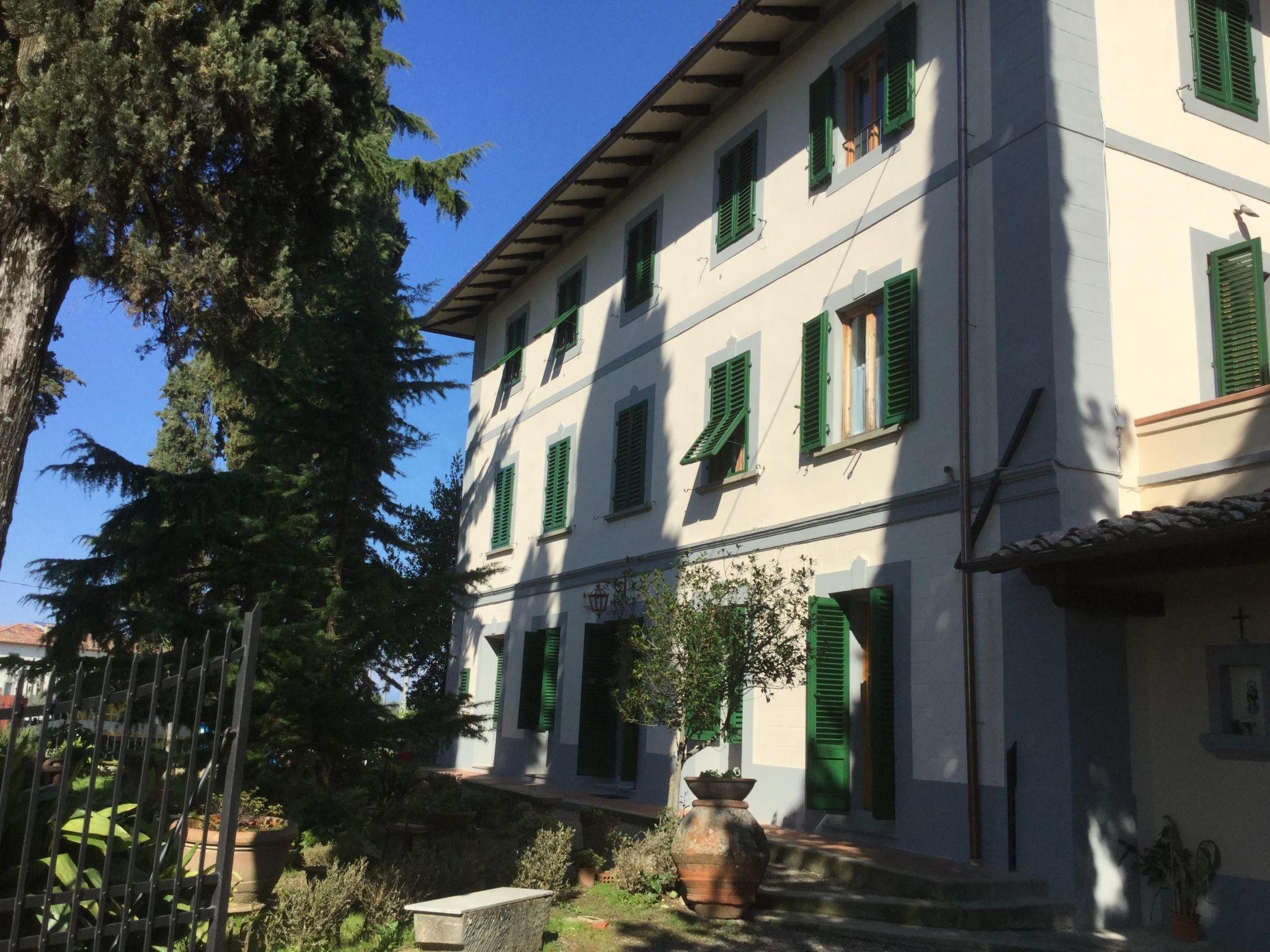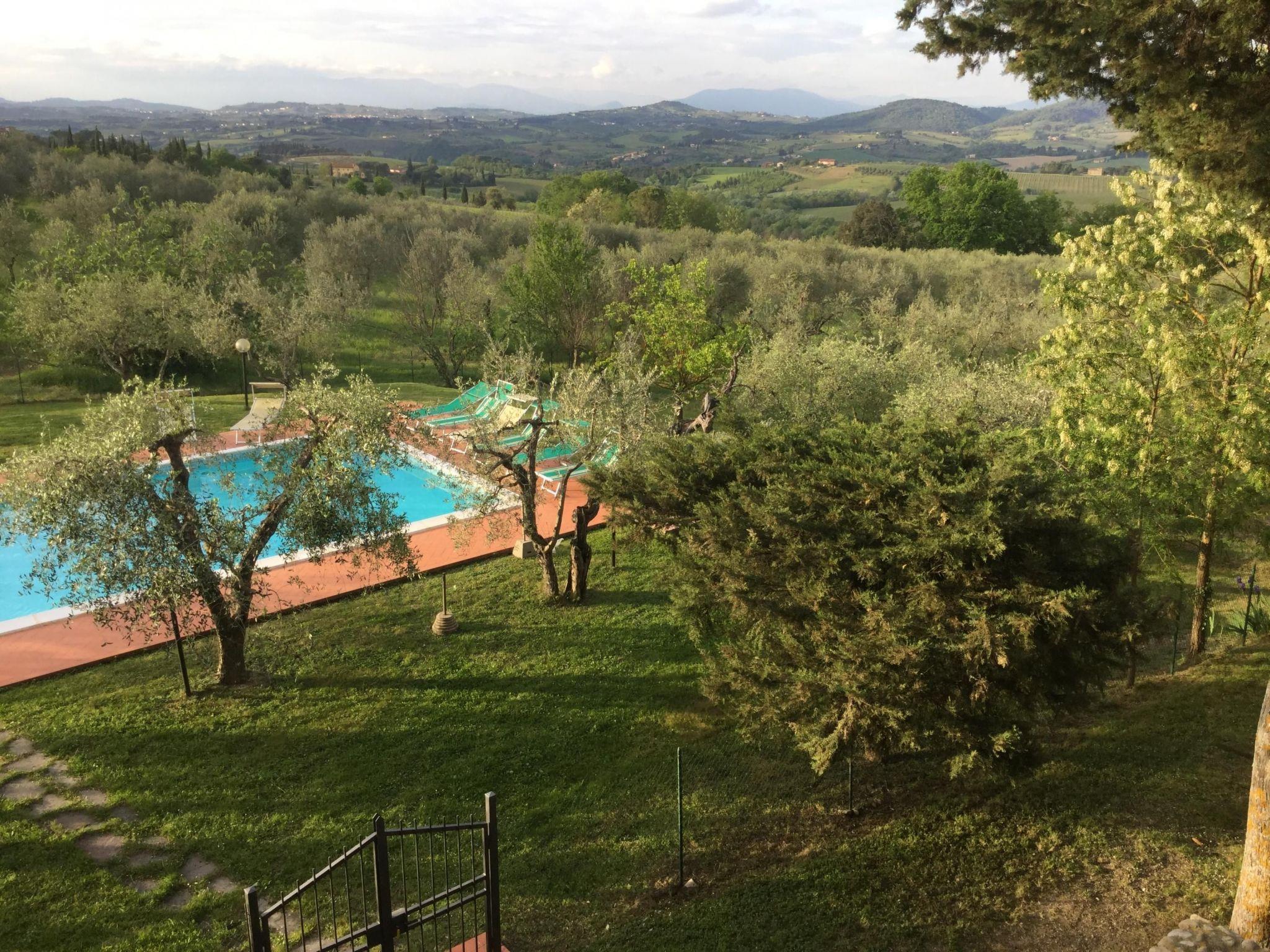 Surrounded by olive groves and vineyards, the villa that sleeps 21 is situated in the Chianti countryside in a panoramic position on the top of a hill from which a wonderful view of the Tuscan countryside stretches as far as the eye can see. Built in the 19th century as the manor house of a large agricultural property, it is located in Montespertoli, a hamlet of Montegufoni about halfway between Florence and Siena in a very quiet and traffic-free location. There are five flats, one of which is on the second floor of the villa and enjoys a splendid view. Three other flats are located in a building adjoining the villa on the ground, first and second floors respectively; the last is an annexe within the garden. Each of the flats has a kitchen/living room with satellite TV, several bedrooms and bathrooms. On the second floor there are three double bedrooms and two bathrooms with shower and bidet. On the first floor there are two double bedrooms and one twin-bedded room and two bathrooms with shower and bidet. On the ground floor there are three double bedrooms, one twin-bedded room and four bathrooms with shower and bidet. On this floor, all on the same level and with no steps and a wheelchair-accessible bathroom, there is a large kitchen complete with electric oven, microwave, gas hob, coffee machine dishwasher and washing machine generally used for cooking for all the members of the group and a dining room for eating inside when the weather does not permit the use of the large garden for outdoor meals. All rooms are equipped with heating and air conditioning and each flat has free internet access. The property is surrounded by a garden with a barbecue and is completely fenced in; there are two large gazeboes equipped with tables and chairs. The pool is also equipped with sun umbrellas and 10 sun loungers and is completely fenced off and accessible through a gate, so it is also safe for children. The villa is surrounded by numerous scenic routes of great beauty for long excursions on foot or by bicycle through the rolling Tuscan hills. There are also tennis courts and two riding stables near the villa. Situated about 20 kilometres from the centre of Florence, it is also an excellent starting point for day trips to Volterra, Vinci, Certaldo San Gimignano, Siena, Lucca and Pisa. Just 900 metres away is the village of Montagnana with post office, bank, bar, pizzeria and a renowned restaurant where you can enjoy "la bistecca alla fiorentina".