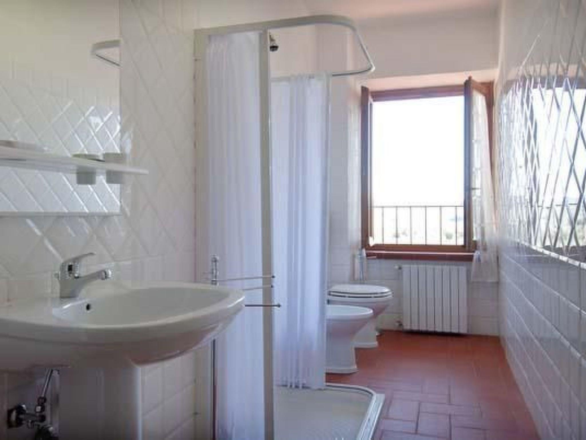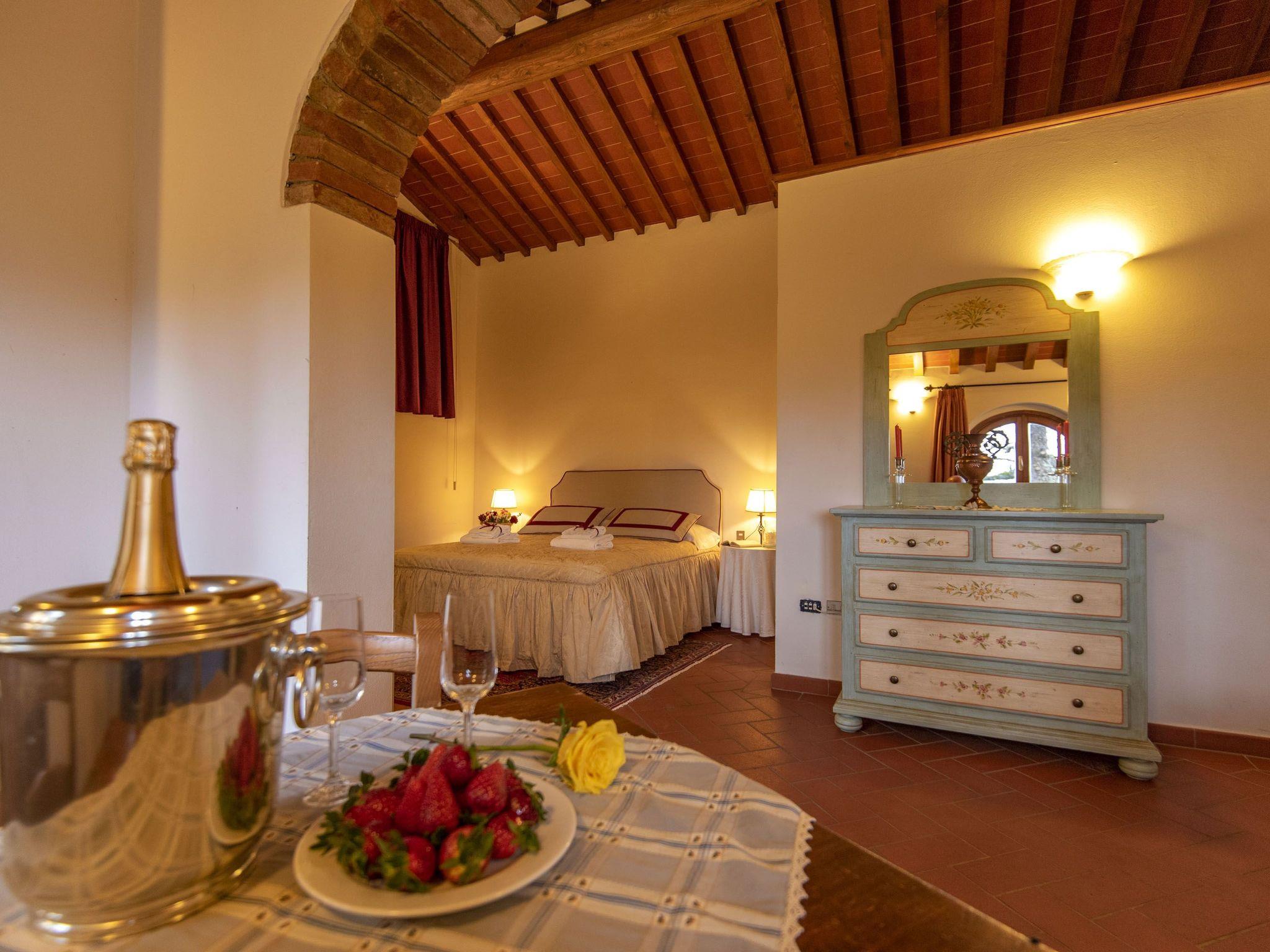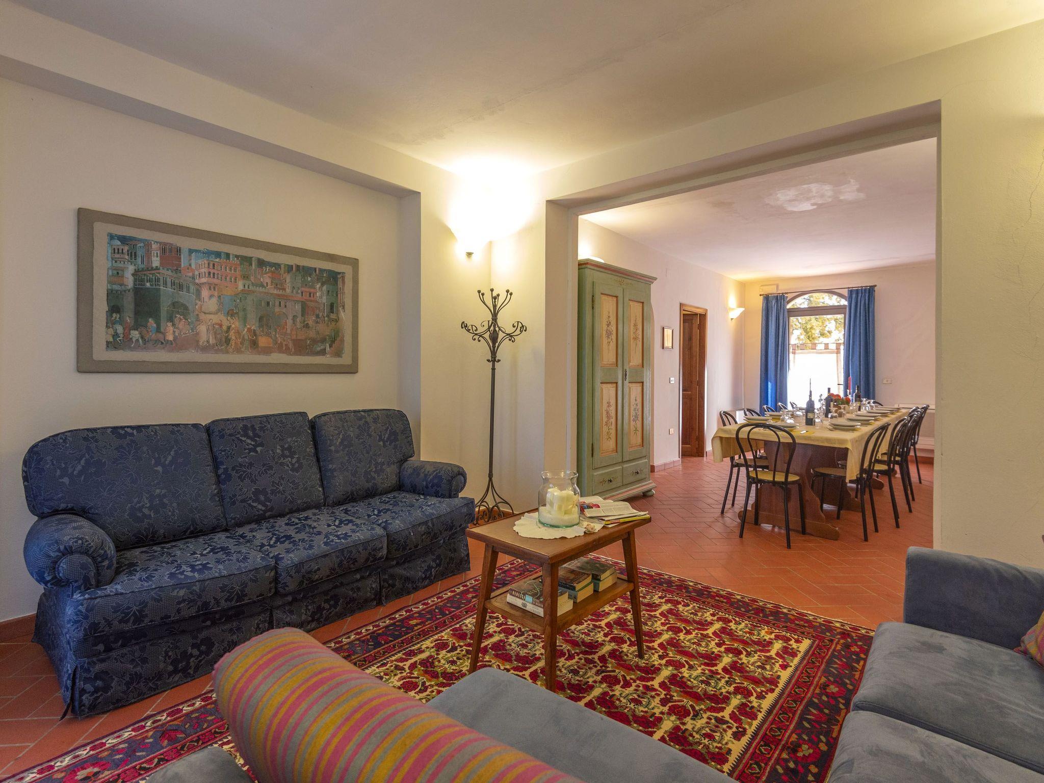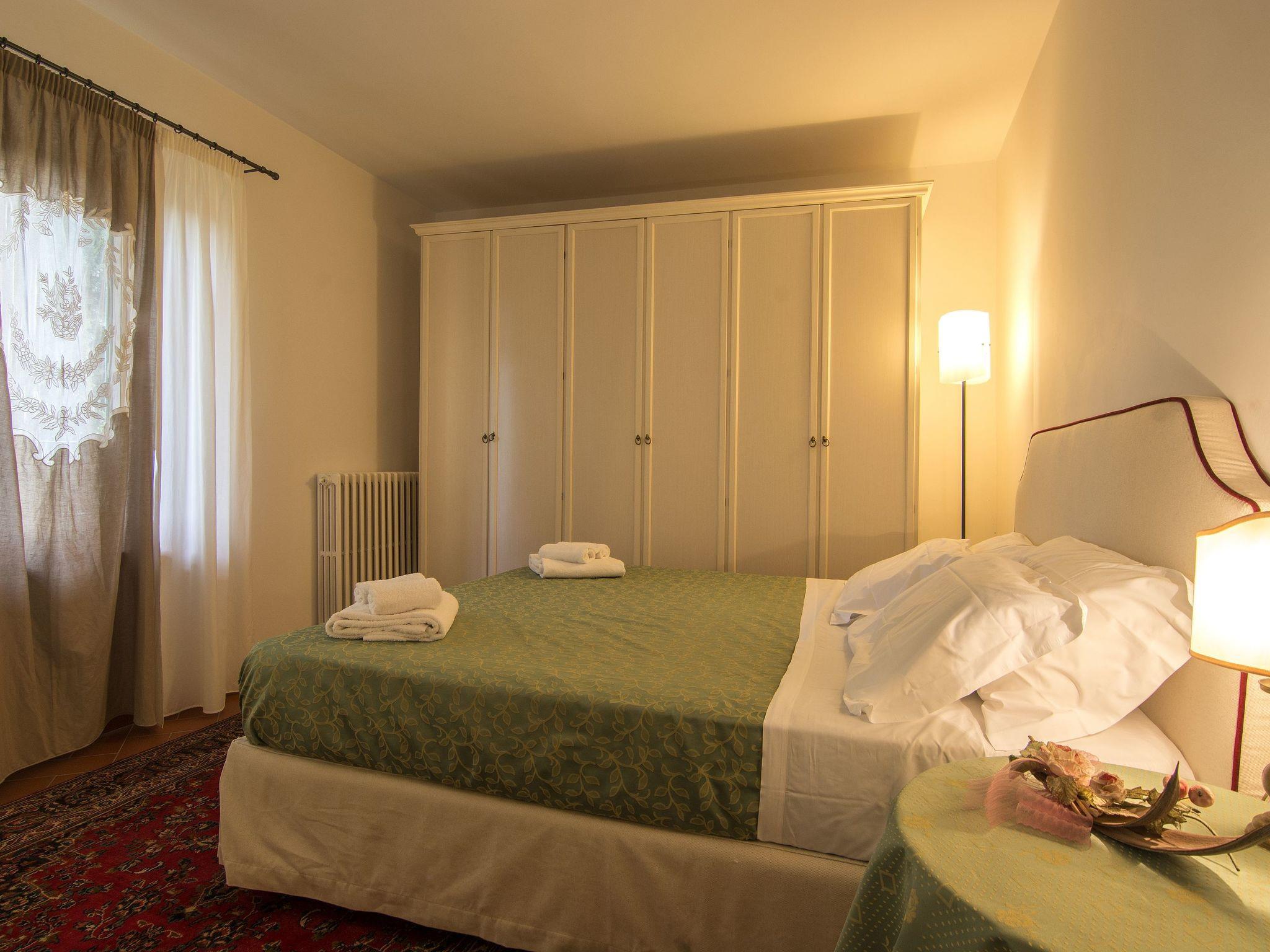 Surrounded by olive groves and vineyards, the villa that sleeps 21 is situated in the Chianti countryside in a panoramic position on the top of a hill from which a wonderful view of the Tuscan countryside stretches as far as the eye can see. Built in the 19th century as the manor house of a large agricultural property, it is located in Montespertoli, a hamlet of Montegufoni about halfway between Florence and Siena in a very quiet and traffic-free location. There are five flats, one of which is on the second floor of the villa and enjoys a splendid view. Three other flats are located in a building adjoining the villa on the ground, first and second floors respectively; the last is an annexe within the garden. Each of the flats has a kitchen/living room with satellite TV, several bedrooms and bathrooms. On the second floor there are three double bedrooms and two bathrooms with shower and bidet. On the first floor there are two double bedrooms and one twin-bedded room and two bathrooms with shower and bidet. On the ground floor there are three double bedrooms, one twin-bedded room and four bathrooms with shower and bidet. On this floor, all on the same level and with no steps and a wheelchair-accessible bathroom, there is a large kitchen complete with electric oven, microwave, gas hob, coffee machine dishwasher and washing machine generally used for cooking for all the members of the group and a dining room for eating inside when the weather does not permit the use of the large garden for outdoor meals. All rooms are equipped with heating and air conditioning and each flat has free internet access. The property is surrounded by a garden with a barbecue and is completely fenced in; there are two large gazeboes equipped with tables and chairs. The pool is also equipped with sun umbrellas and 10 sun loungers and is completely fenced off and accessible through a gate, so it is also safe for children. The villa is surrounded by numerous scenic routes of great beauty for long excursions on foot or by bicycle through the rolling Tuscan hills. There are also tennis courts and two riding stables near the villa. Situated about 20 kilometres from the centre of Florence, it is also an excellent starting point for day trips to Volterra, Vinci, Certaldo San Gimignano, Siena, Lucca and Pisa. Just 900 metres away is the village of Montagnana with post office, bank, bar, pizzeria and a renowned restaurant where you can enjoy "la bistecca alla fiorentina".