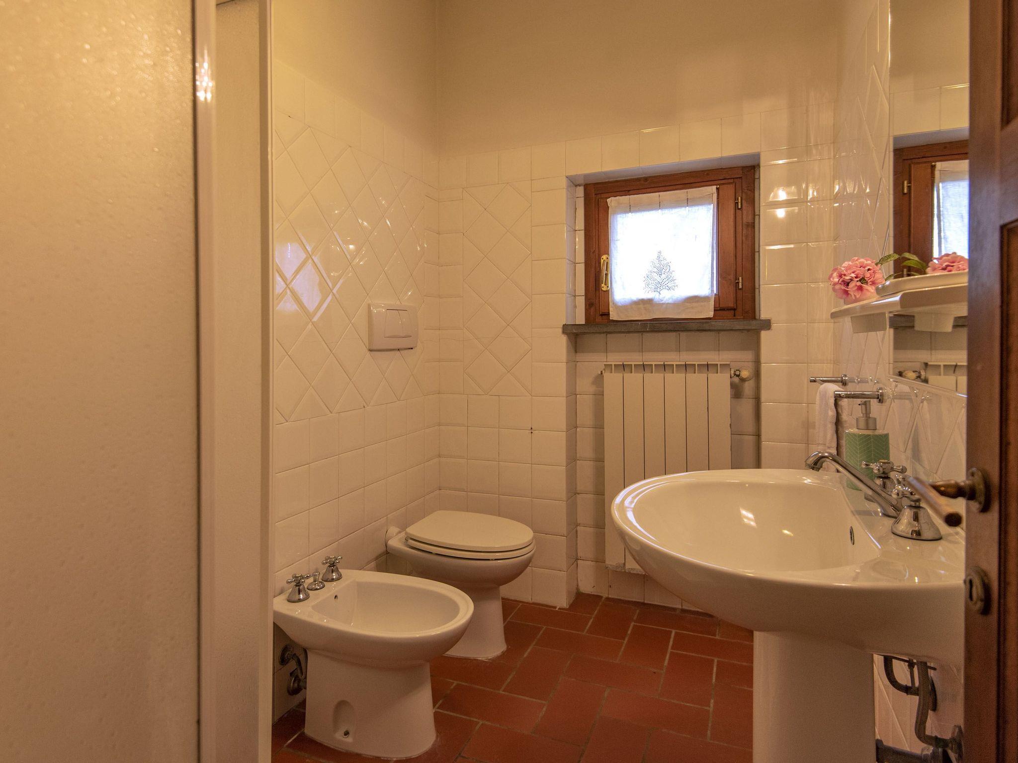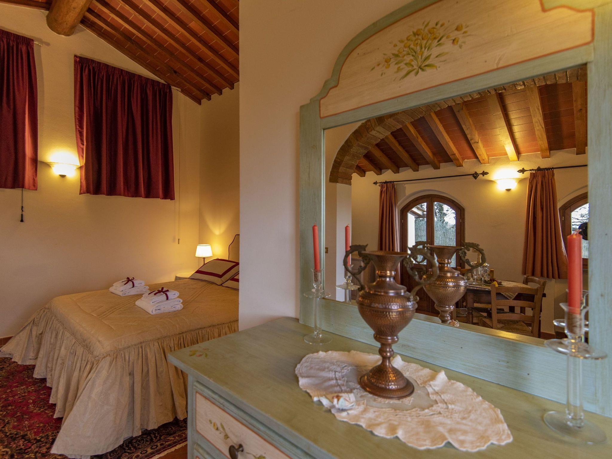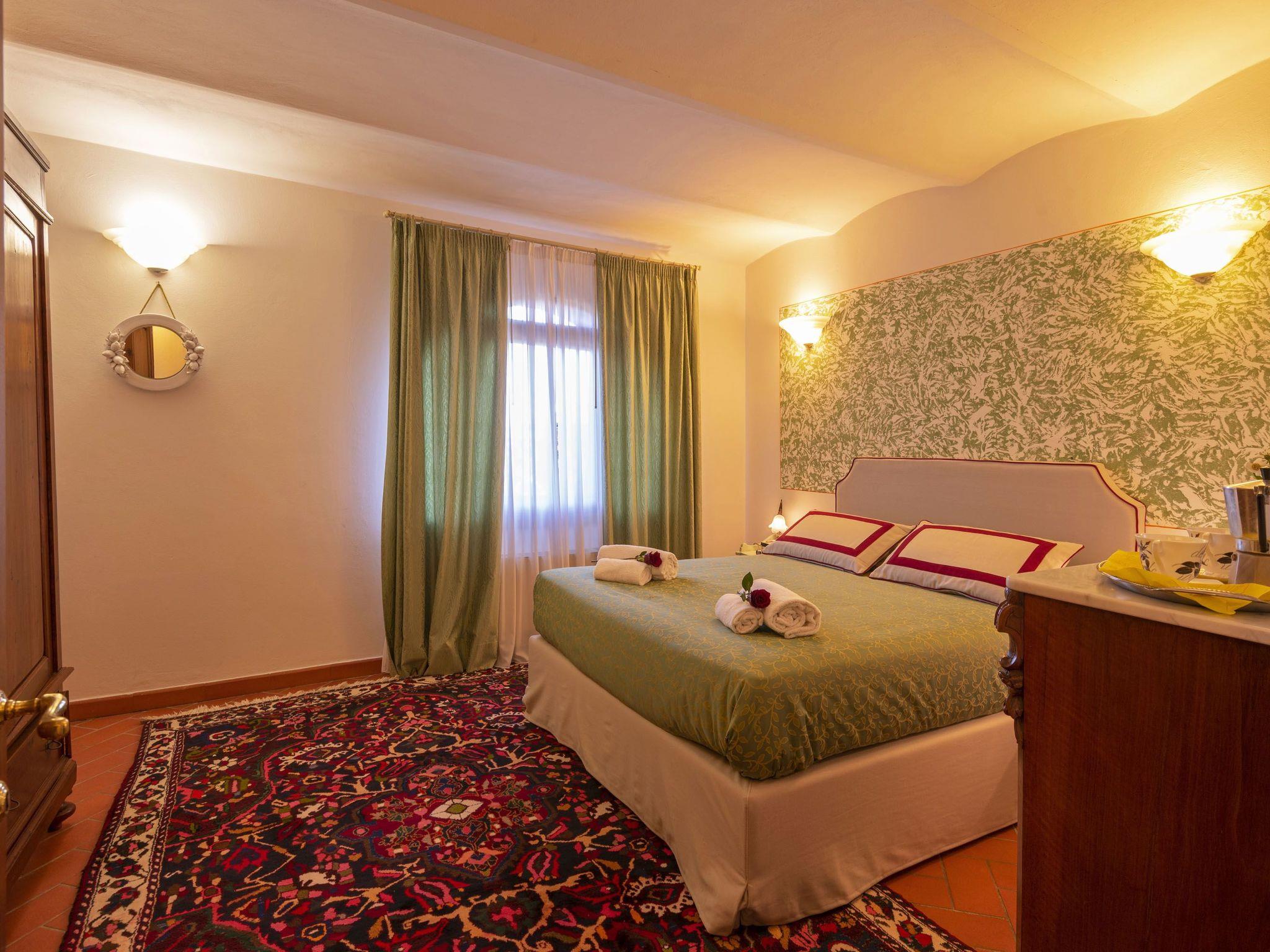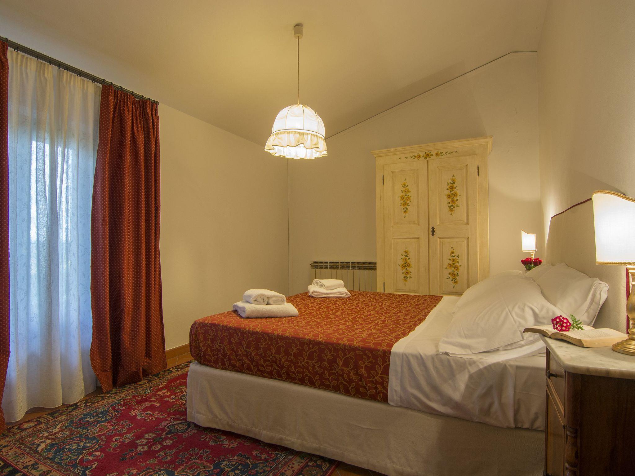 Surrounded by olive groves and vineyards, the villa that sleeps 21 is situated in the Chianti countryside in a panoramic position on the top of a hill from which a wonderful view of the Tuscan countryside stretches as far as the eye can see. Built in the 19th century as the manor house of a large agricultural property, it is located in Montespertoli, a hamlet of Montegufoni about halfway between Florence and Siena in a very quiet and traffic-free location. There are five flats, one of which is on the second floor of the villa and enjoys a splendid view. Three other flats are located in a building adjoining the villa on the ground, first and second floors respectively; the last is an annexe within the garden. Each of the flats has a kitchen/living room with satellite TV, several bedrooms and bathrooms. On the second floor there are three double bedrooms and two bathrooms with shower and bidet. On the first floor there are two double bedrooms and one twin-bedded room and two bathrooms with shower and bidet. On the ground floor there are three double bedrooms, one twin-bedded room and four bathrooms with shower and bidet. On this floor, all on the same level and with no steps and a wheelchair-accessible bathroom, there is a large kitchen complete with electric oven, microwave, gas hob, coffee machine dishwasher and washing machine generally used for cooking for all the members of the group and a dining room for eating inside when the weather does not permit the use of the large garden for outdoor meals. All rooms are equipped with heating and air conditioning and each flat has free internet access. The property is surrounded by a garden with a barbecue and is completely fenced in; there are two large gazeboes equipped with tables and chairs. The pool is also equipped with sun umbrellas and 10 sun loungers and is completely fenced off and accessible through a gate, so it is also safe for children. The villa is surrounded by numerous scenic routes of great beauty for long excursions on foot or by bicycle through the rolling Tuscan hills. There are also tennis courts and two riding stables near the villa. Situated about 20 kilometres from the centre of Florence, it is also an excellent starting point for day trips to Volterra, Vinci, Certaldo San Gimignano, Siena, Lucca and Pisa. Just 900 metres away is the village of Montagnana with post office, bank, bar, pizzeria and a renowned restaurant where you can enjoy "la bistecca alla fiorentina".